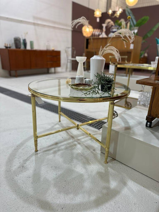 Vintage ronde salontafel, bijzettafel - glas, messing jaren '70 | 00981