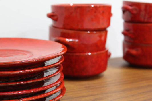 Vintage soepkommen en bordjes, servies - rood | 00922