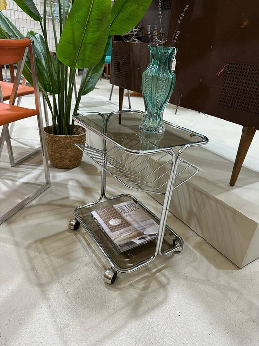 Vintage bijzettafel, trolley, lectuurmand - Jaren '80, chroom
