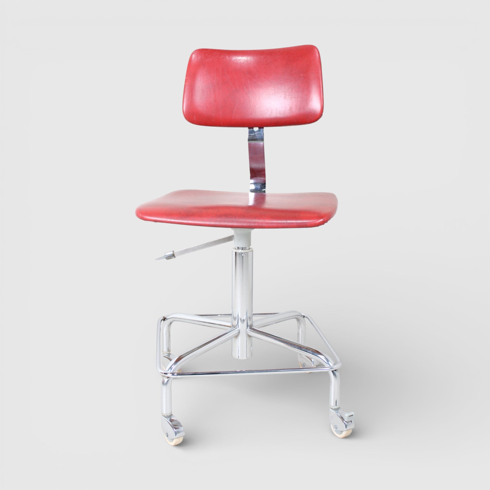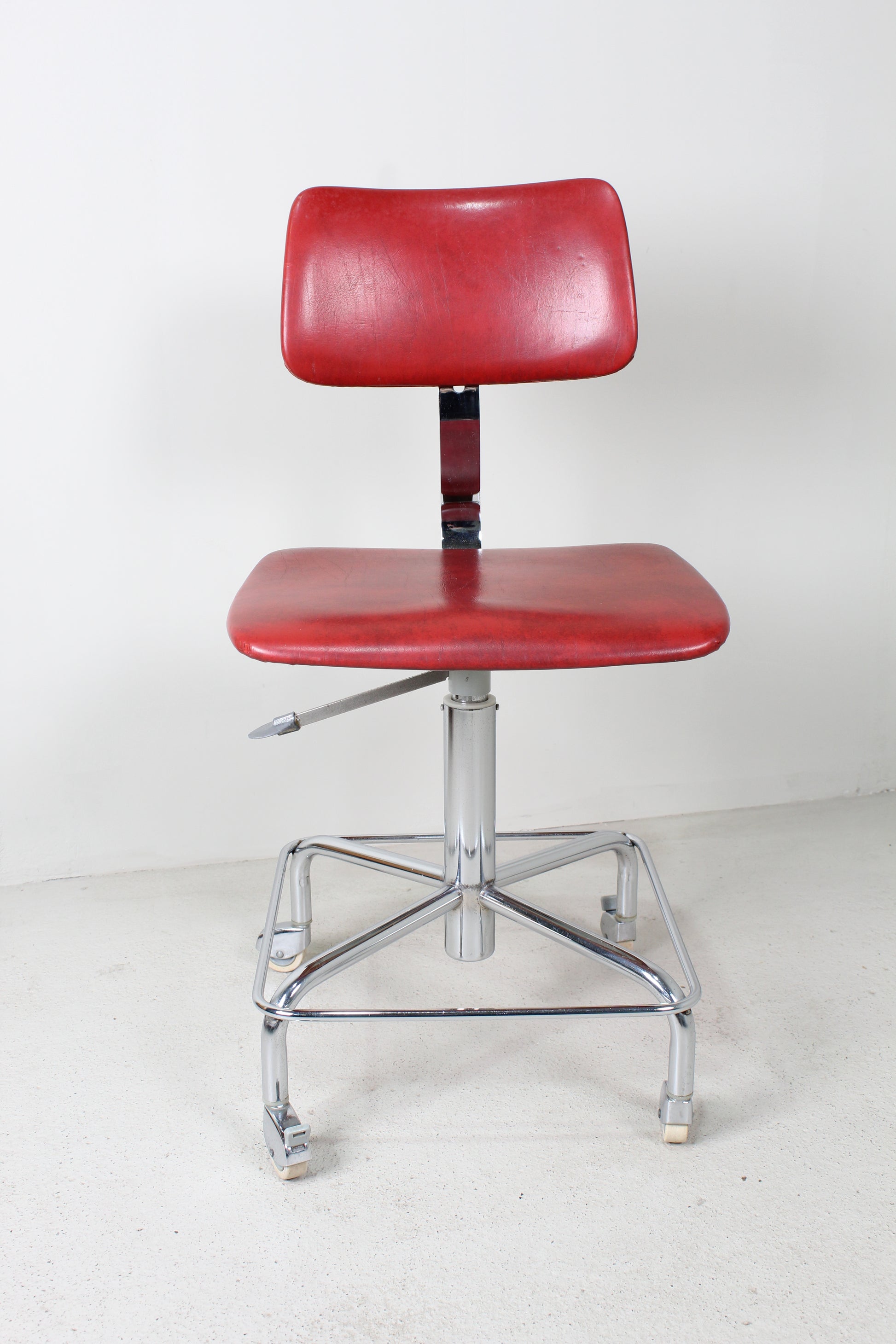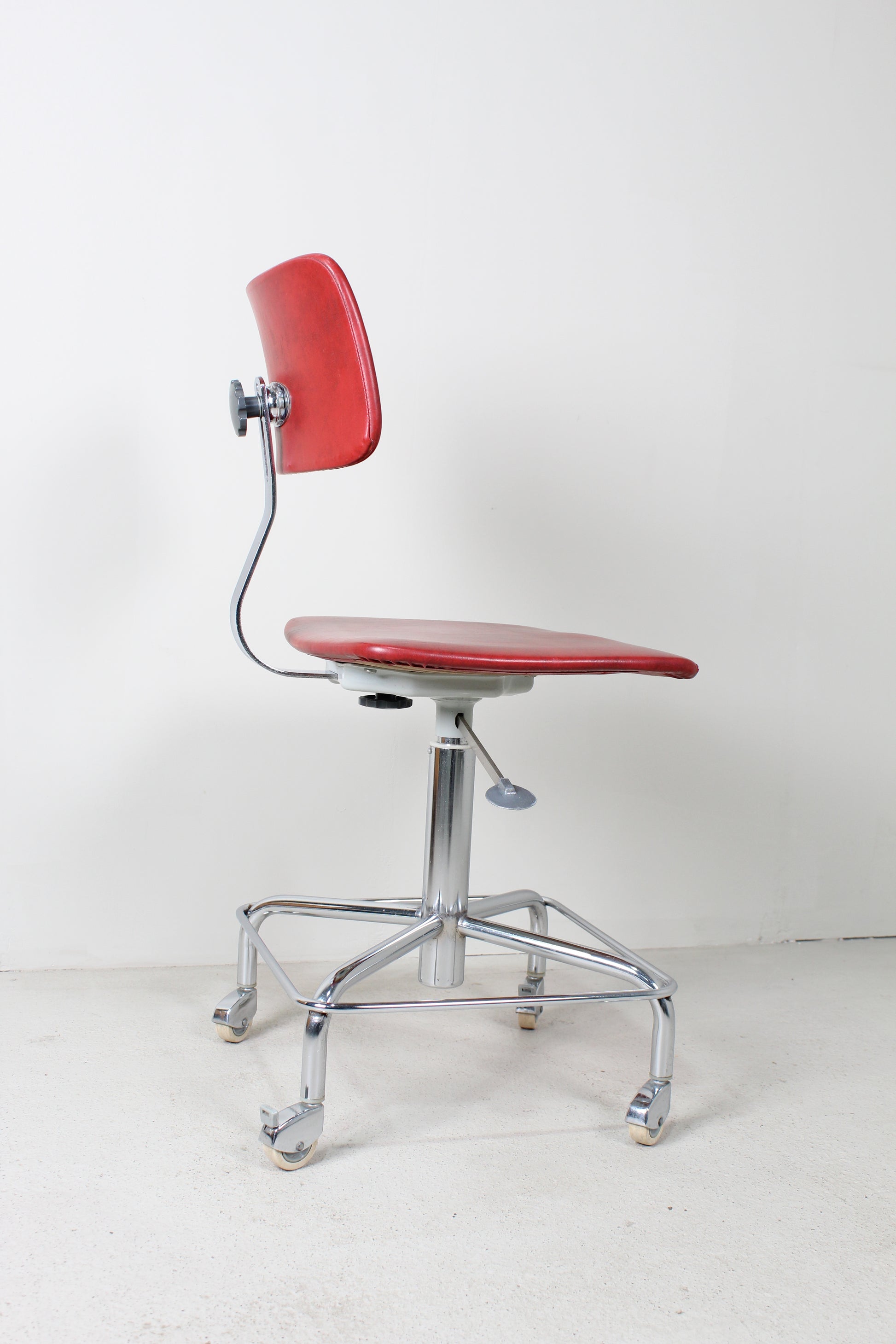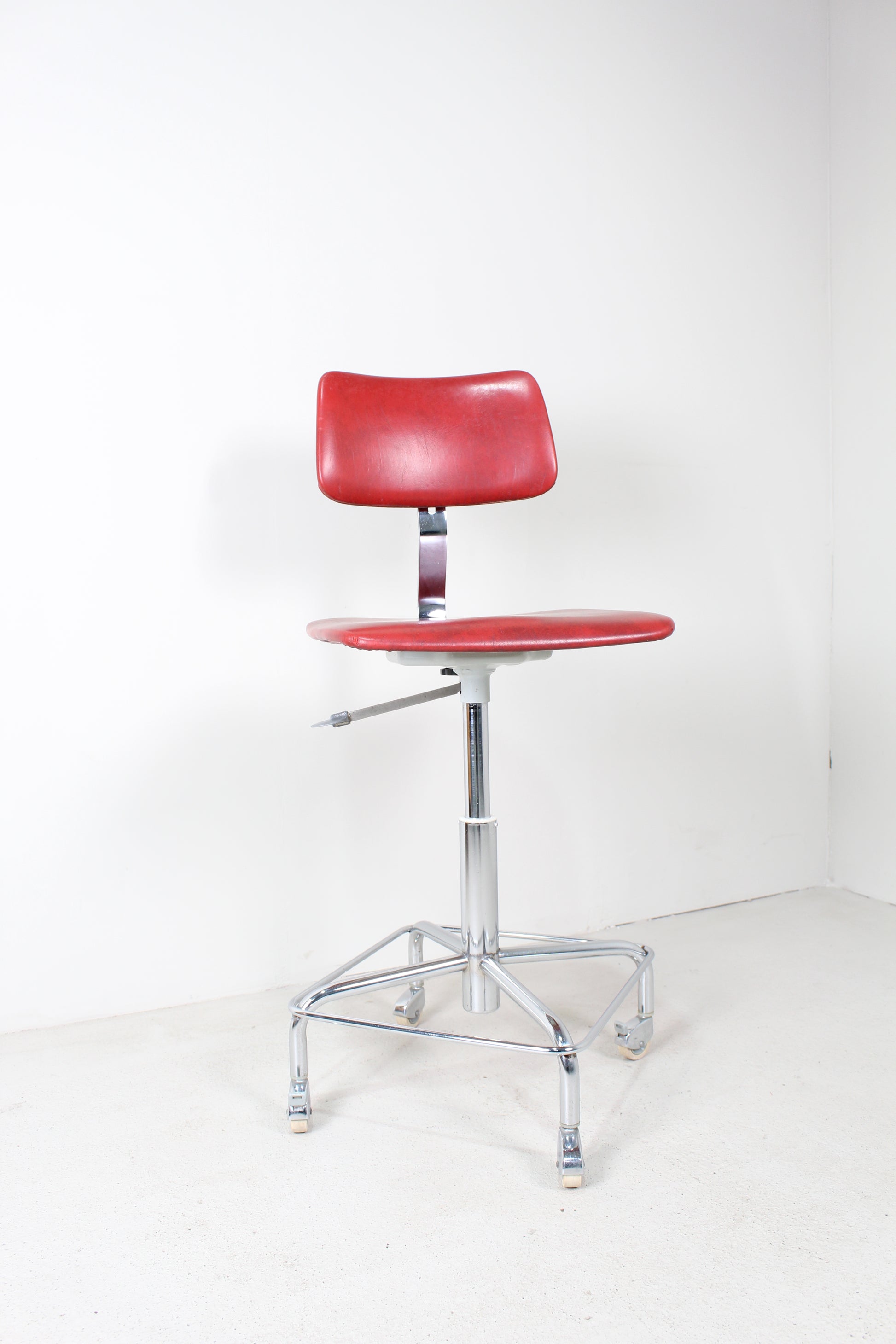 Deze industriële rode stoel is geweldig om te gebruiken als bureaustoel. Hij past perfect in een kleurrijk of eclectisch interieur. De stoel is in hoogte verstelbaar: zowel de zitting als de rugleuning kun je naar wens in hoogte aanpassen. De bekleding is van skai, en verder is het frame van metaal.