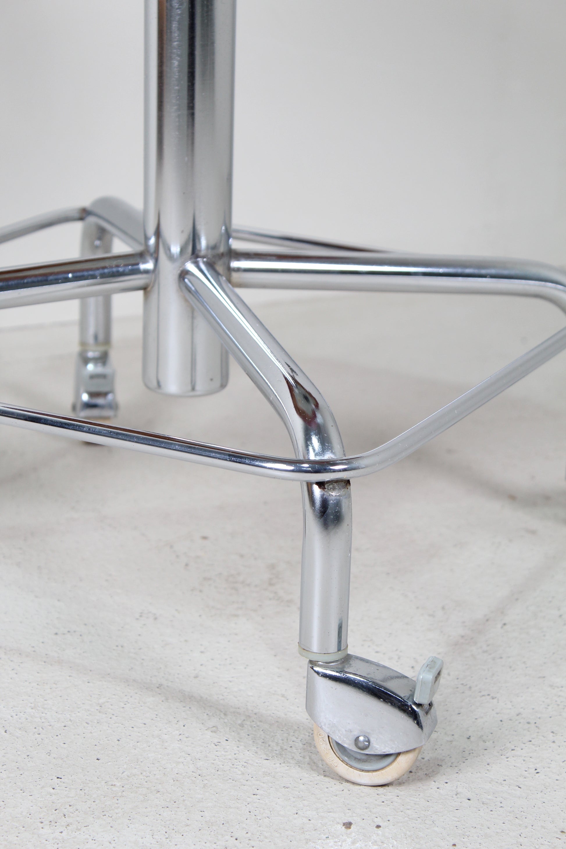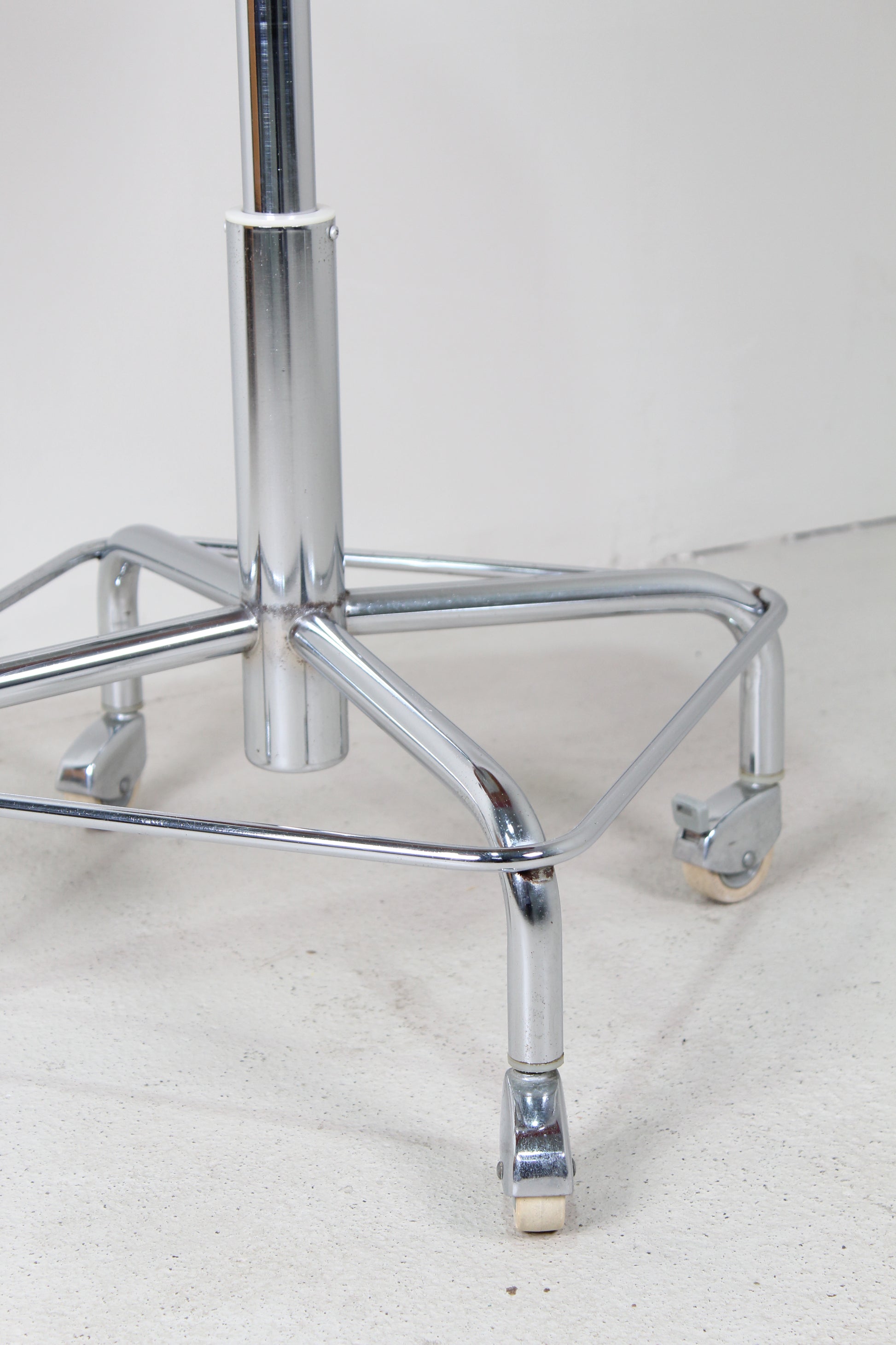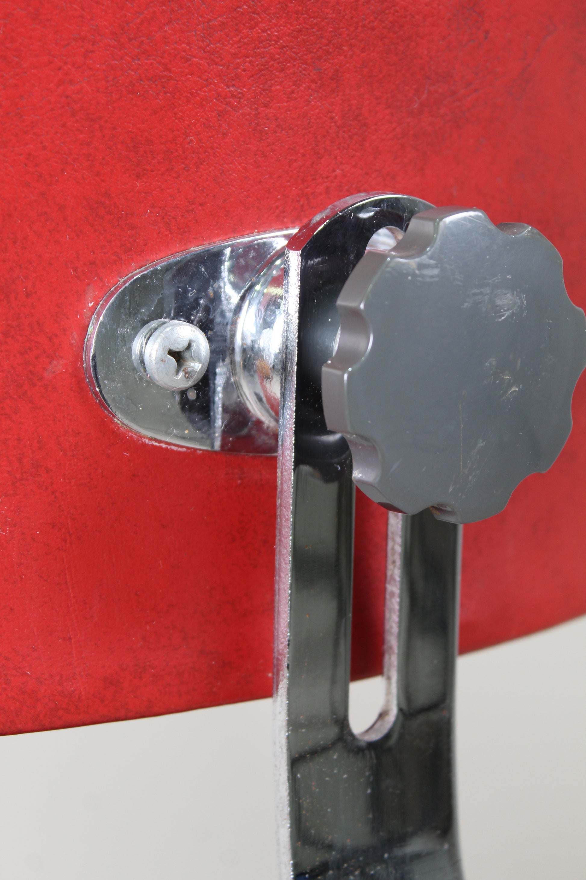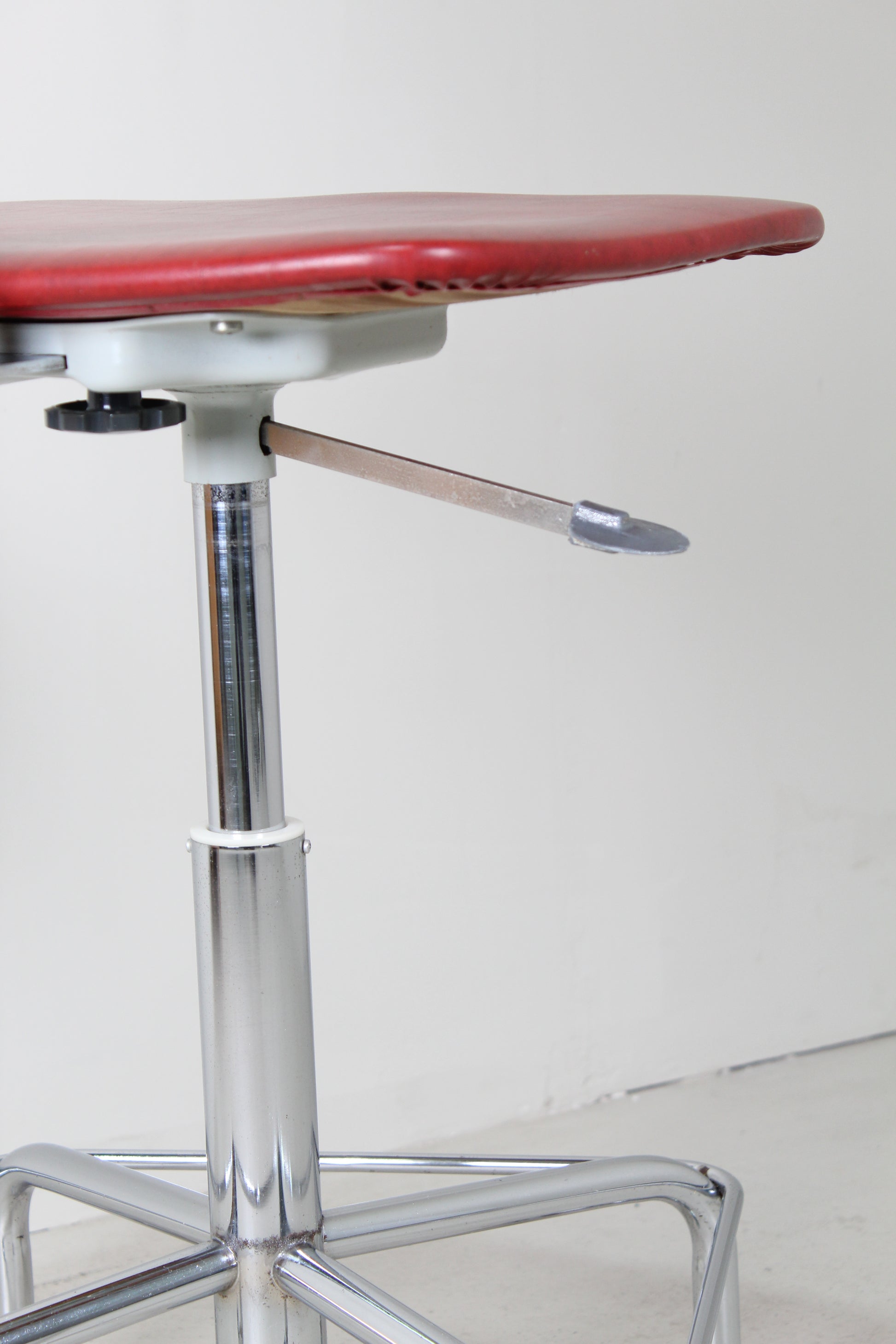 Deze industriële rode stoel is geweldig om te gebruiken als bureaustoel. Hij past perfect in een kleurrijk of eclectisch interieur. De stoel is in hoogte verstelbaar: zowel de zitting als de rugleuning kun je naar wens in hoogte aanpassen. De bekleding is van skai, en verder is het frame van metaal.
