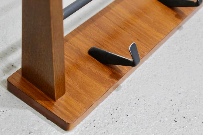 01261 Diese klassische Garderobe aus der Mitte des Jahrhunderts. Hergestellt aus Holz mit Metall in den 60er Jahren. Abgerundet durch schwarze Details, eine Hutablage und 4 Haken. Zustand: gut, die Farbe auf der Metalloberseite hat sich durch die Nutzung etwas gelöst. Maße: B 68 x H 11 x T 25 cm