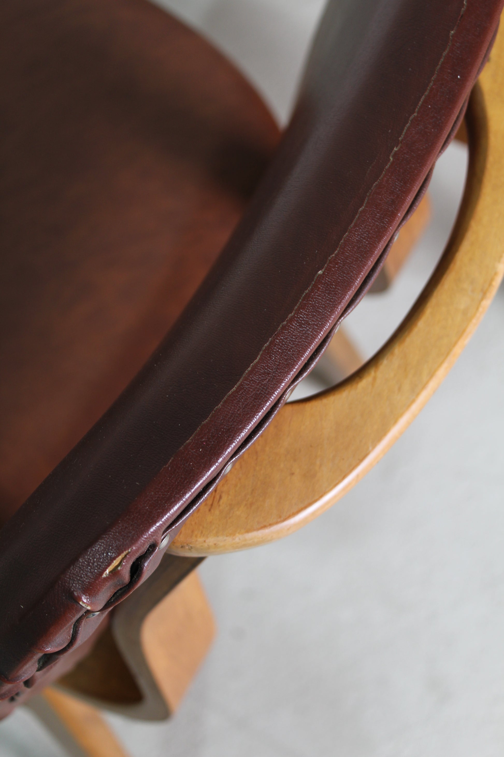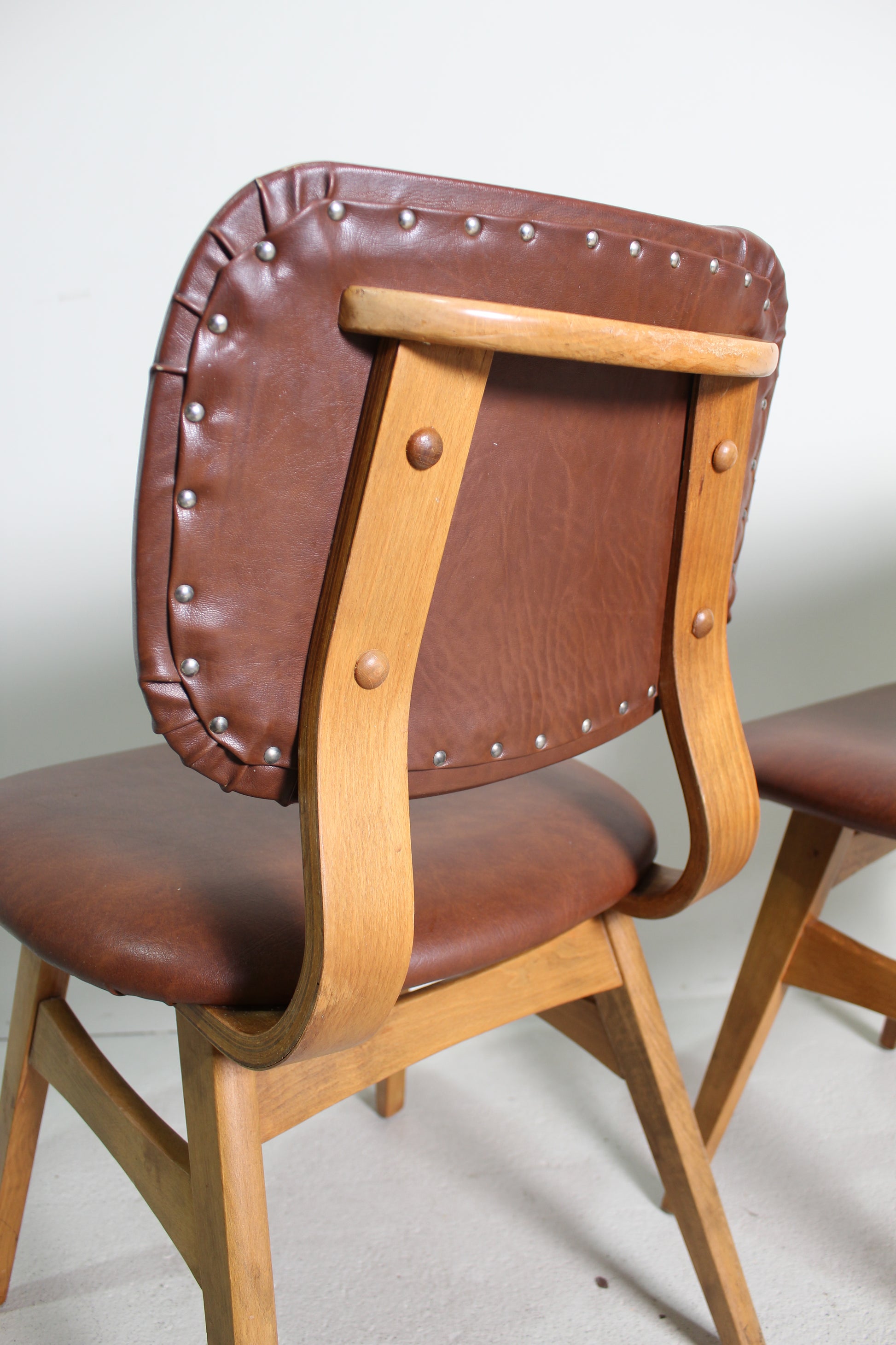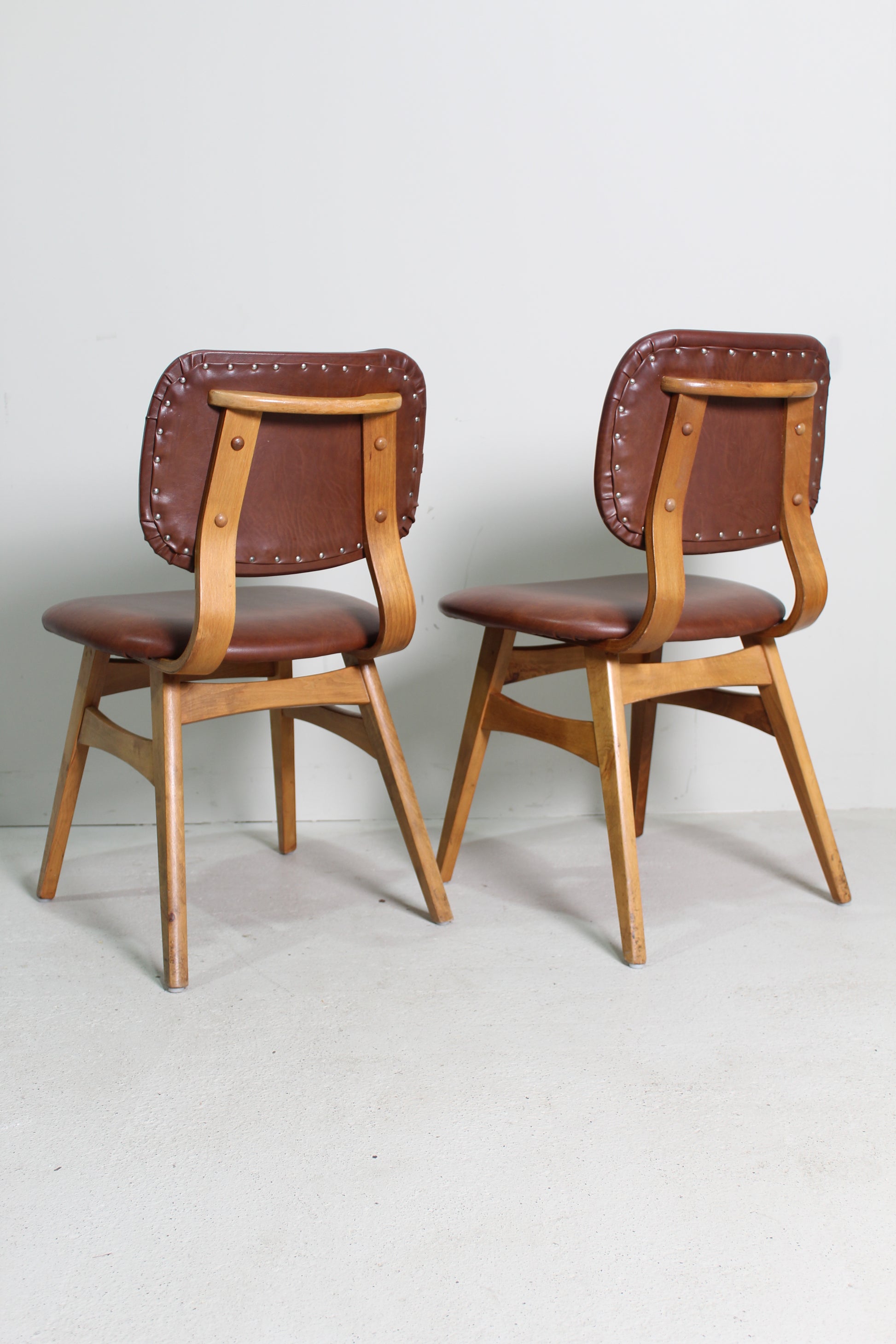 Set eetkamerstoelen uit de jaren '60. De stoelen hebben een skai stof in rood bruine kleur, en zitten solide.