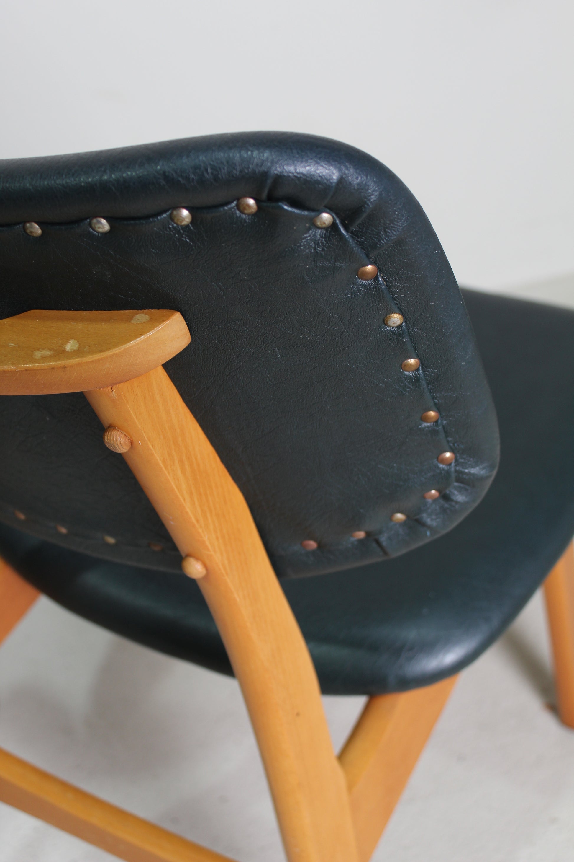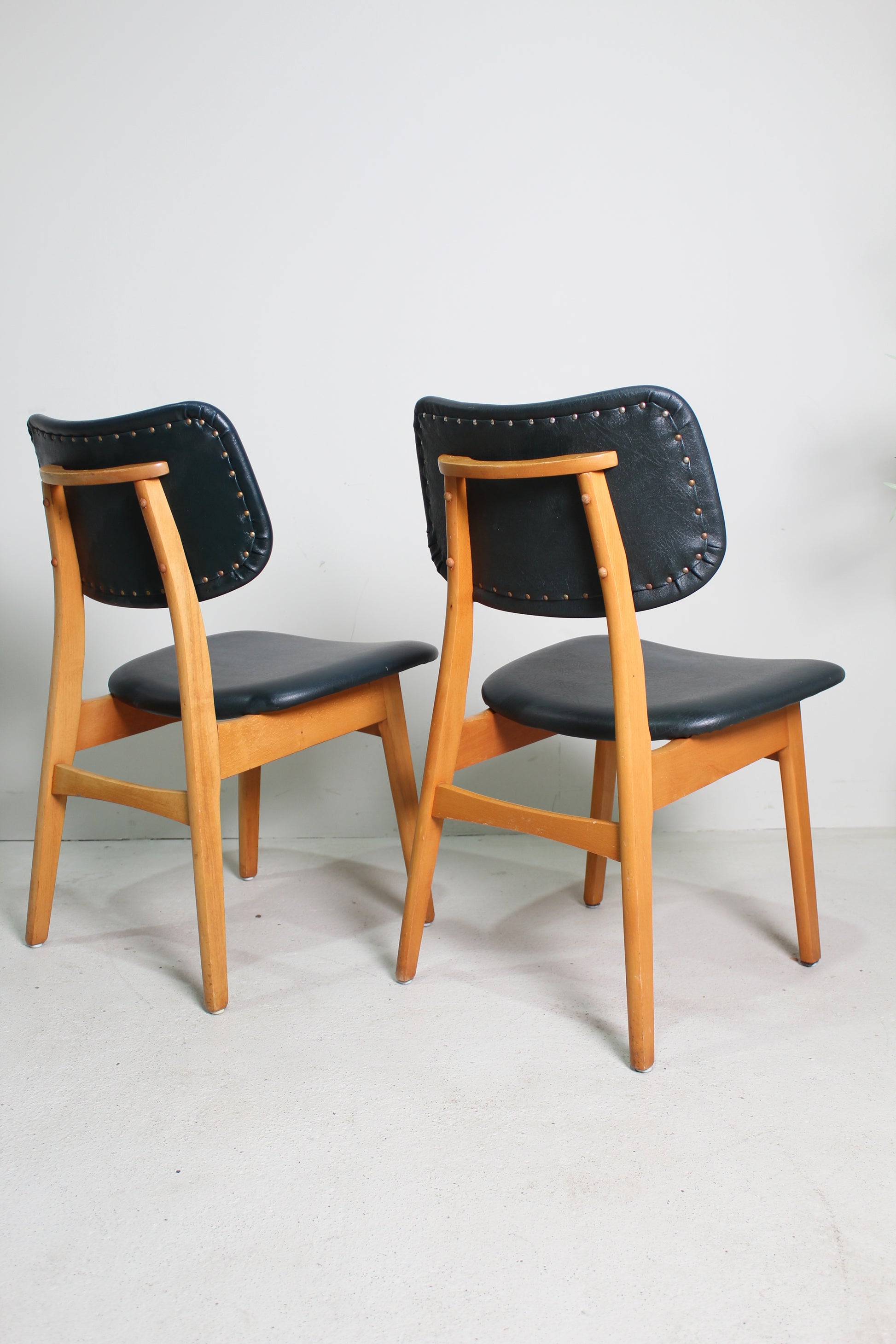 Set eetkamerstoelen uit de jaren '60. De stoelen hebben een skai stof in antraciet kleur en zitten solide.