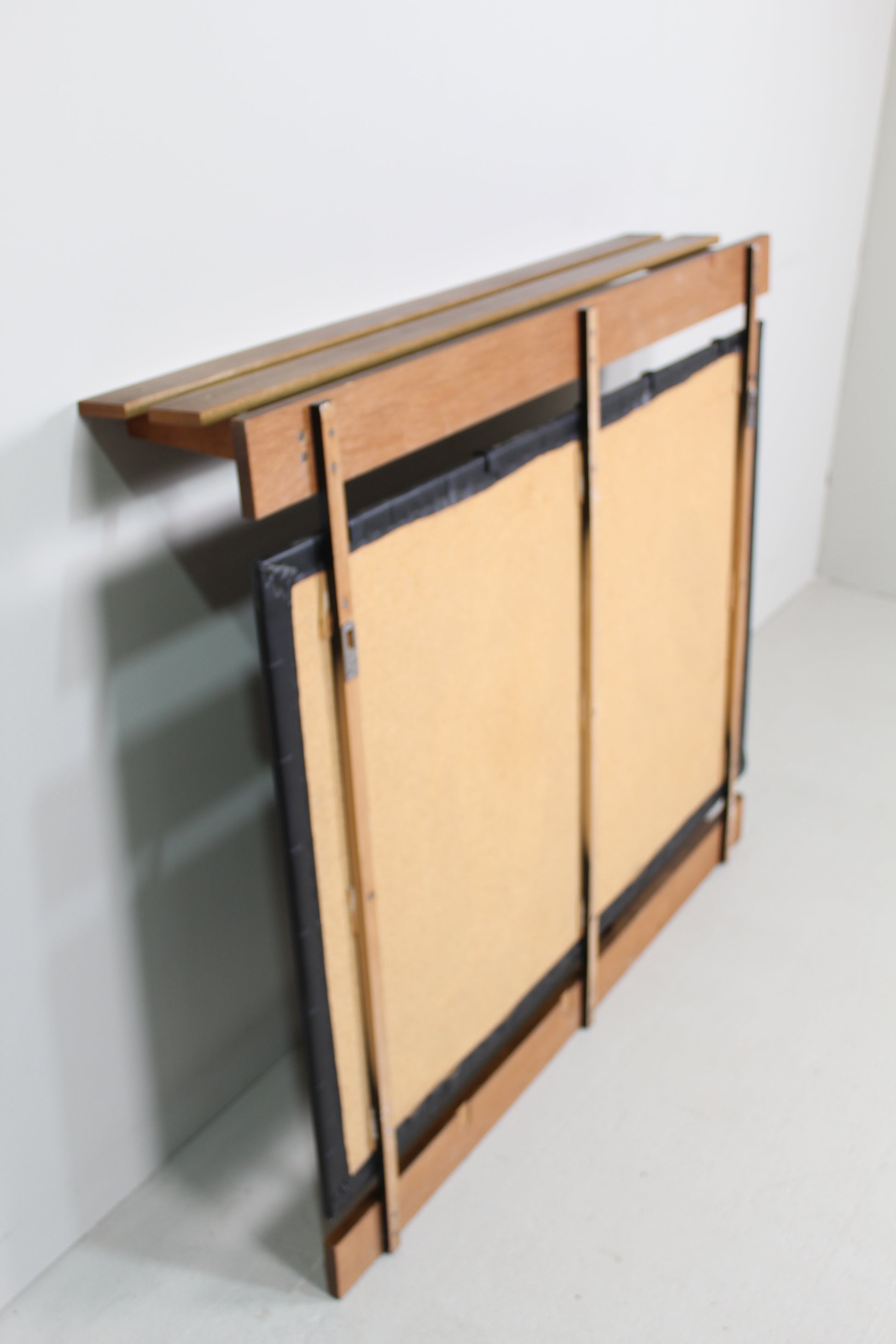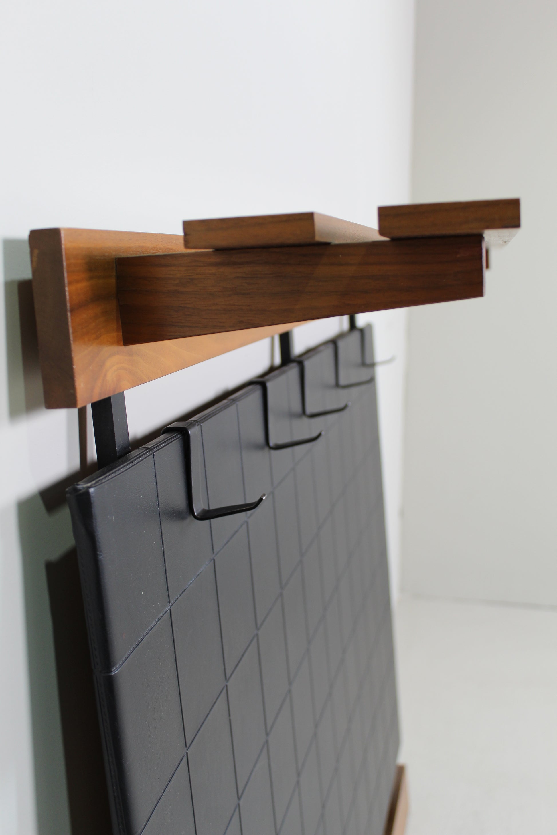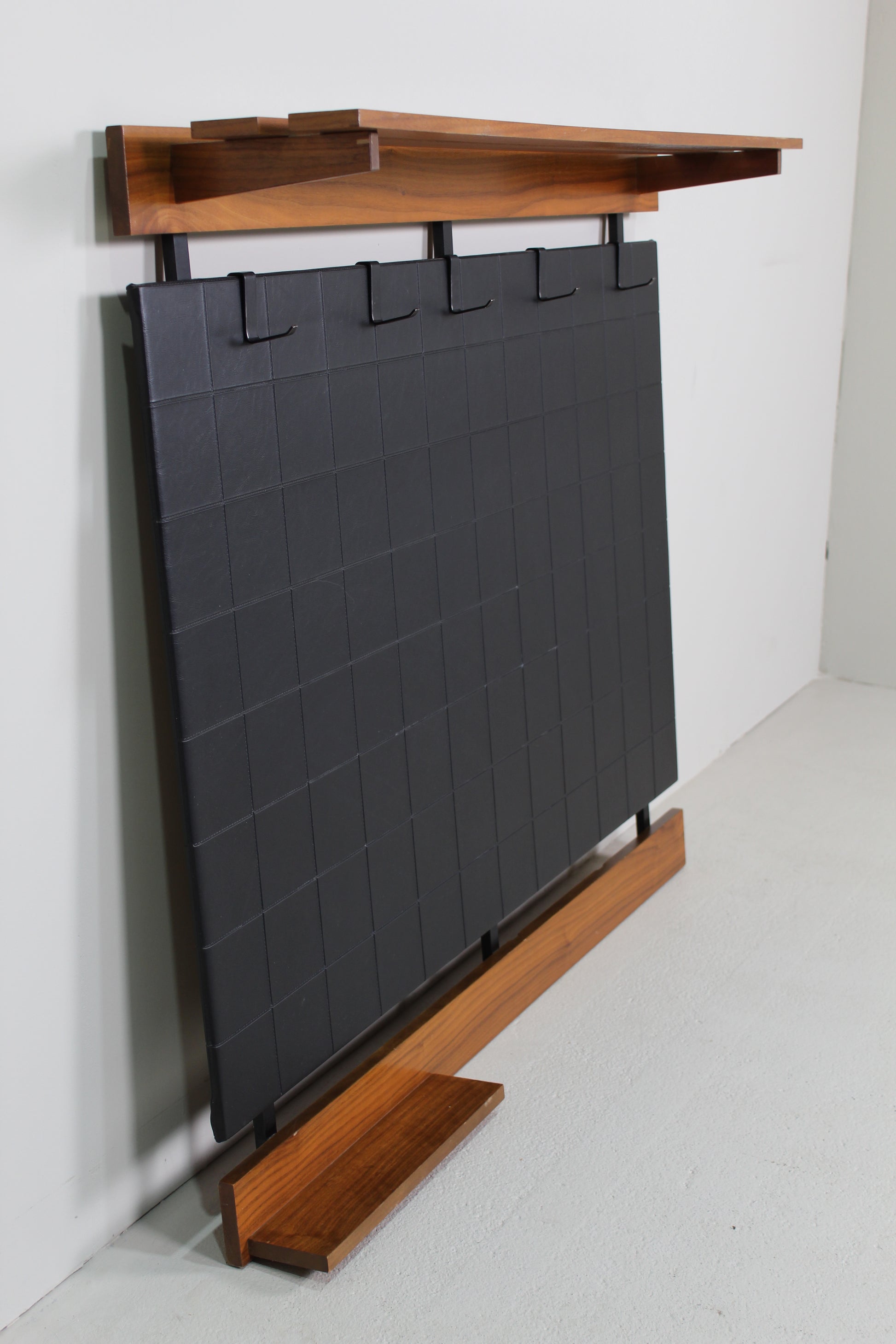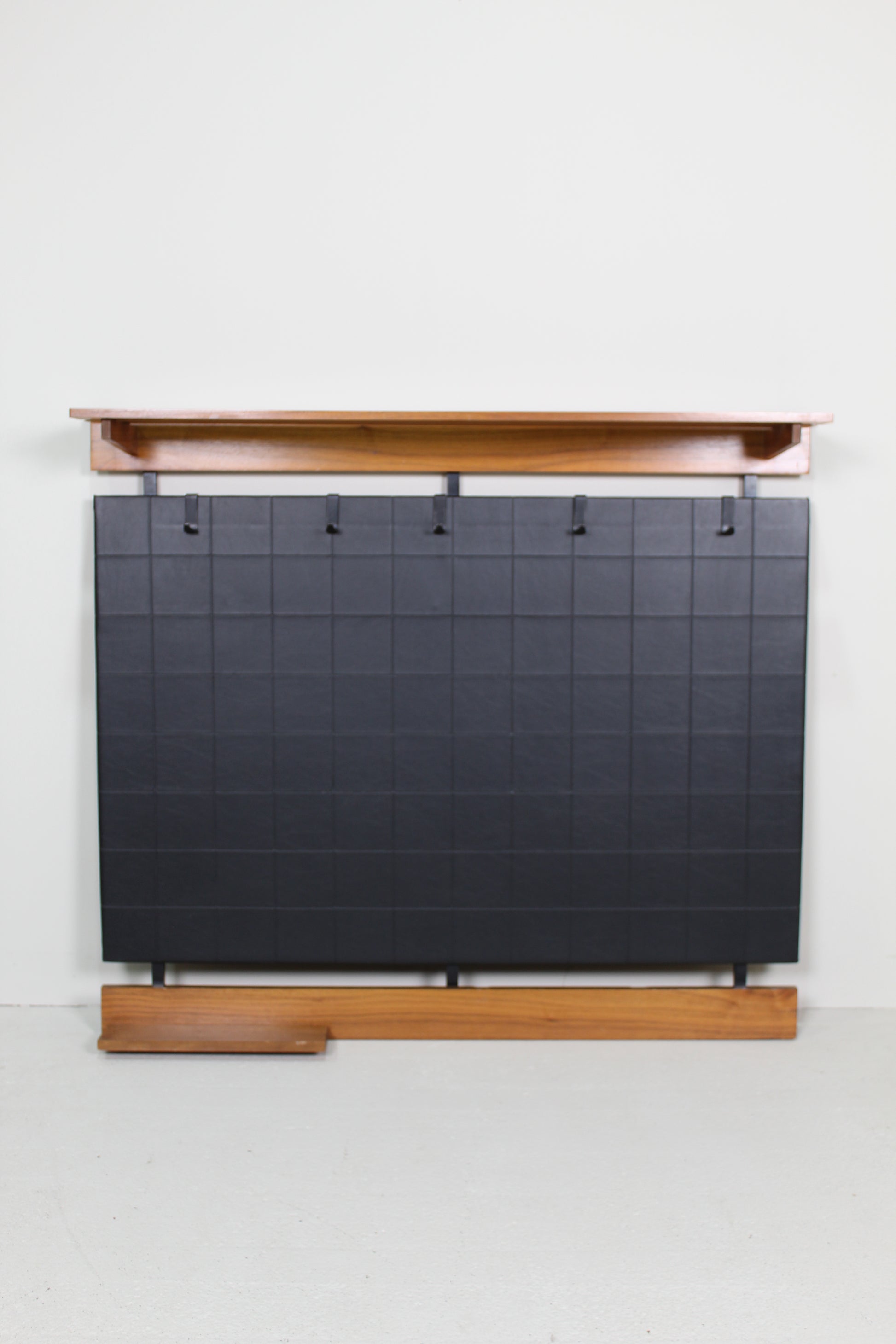 Large vintage coat rack with hat shelf or wardrobe from the 60s. This mid century wardrobe has a back plate that is covered with black imitation leather and black coat hooks. The rest of the frame and the hat shelf are made of wood.