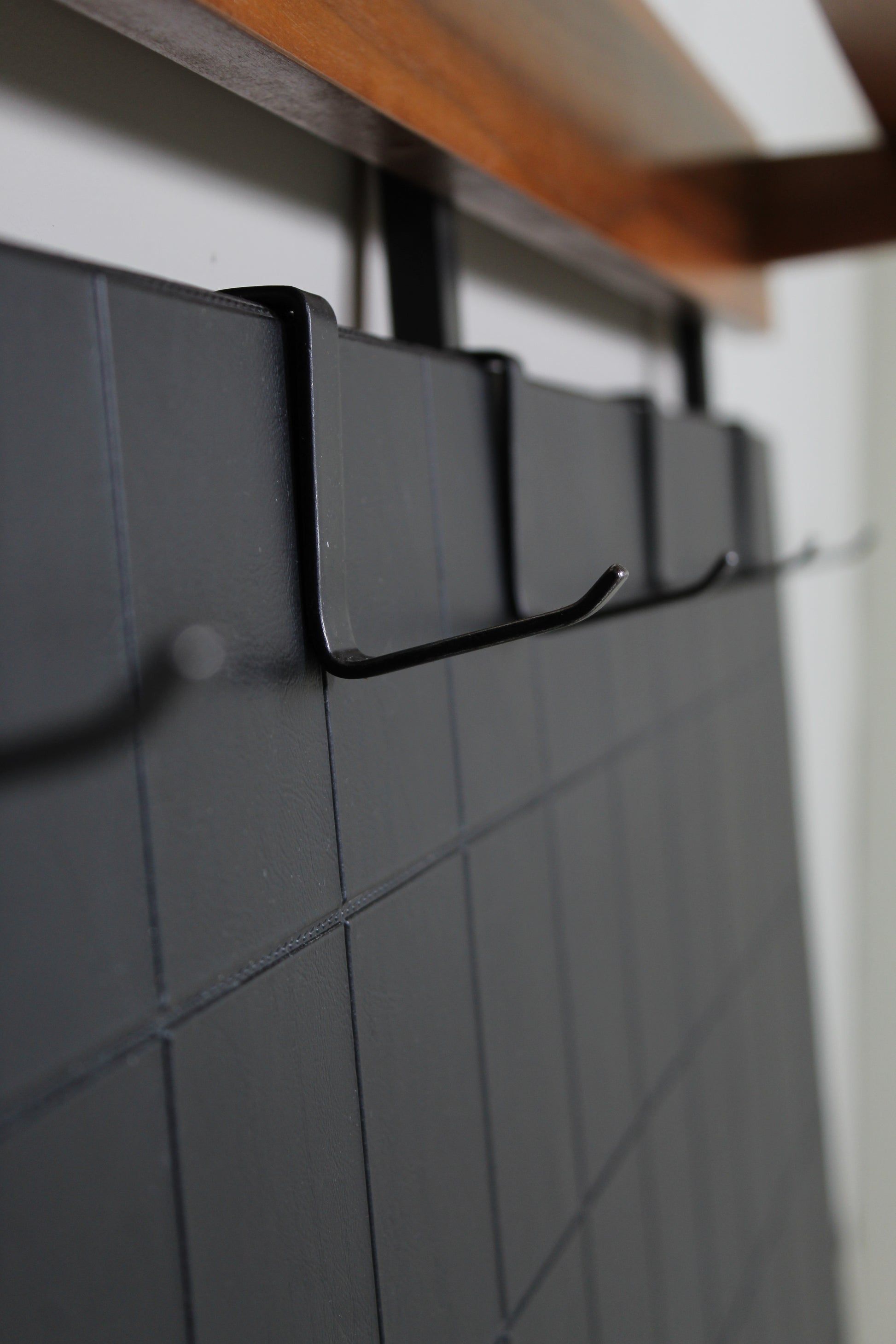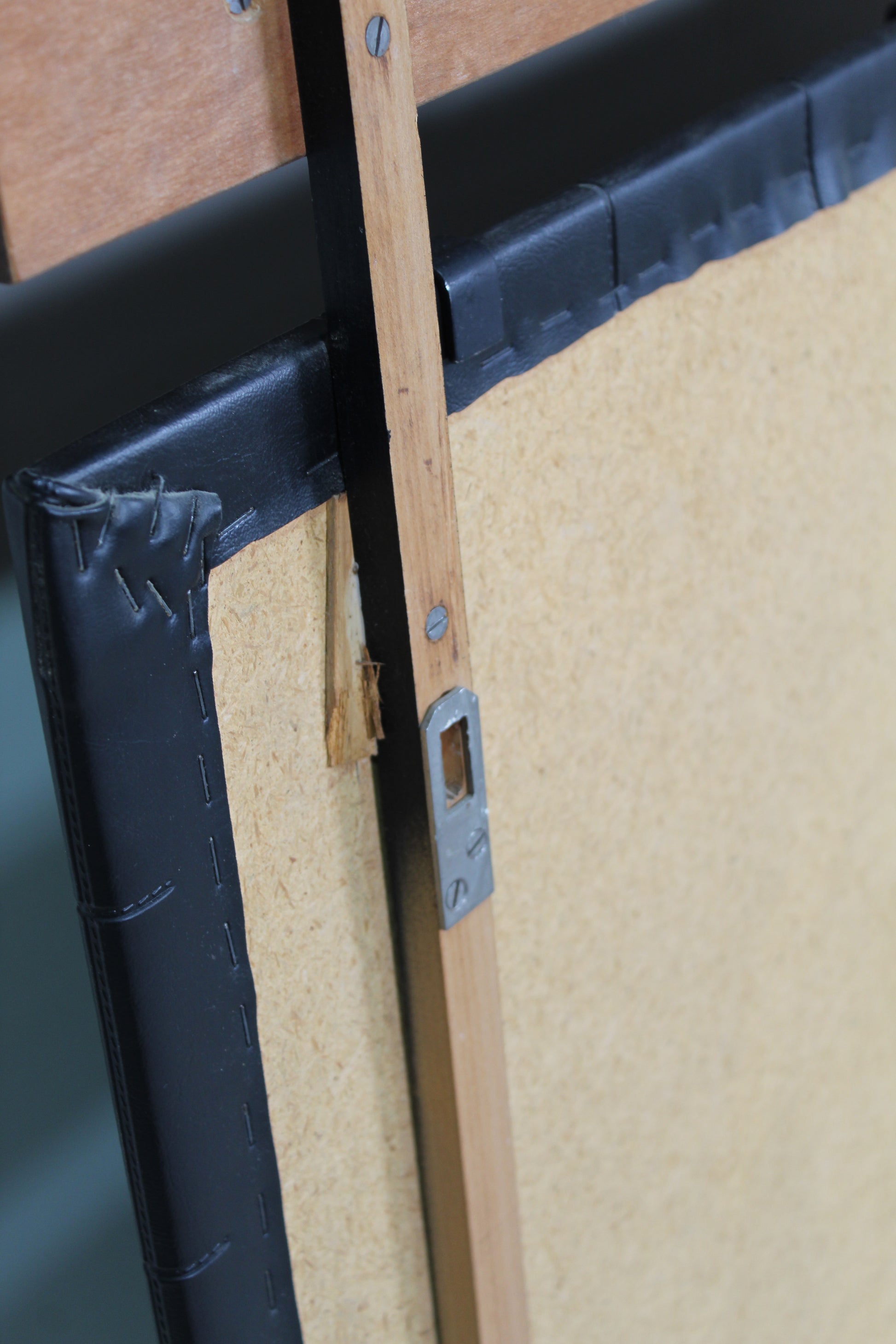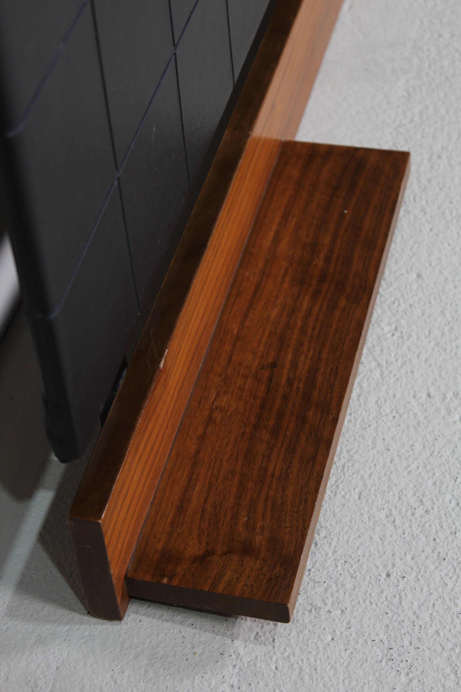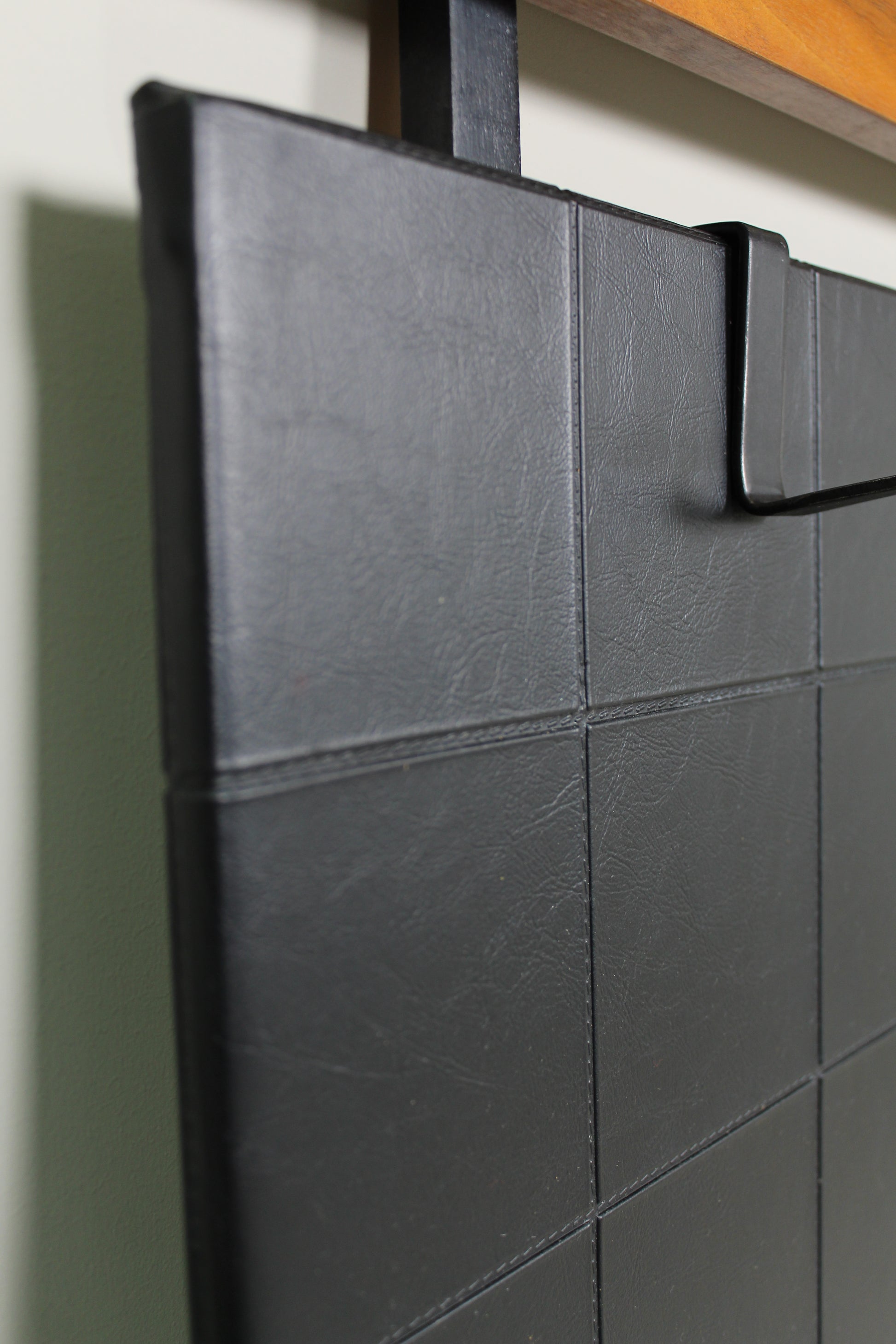 Large vintage coat rack with hat shelf or wardrobe from the 60s. This mid century wardrobe has a back plate that is covered with black imitation leather and black coat hooks. The rest of the frame and the hat shelf are made of wood.