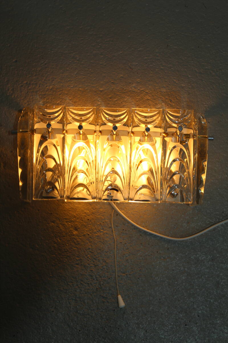 This special mid-century Italian wall lamp was made in the 1960s from heavy lead crystal. These special crystal plates have a beautiful relief in the glass, which provides atmospheric light. The lamp is made in Italy. The wall lamp is easy to (dis)assemble. The lamp is intended to be connected directly to electricity. New LEDs are included.