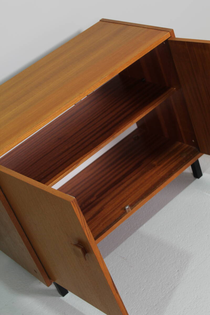 Vintage cabinet made by the Dutch furniture maker Slotboom in the 1960s. Made of teak veneer. The cabinet has two doors with a removable shelf behind them. Finished with square wooden handles.