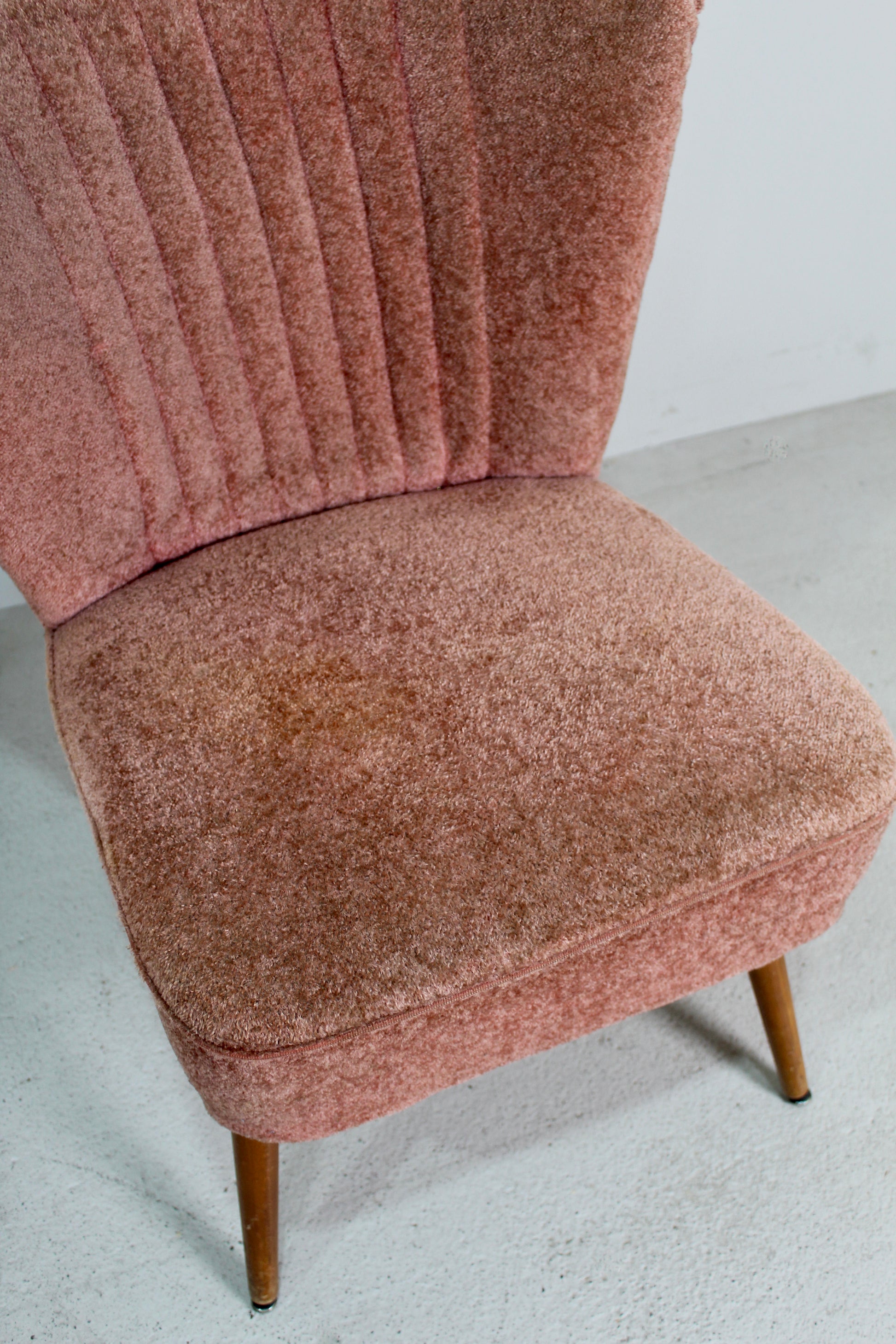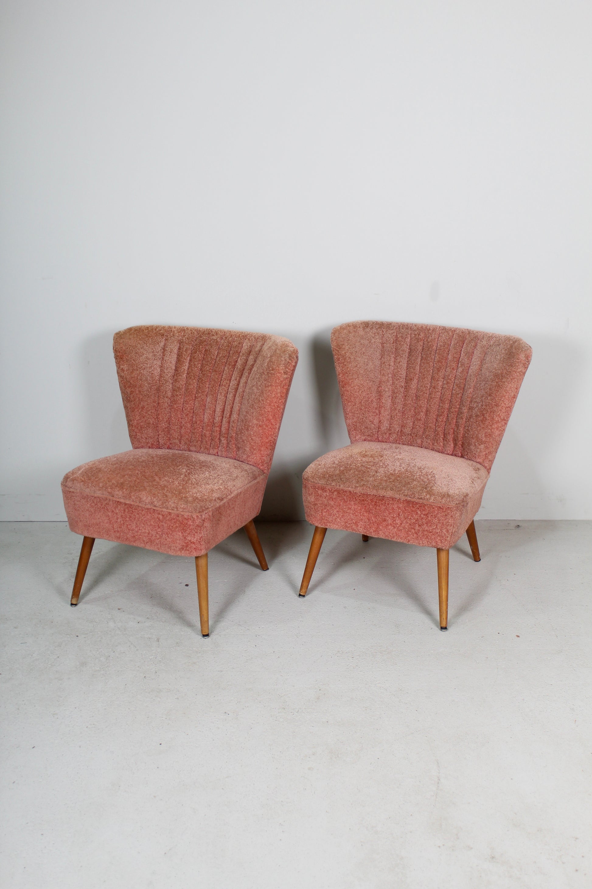 De bekleding heeft enkele vlekken, zoals op de foto’s te zien is. Verder zijn het mooie voorbeelden van typisch jaren ’50 vormgeving, compact van formaat en fijn om erbij te zetten in een zithoek of slaapkamer.