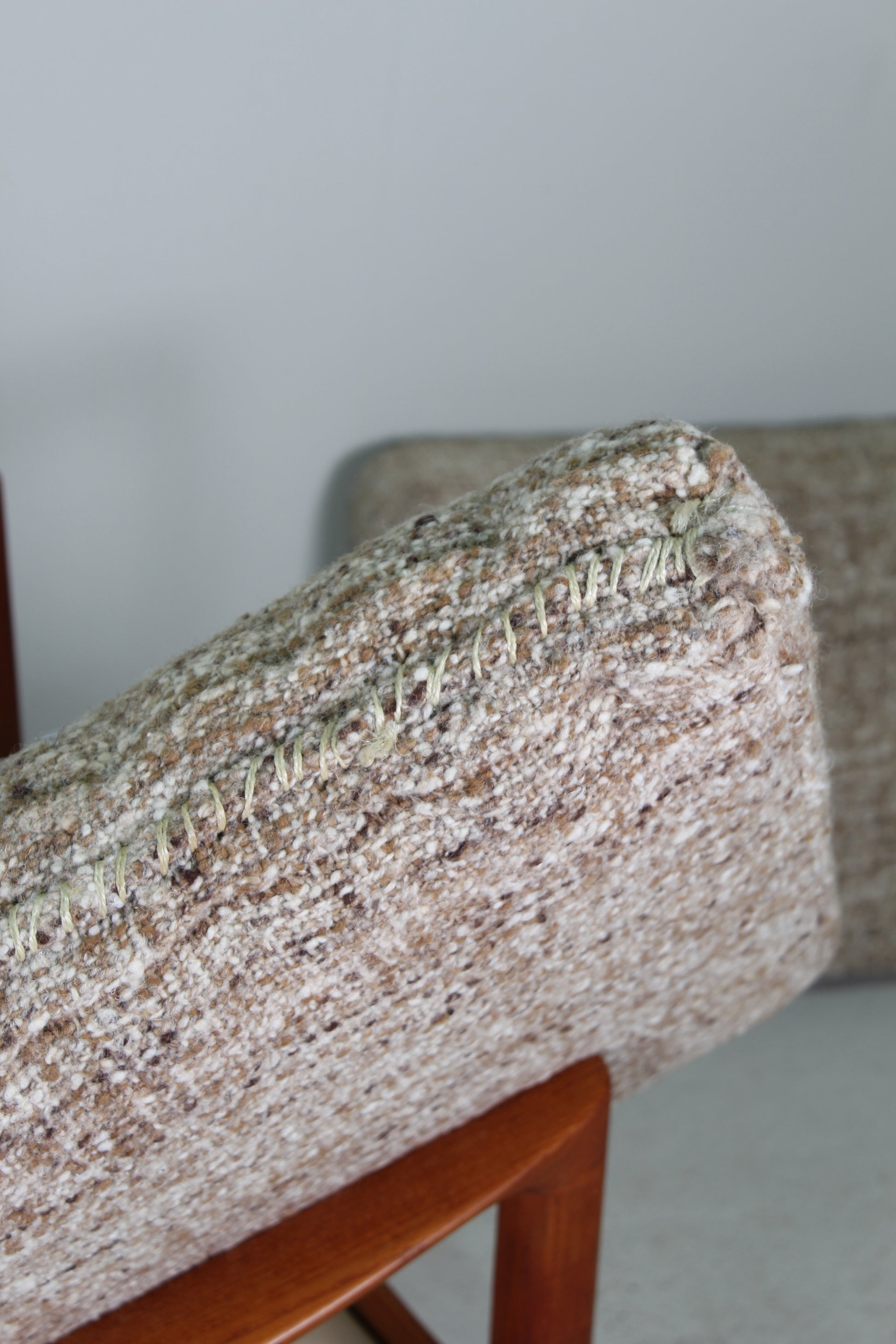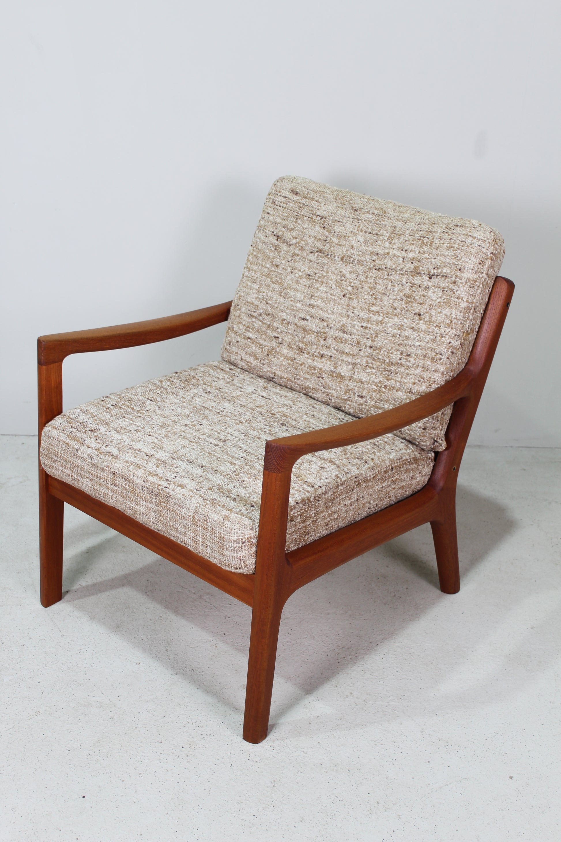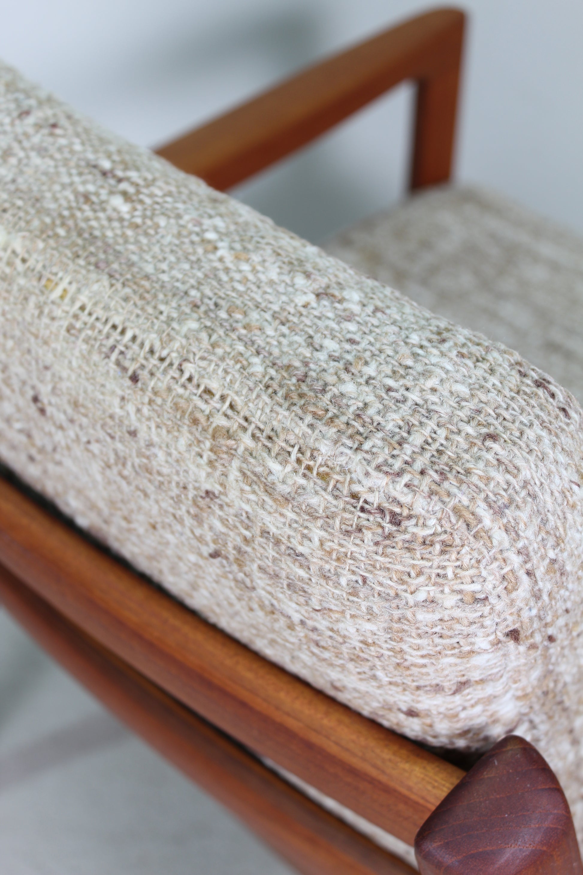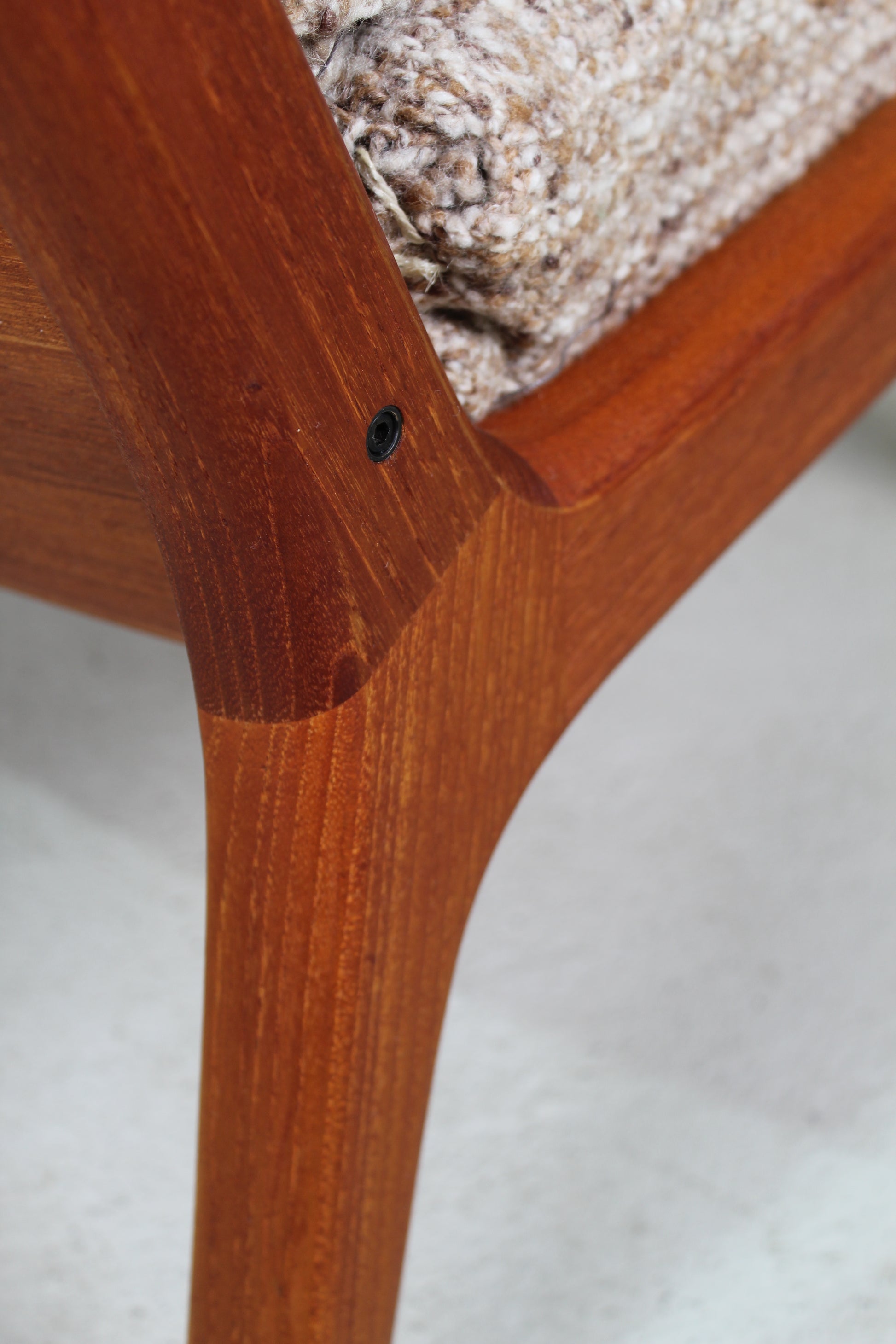 Massief teak en wollen bekleding.