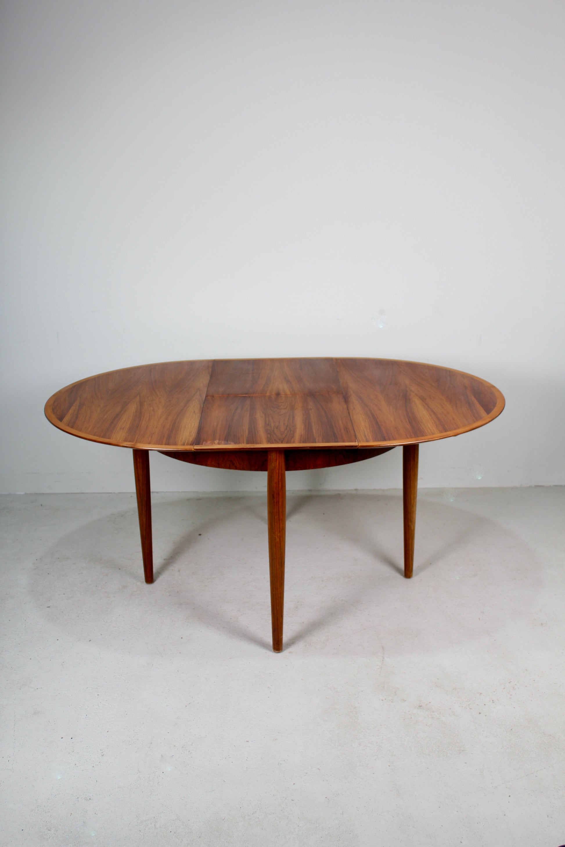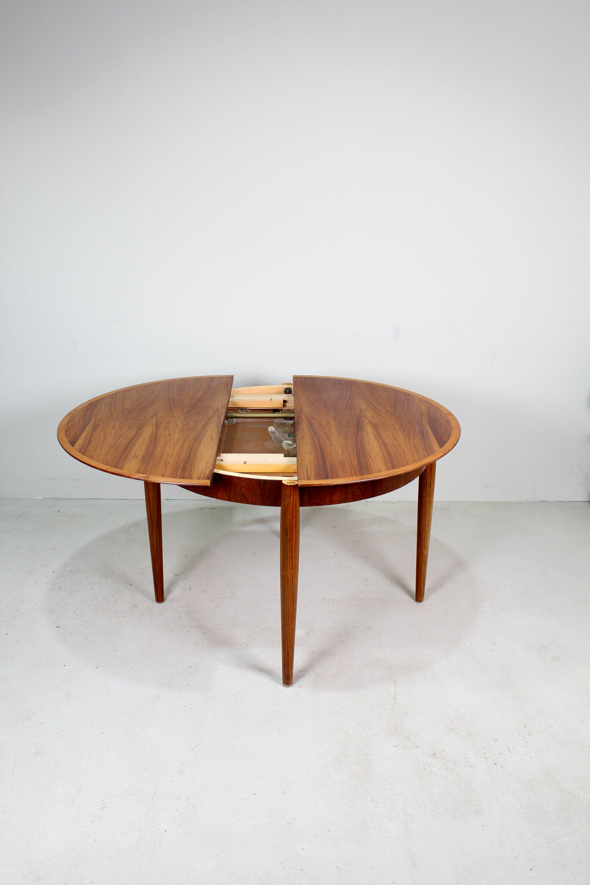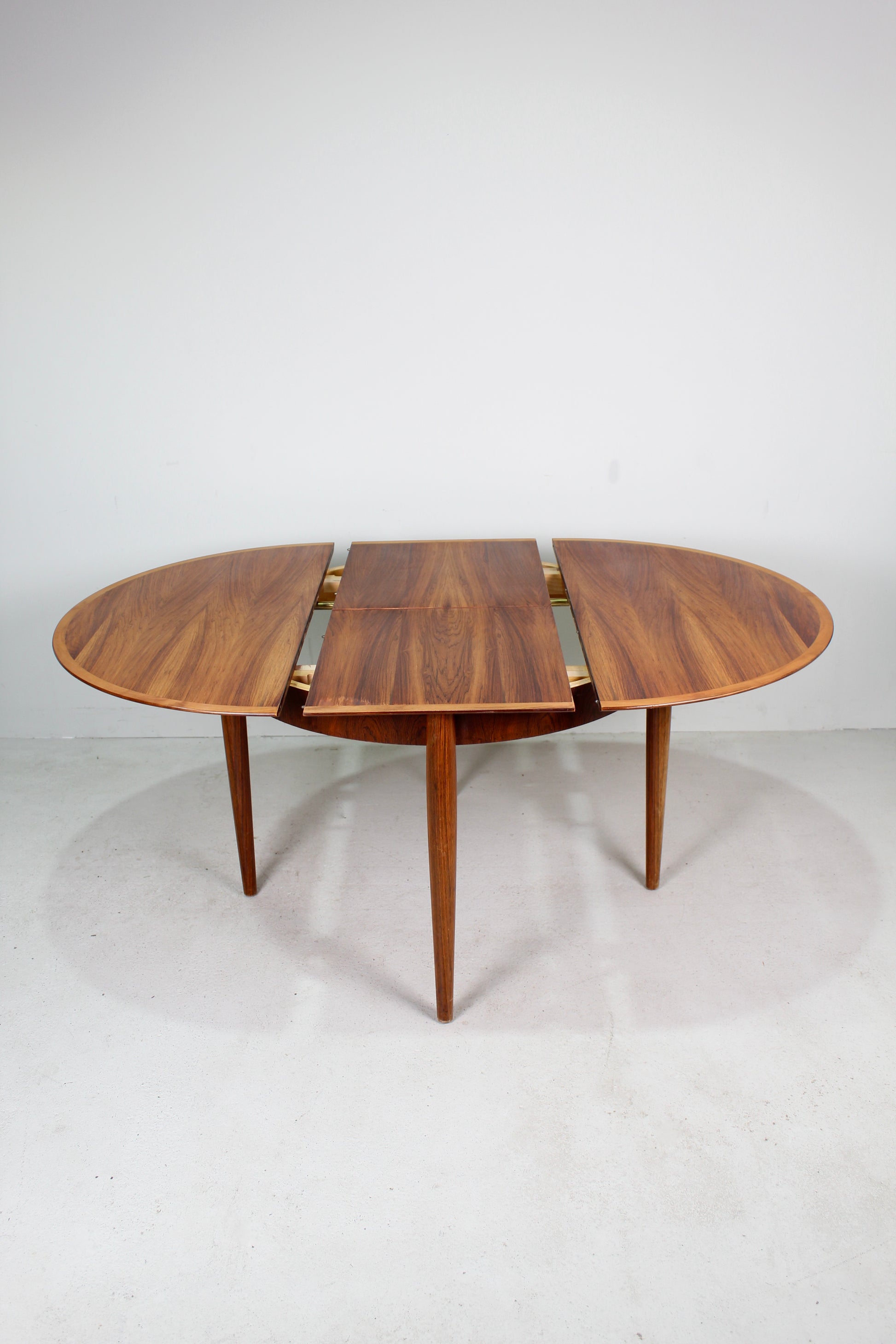 Deze eetkamertafel is gemaakt door Rincklake van Endert uit Duitsland en komt uit de jaren ’60. De tafel is uitgevoerd in palissanderhout, bekend om zijn mooie tekening en stevige kwaliteit. In ingeschoven stand heeft hij een diameter van 110 cm.