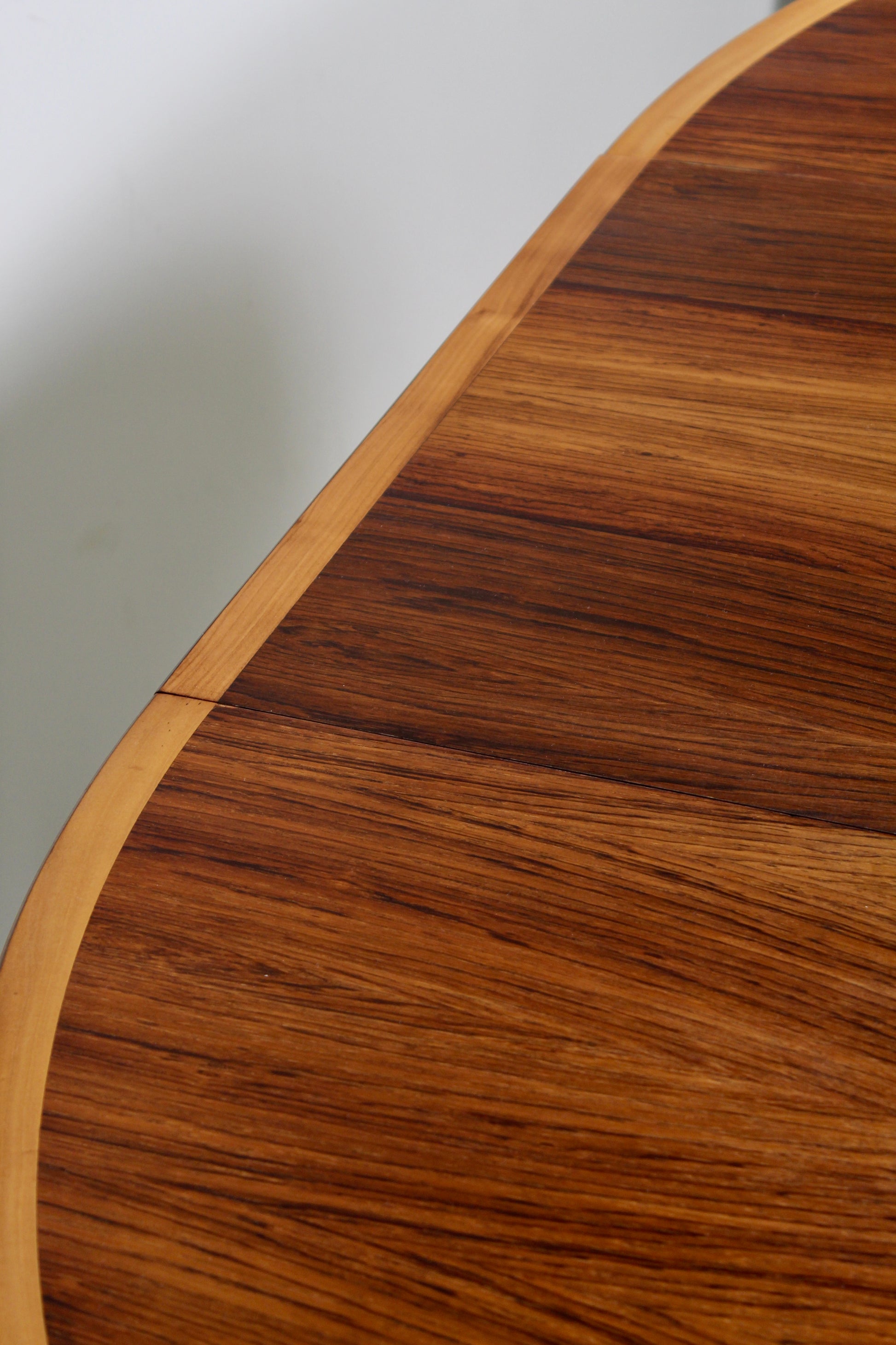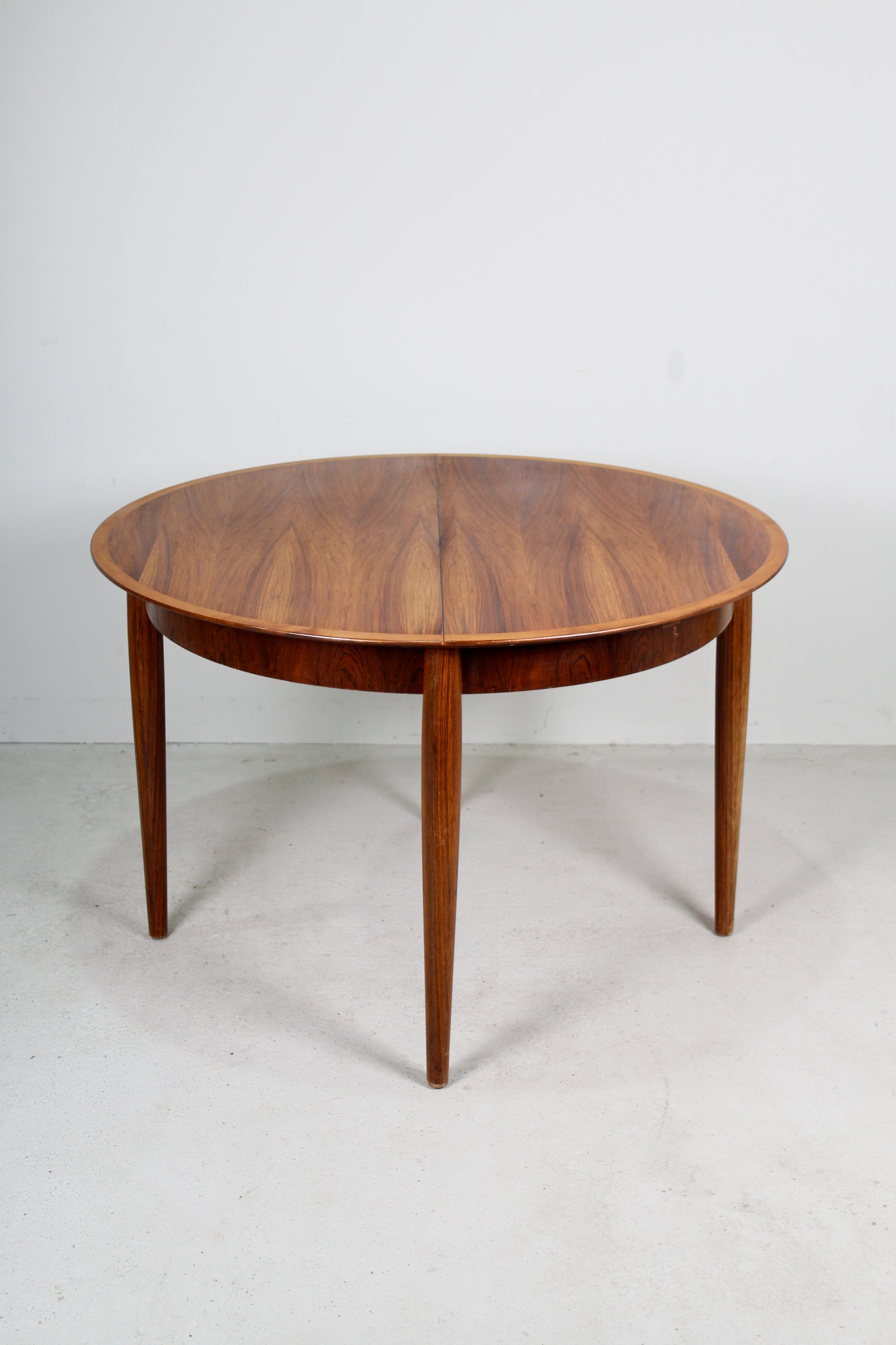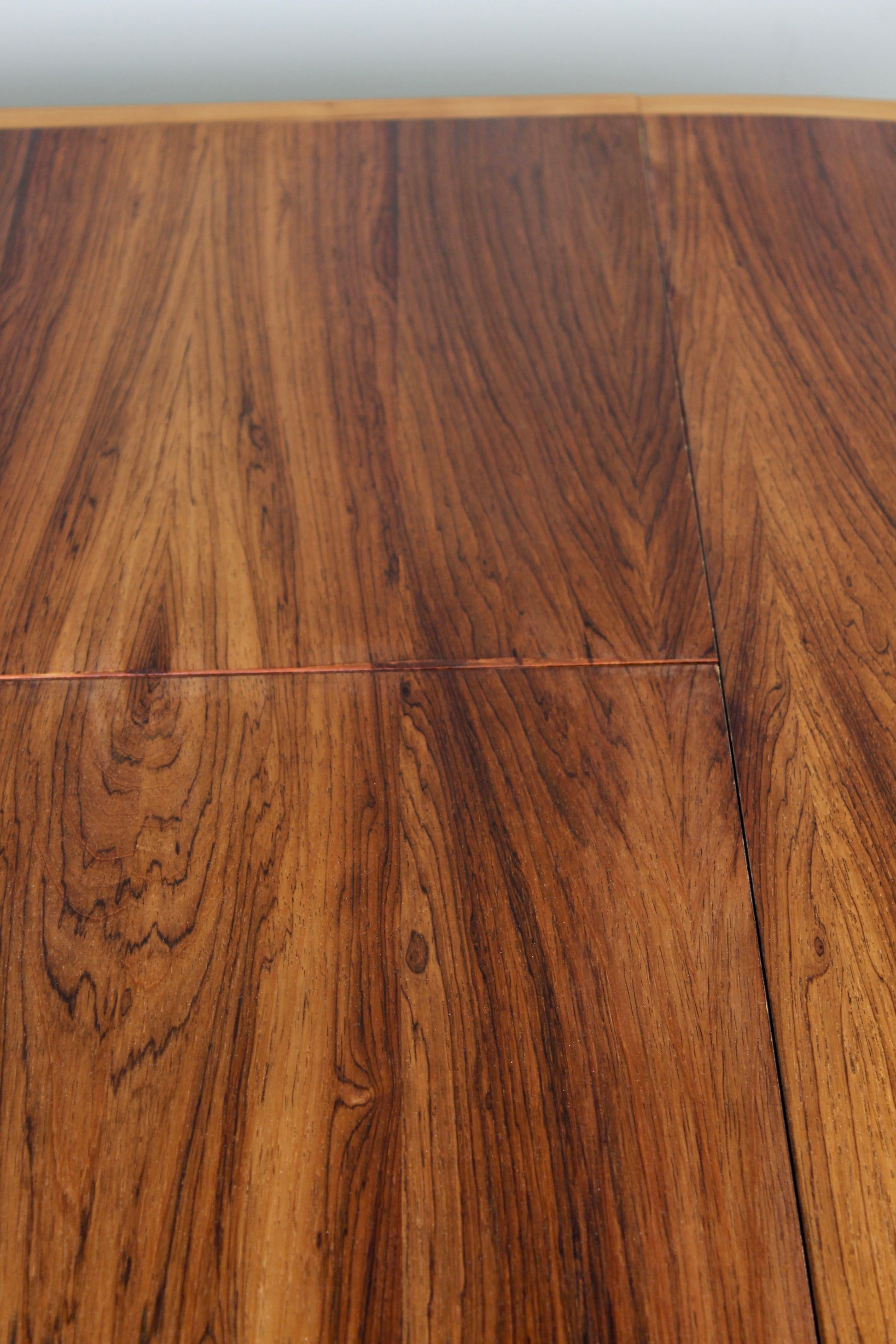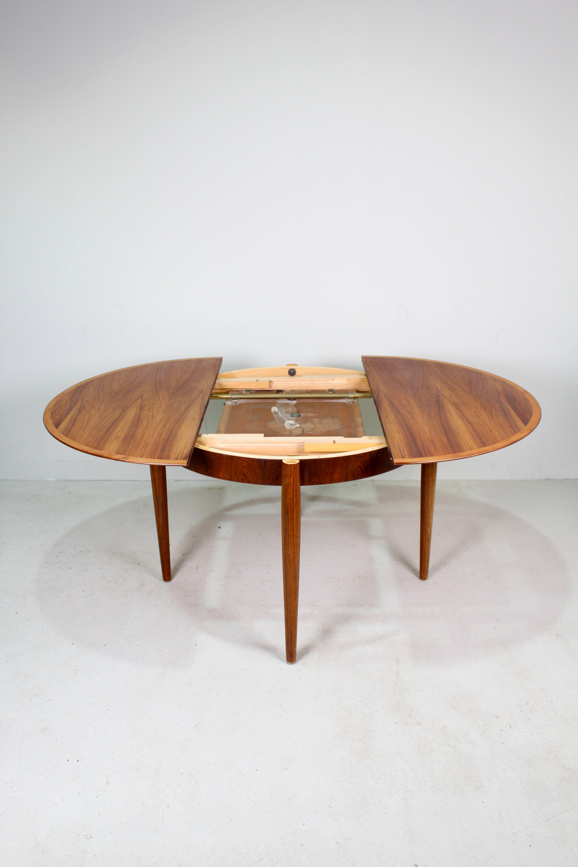 Deze eetkamertafel is gemaakt door Rincklake van Endert uit Duitsland en komt uit de jaren ’60. De tafel is uitgevoerd in palissanderhout, bekend om zijn mooie tekening en stevige kwaliteit. In ingeschoven stand heeft hij een diameter van 110 cm.