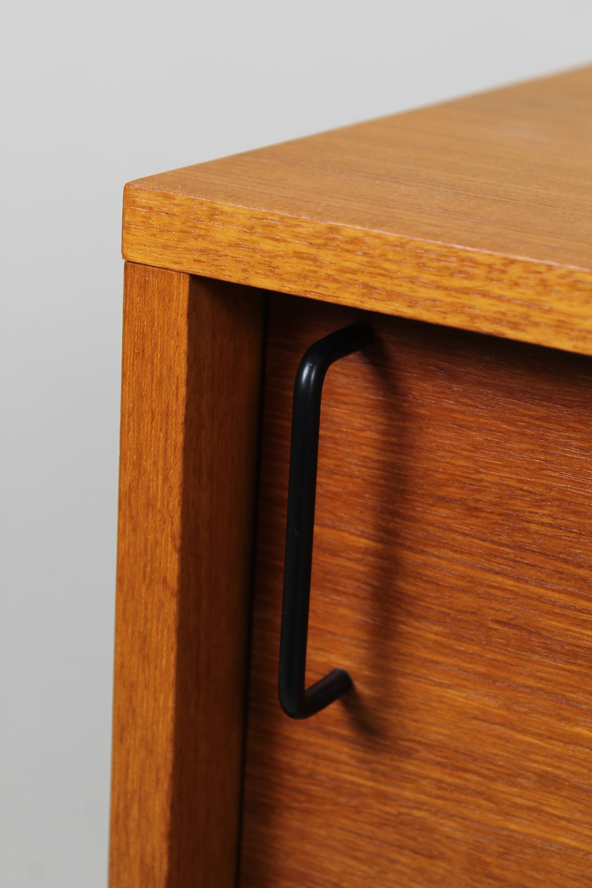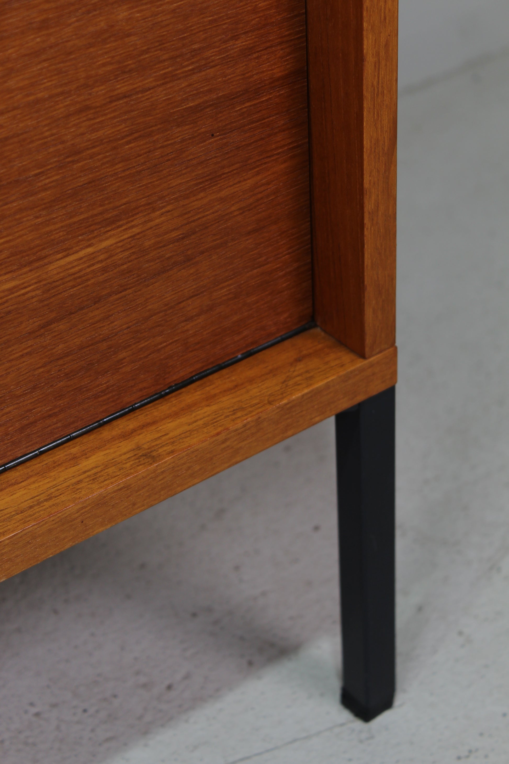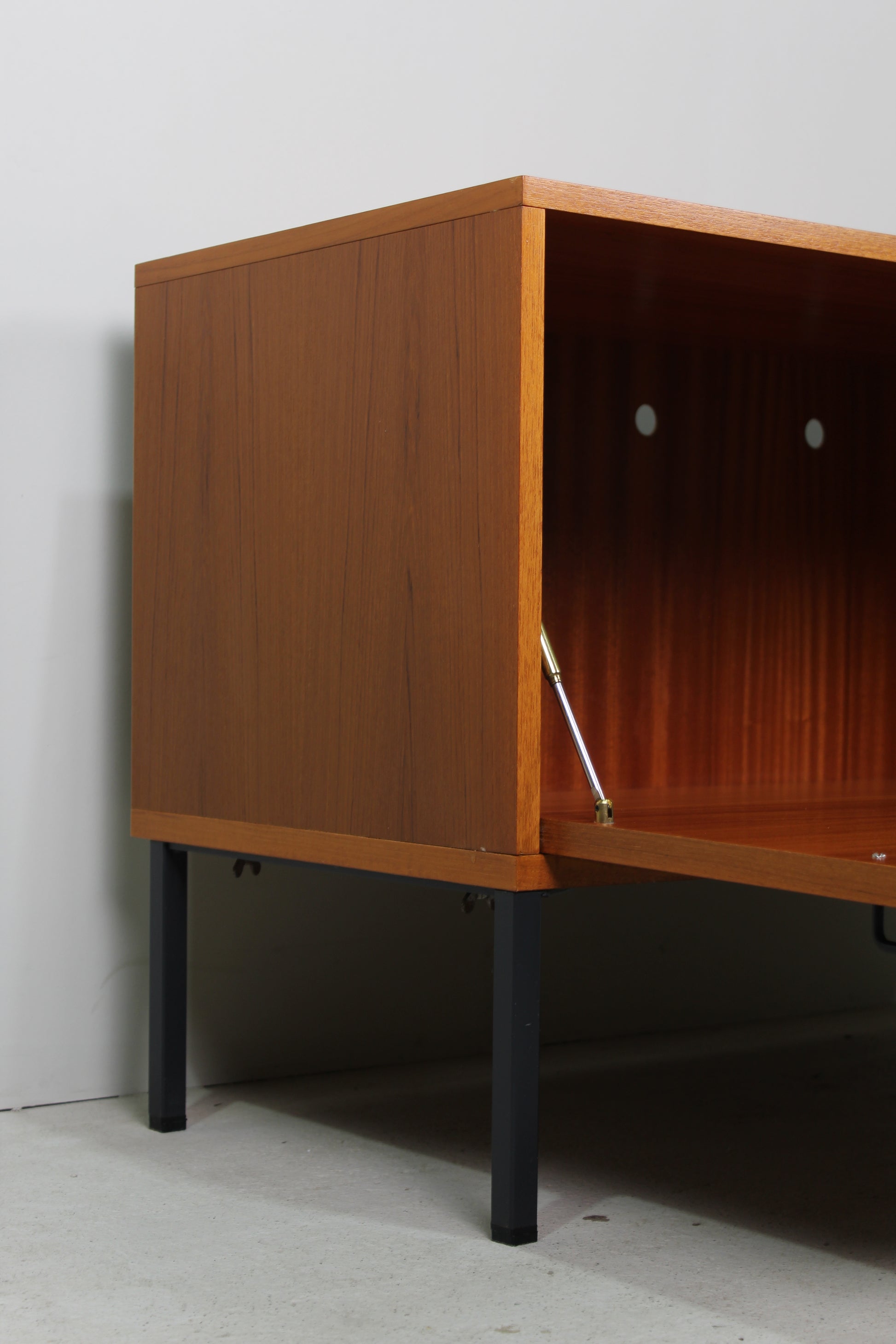 Deze lage vintage kast of sideboard is ontworpen door Günter Renkel voor REGO mobile in de jaren '60. Hij is gemaakt van teak hout en ideaal om te gebruiken als platenspeler kast, audiomeubel of tv-meubel. Hij heeft een grote klepdeur waarachter je veel spullen (en kabels!) kwijt kunt.