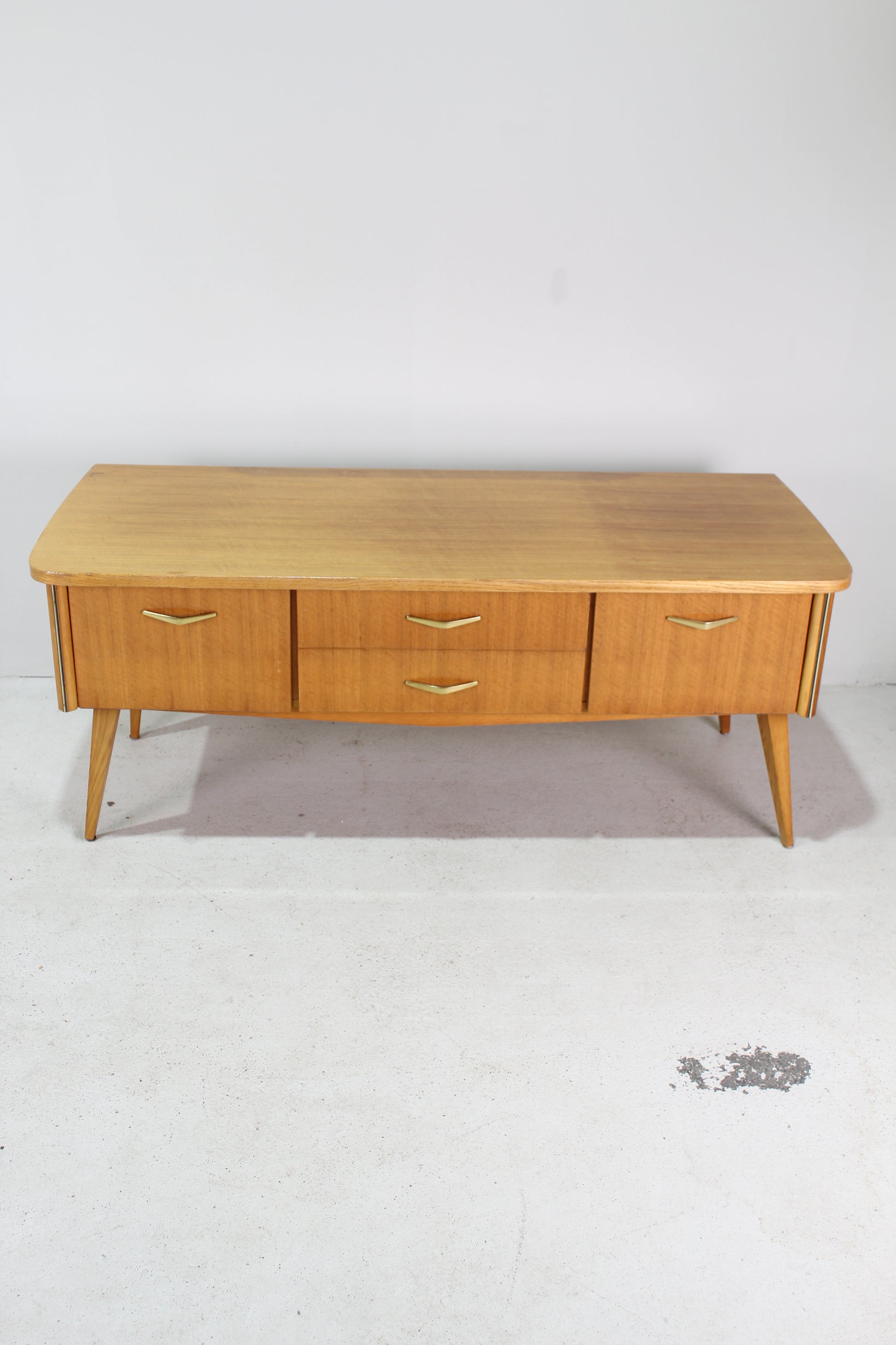 Dressoir, sideboard of tv-meubel uit de jaren '60. Dit mid century meubel is een onderdeel geweest van een kaptafel maar is ideaal om te gebruiken als tv-meubel. Hij is gemaakt van hout heeft een subtiele hoogglans finish en heeft messing grepen. Dit kastje heeft twee lades in het midden en twee klepdeurtjes aan de buitenkanten. Het kastje heeft typische mid century taps toe uitlopende poten en is afgewerkt met een messing randje.
