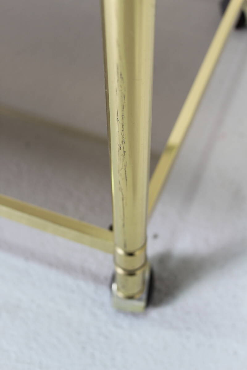 Vintage barcart, serveerwagen of theewagen uit de jaren ’70, gemaakt van messing met dikke rookglas bladen. Deze luxe barcart in hollywood regency stijl is ook perfect om te gebruiken als bijzettafel. Hij staat op wieltjes waardoor hij makkelijk te verplaatsen is.
