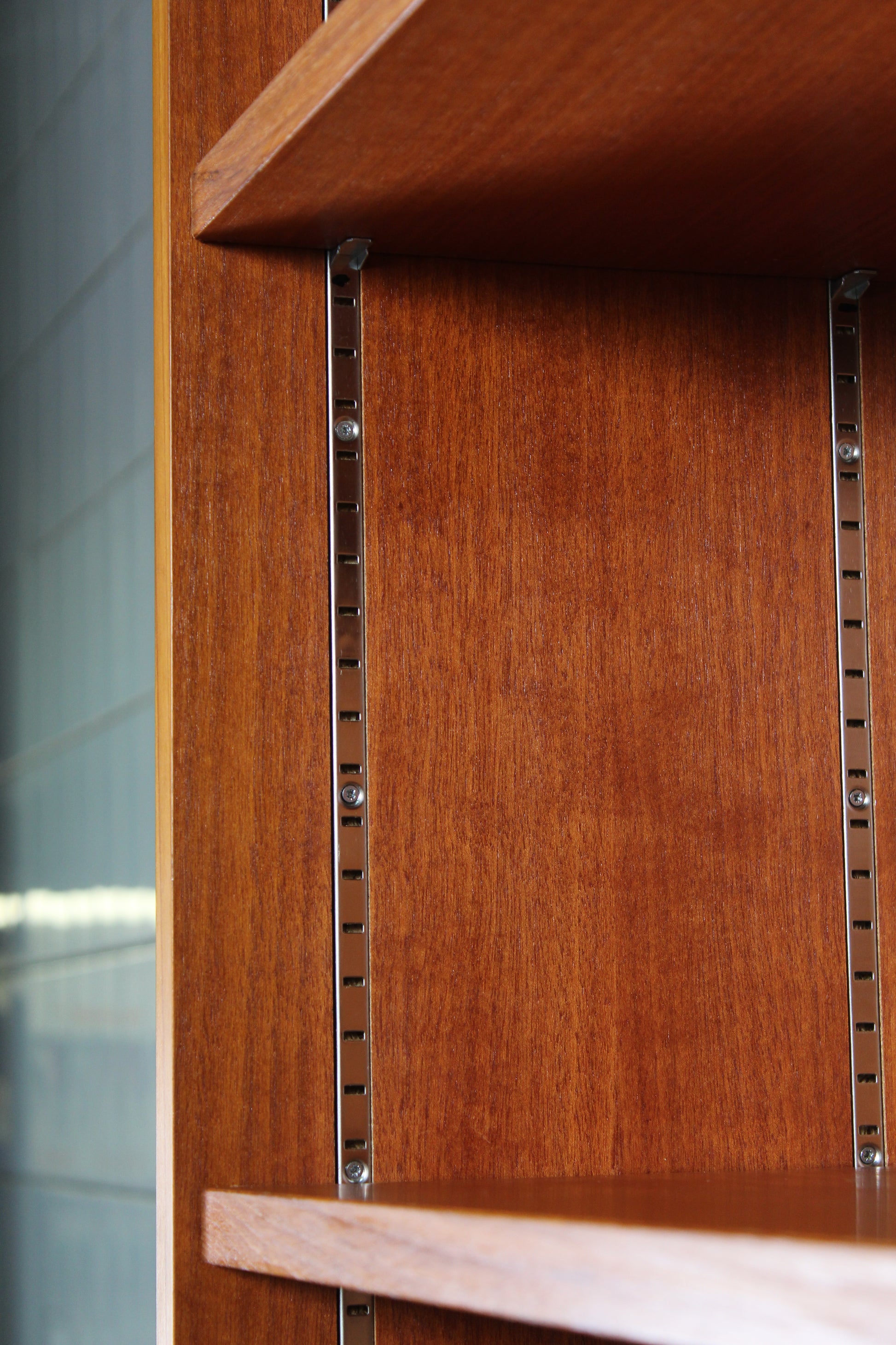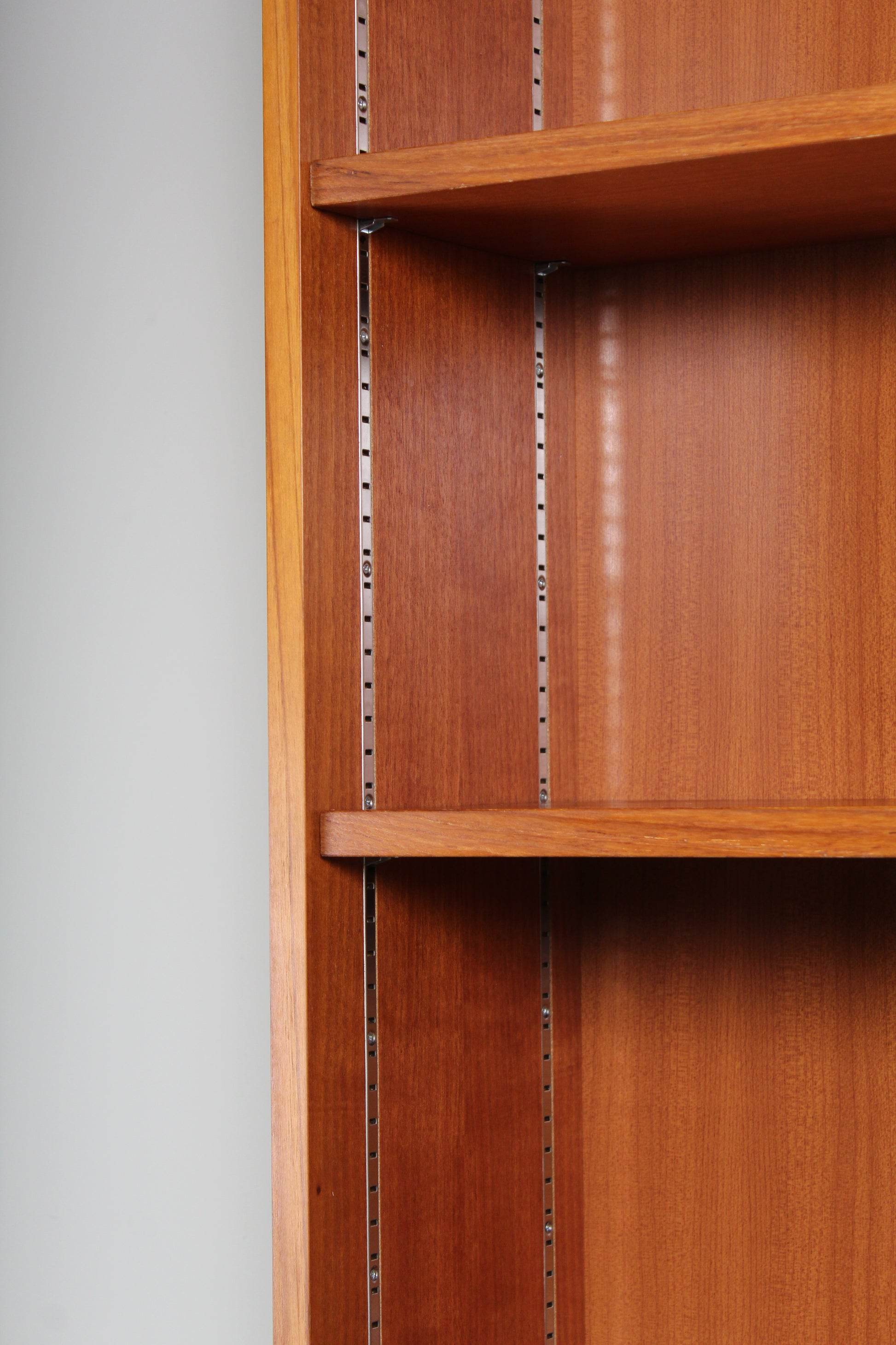 Van deze boekenkast hebben we drie stuks op voorraad. Hij heeft namelijk gediend als één boekenkastwand. De vorige eigenaresse uit Düsseldorf heeft er maar liefst ruim 60 jaar gebruik van gemaakt en toch zijn ze nog in zeer goede staat. De legplanken kun je in hoogte verplaatsen. De kast is tweedelig: het boekendeel staat bovenop het dressoir met de schuifdeuren.