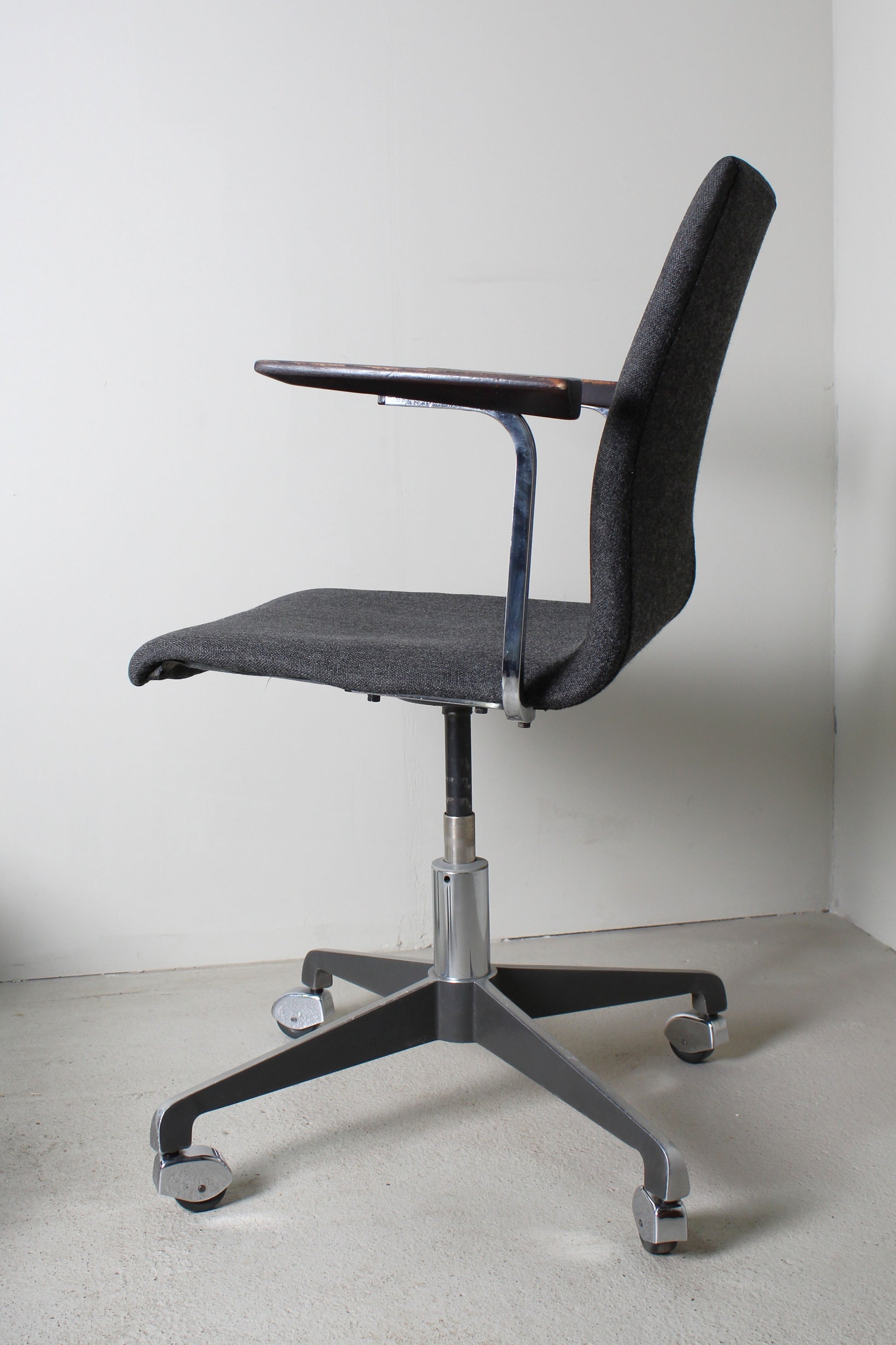 Donkergrijze vintage bureaustoel uit de jaren '60, in goede conditie. Gemaakt van metaal, met houten armleuningen. De stof is nog in goede staat, en hij rolt nog goed.