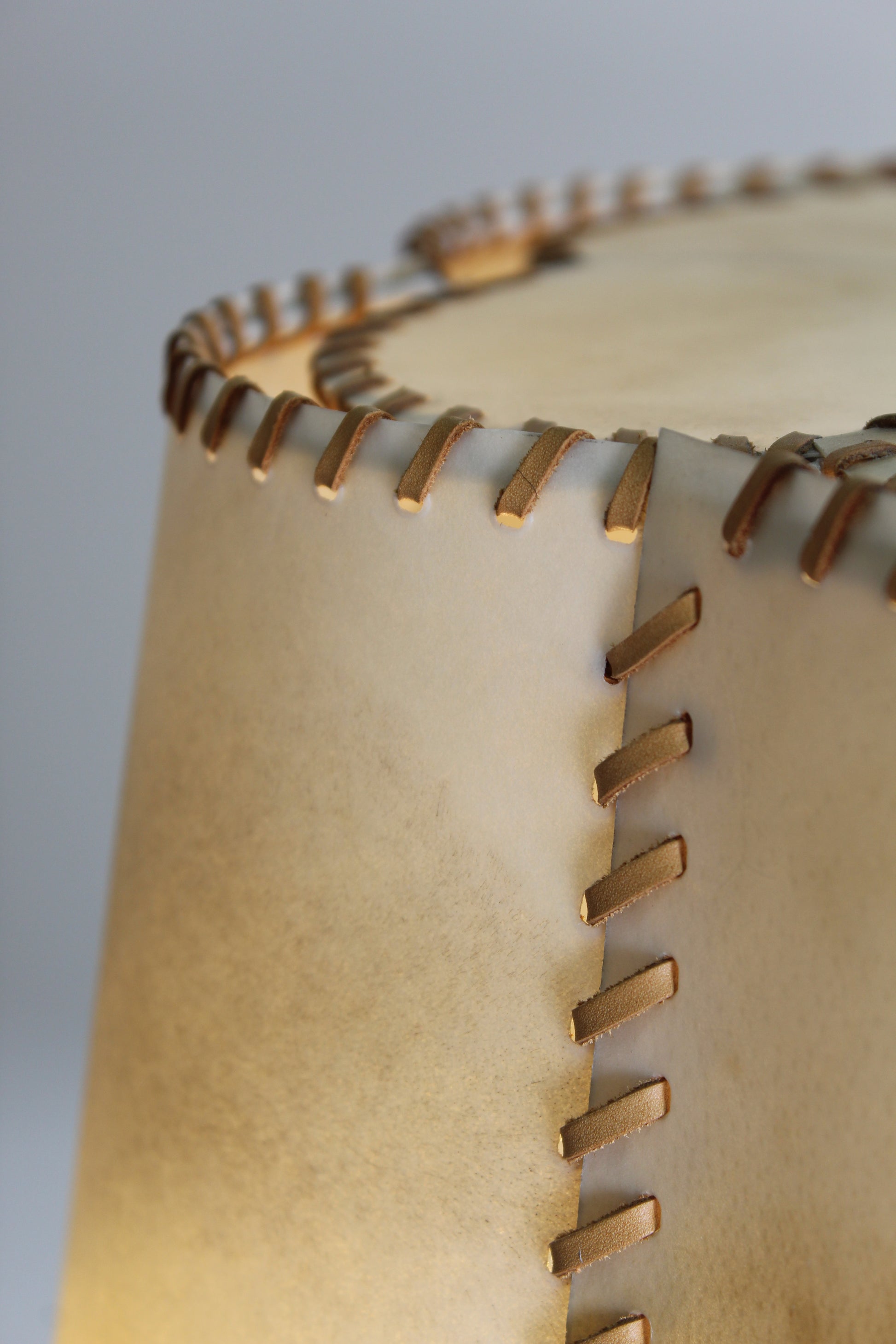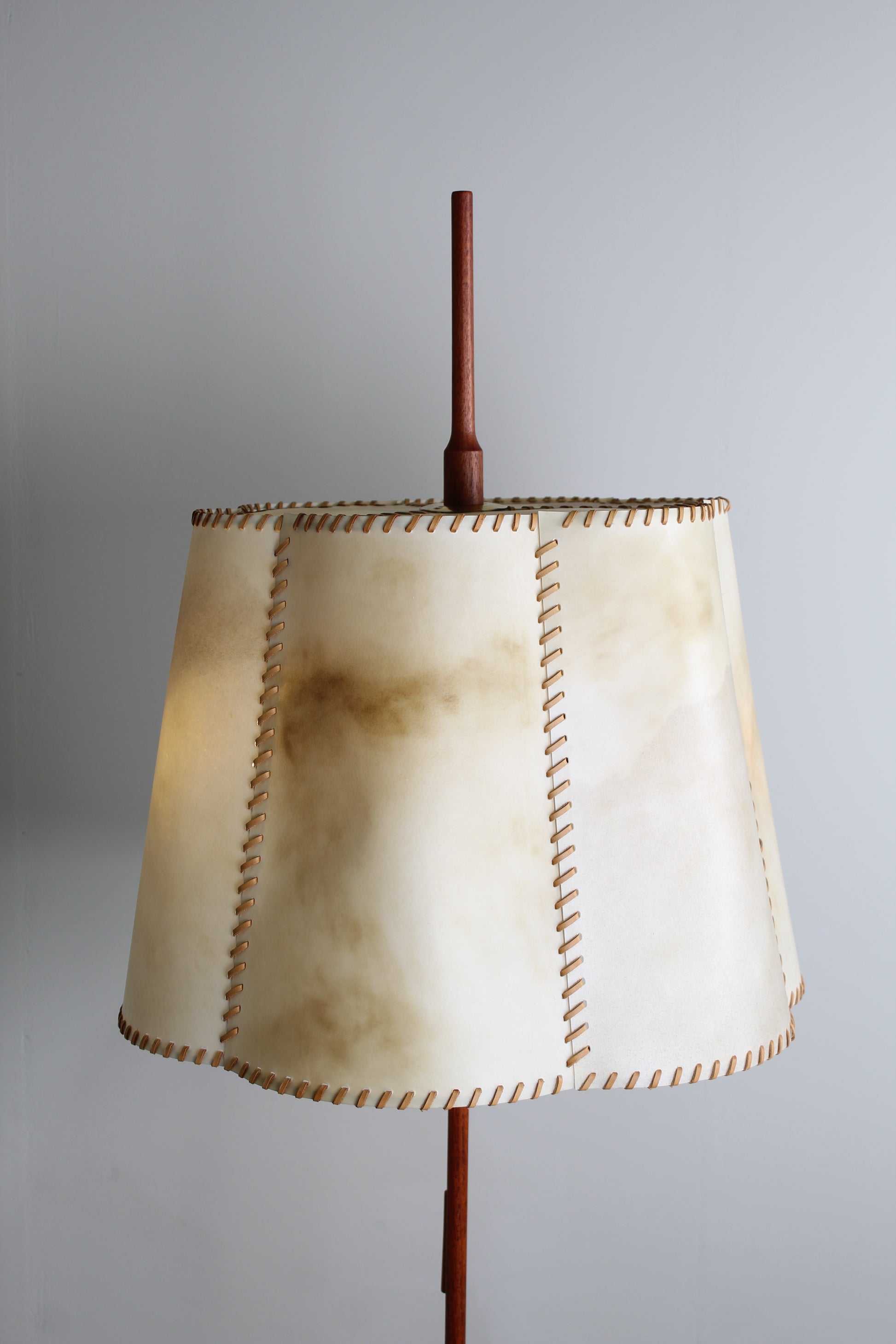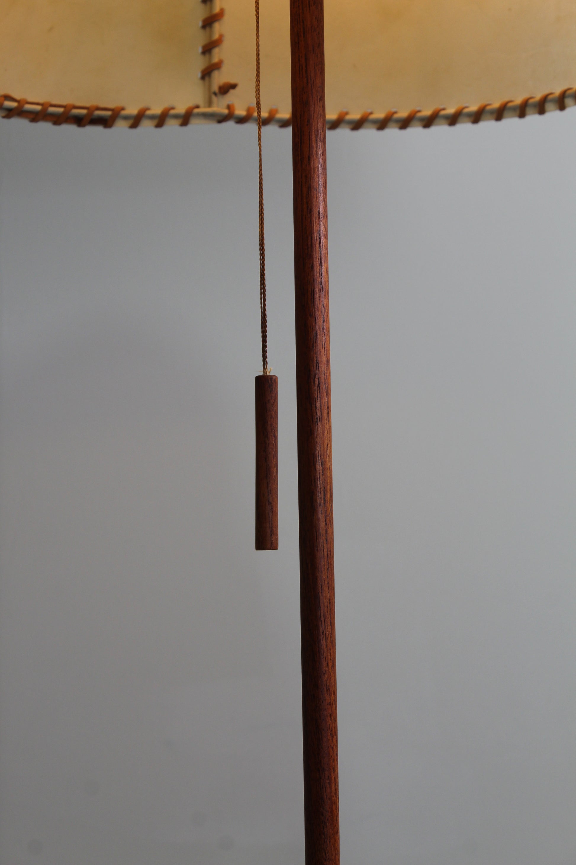 Mid century modern vloerlamp uit de jaren '60. Gemaakt van teak hout met een lederen kap. Waarschijnlijk is de lampenkap niet origineel, maar past wel goed bij de lamp. De fittingen zijn vernieuwd. De schakelaar zit aan het snoer op de grond, zodat je hem eenvoudig met je voet aan en uit kunt doen.
