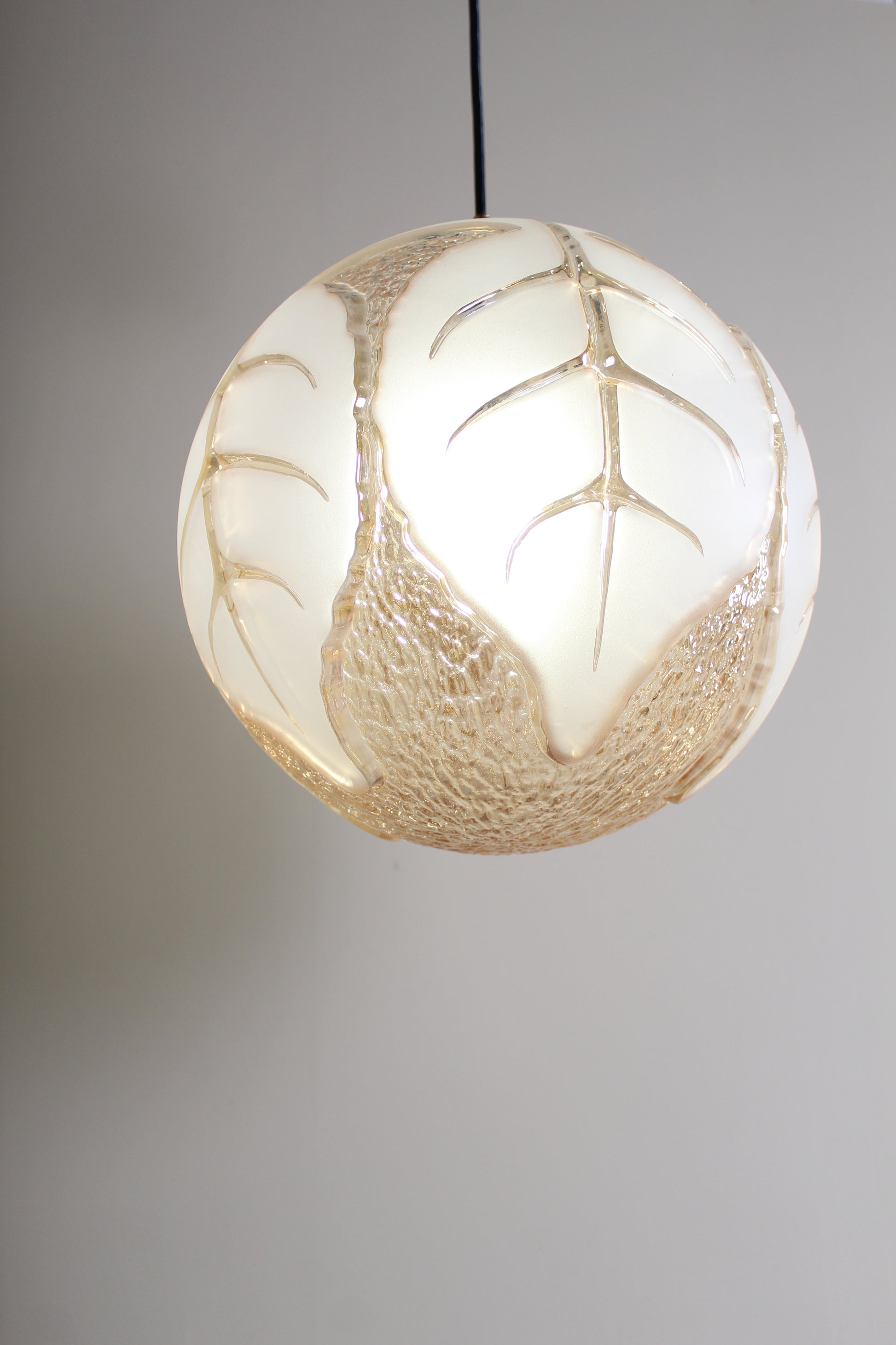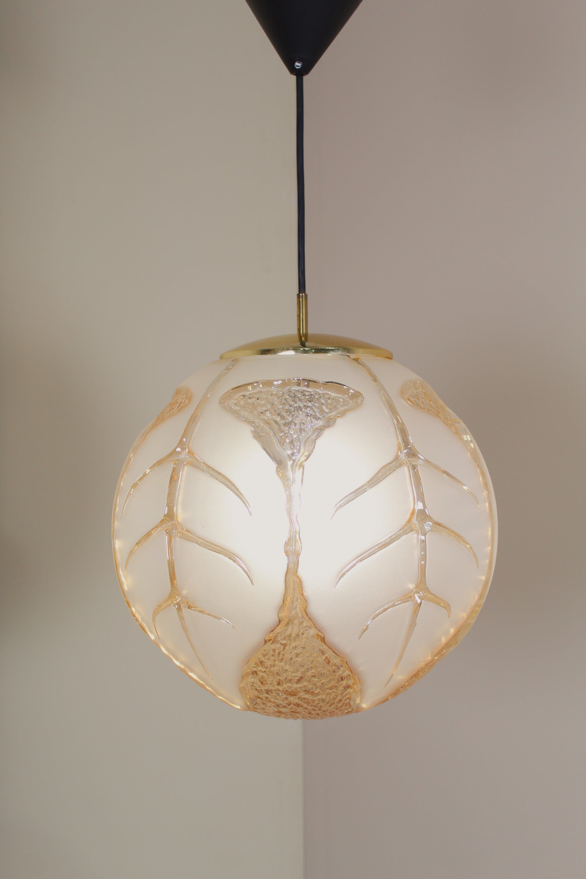 Deze geweldige grote, zware design hanglamp of bollamp is van Peill & Putzler. Deze zeldzame bollamp of globe, heeft kenmerkende matte bladeren van glas en amberkleuren. Hij komt uit de jaren '70 en is van topkwaliteit.