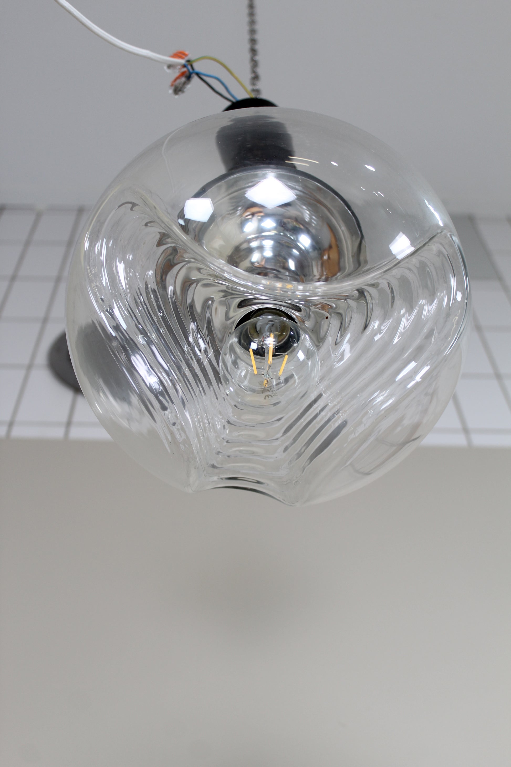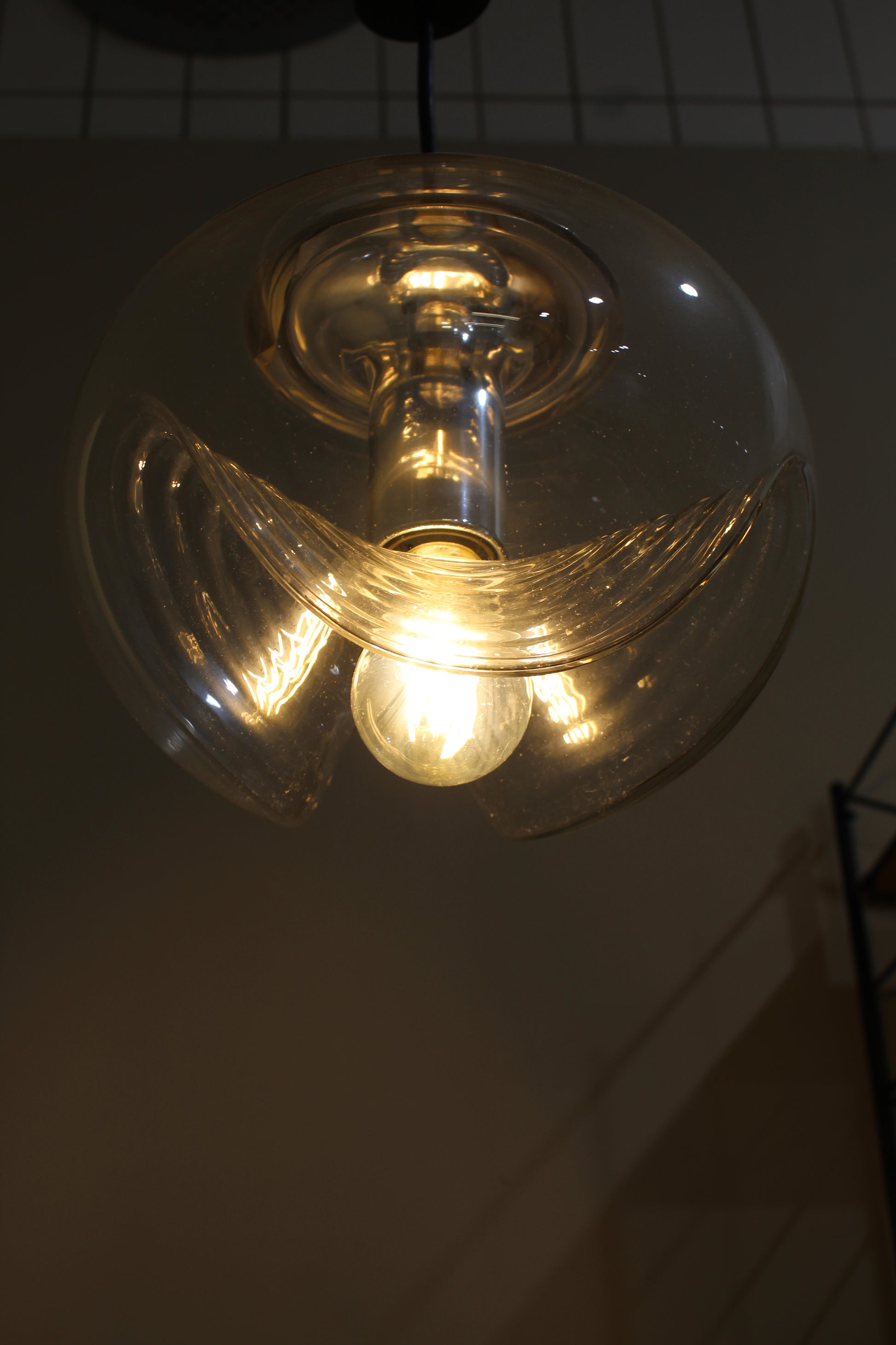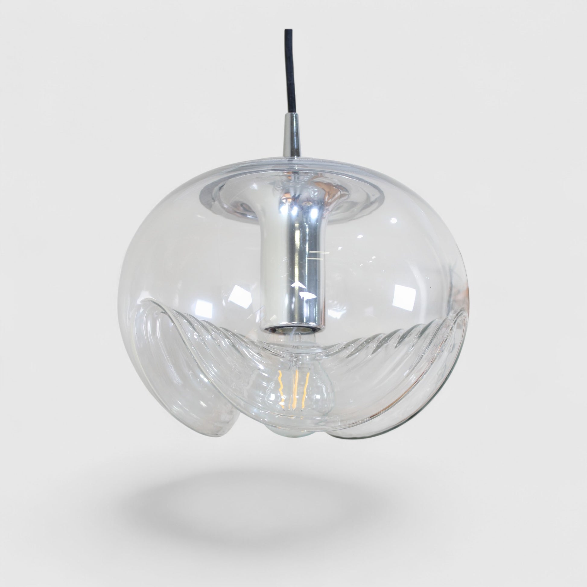 Deze typische jaren '70 hanglamp van glas, is ontworpen door Koch & Lowy. De naam van de lamp is 'Futura' maar hij wordt ook wel de Wave lamp genoemd. Het vooraanstaande bedrijf Peill & Putzler heeft hem geproduceerd. Uiteraard verwijst de naam naar het bijzondere glas met golven, die zorgen voor een fraaie lichttekening op de muren. De details zijn van chroom.