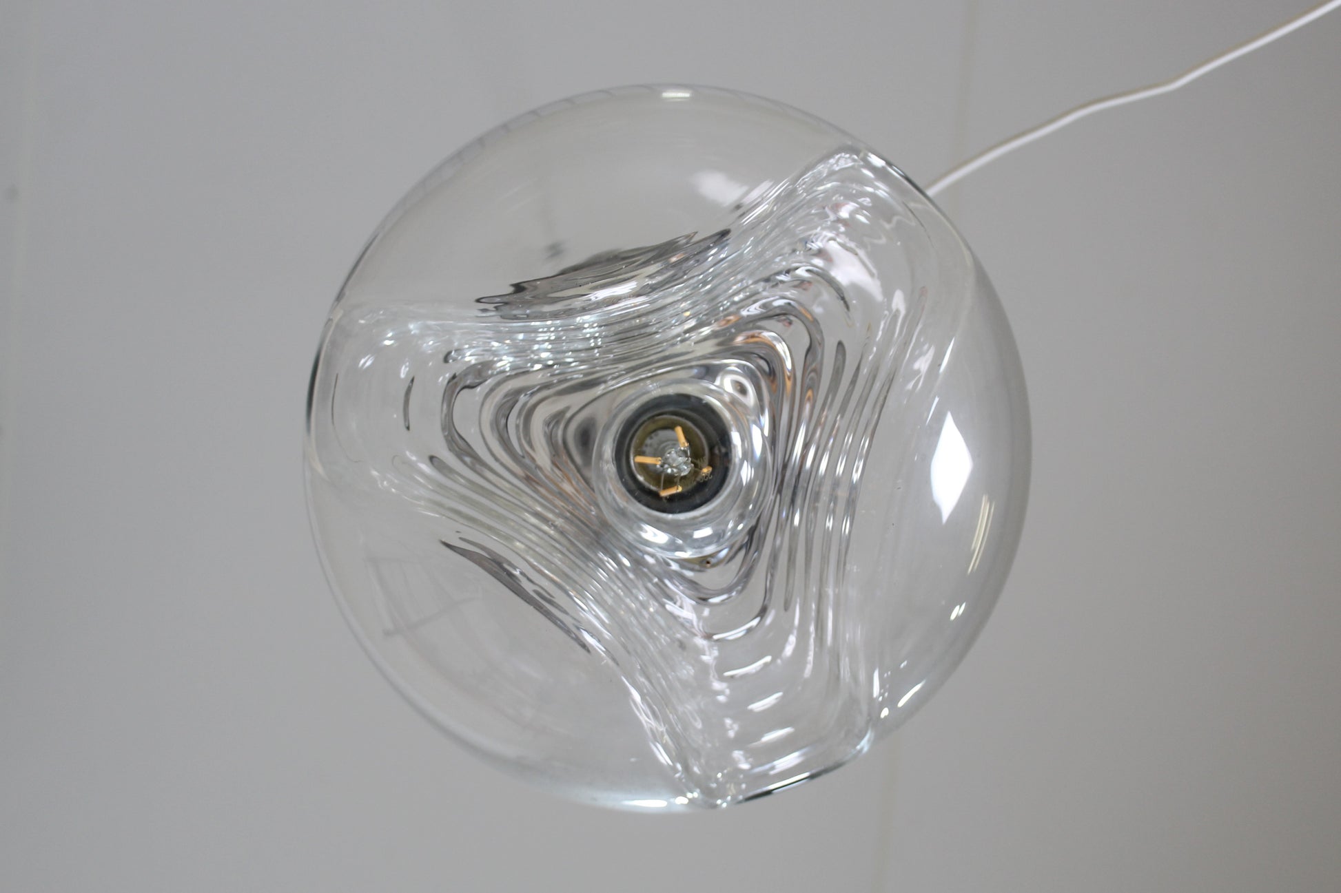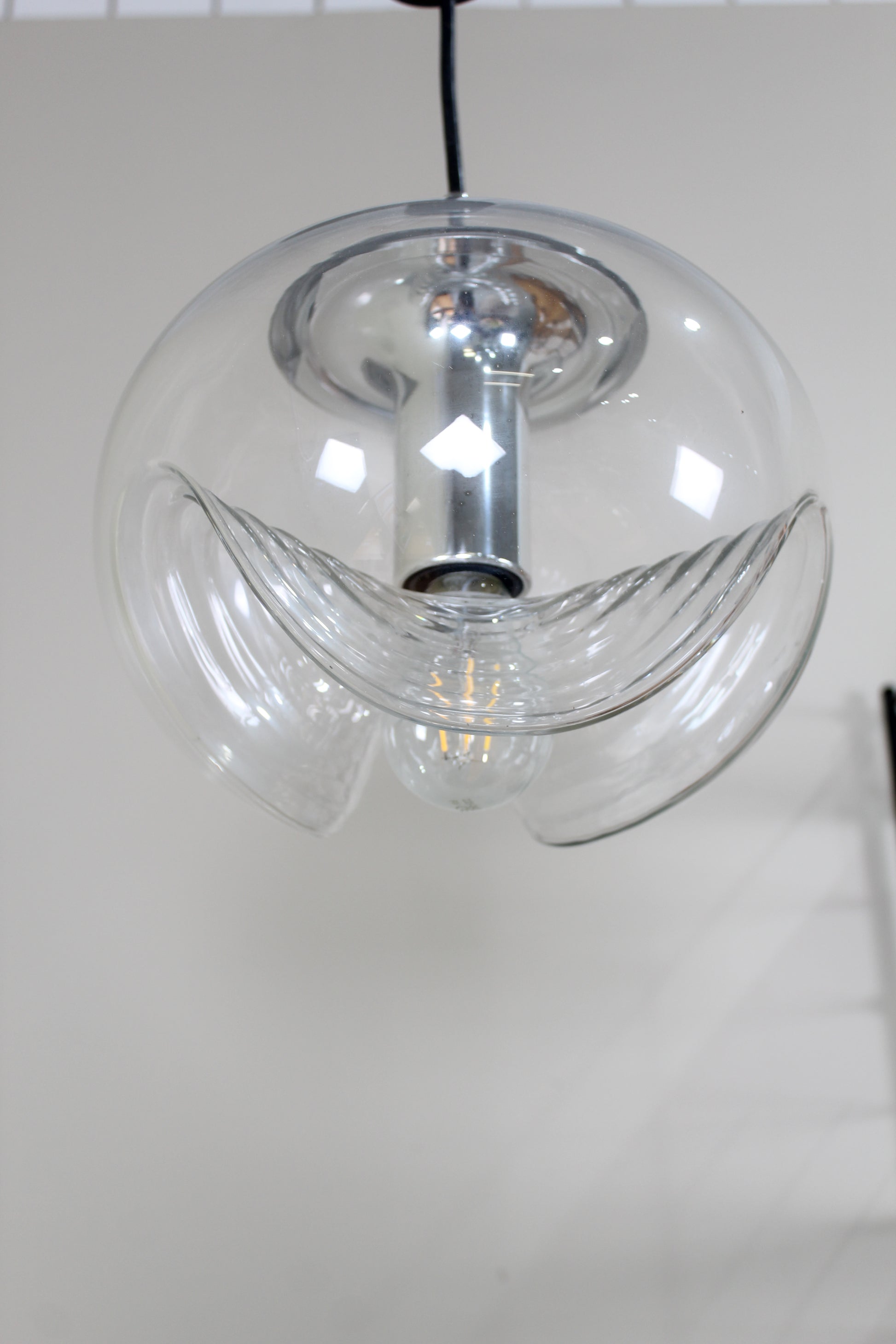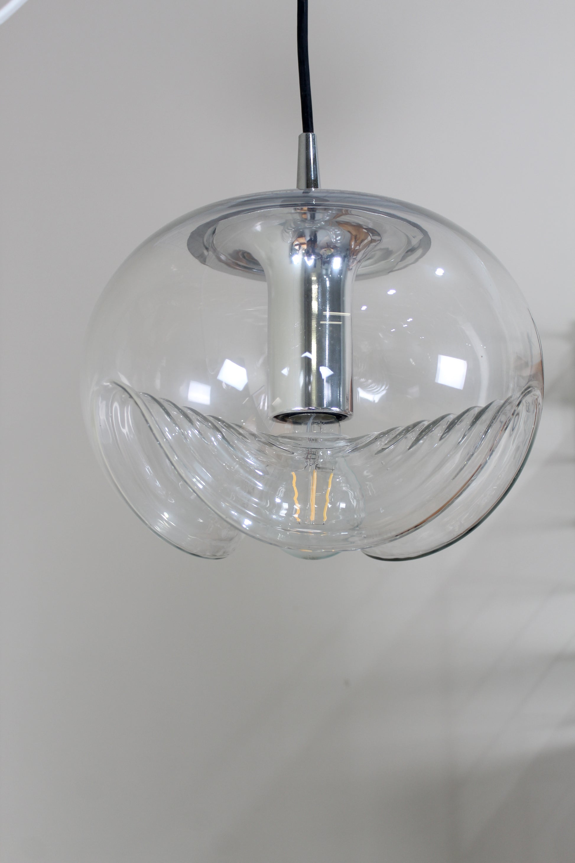 Deze typische jaren '70 hanglamp van glas, is ontworpen door Koch & Lowy. De naam van de lamp is 'Futura' maar hij wordt ook wel de Wave lamp genoemd. Het vooraanstaande bedrijf Peill & Putzler heeft hem geproduceerd. Uiteraard verwijst de naam naar het bijzondere glas met golven, die zorgen voor een fraaie lichttekening op de muren. De details zijn van chroom.