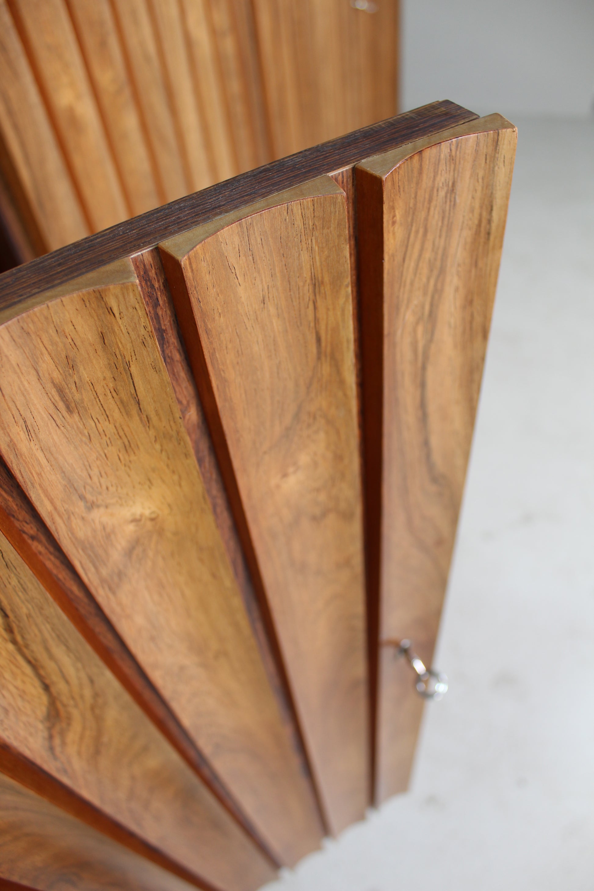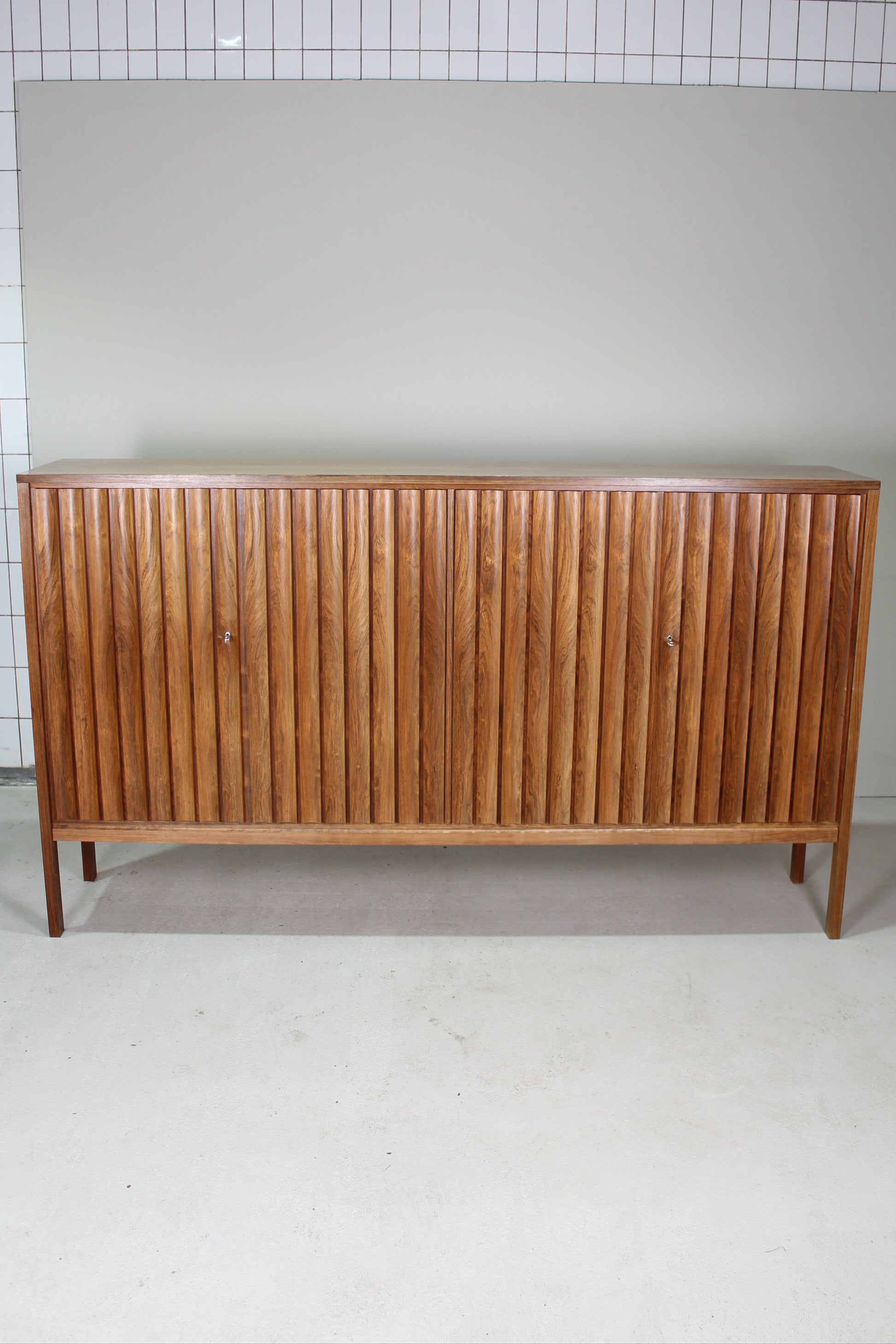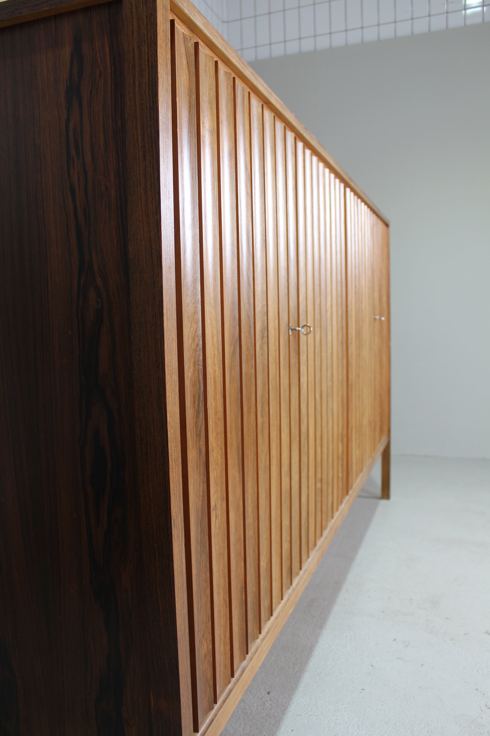 Grote mid century design sideboard, wandkast of buffetkast ontworpen door Leo Bub in de jaren '60. Dit geweldige highboard is van hoogwaardige, zware kwaliteit. De design kast is gemaakt van palissanderhout en verkeert in top staat. De deurtjes hebben verticale rond bewerkte latjes, wat helemaal past in een modern interieur.