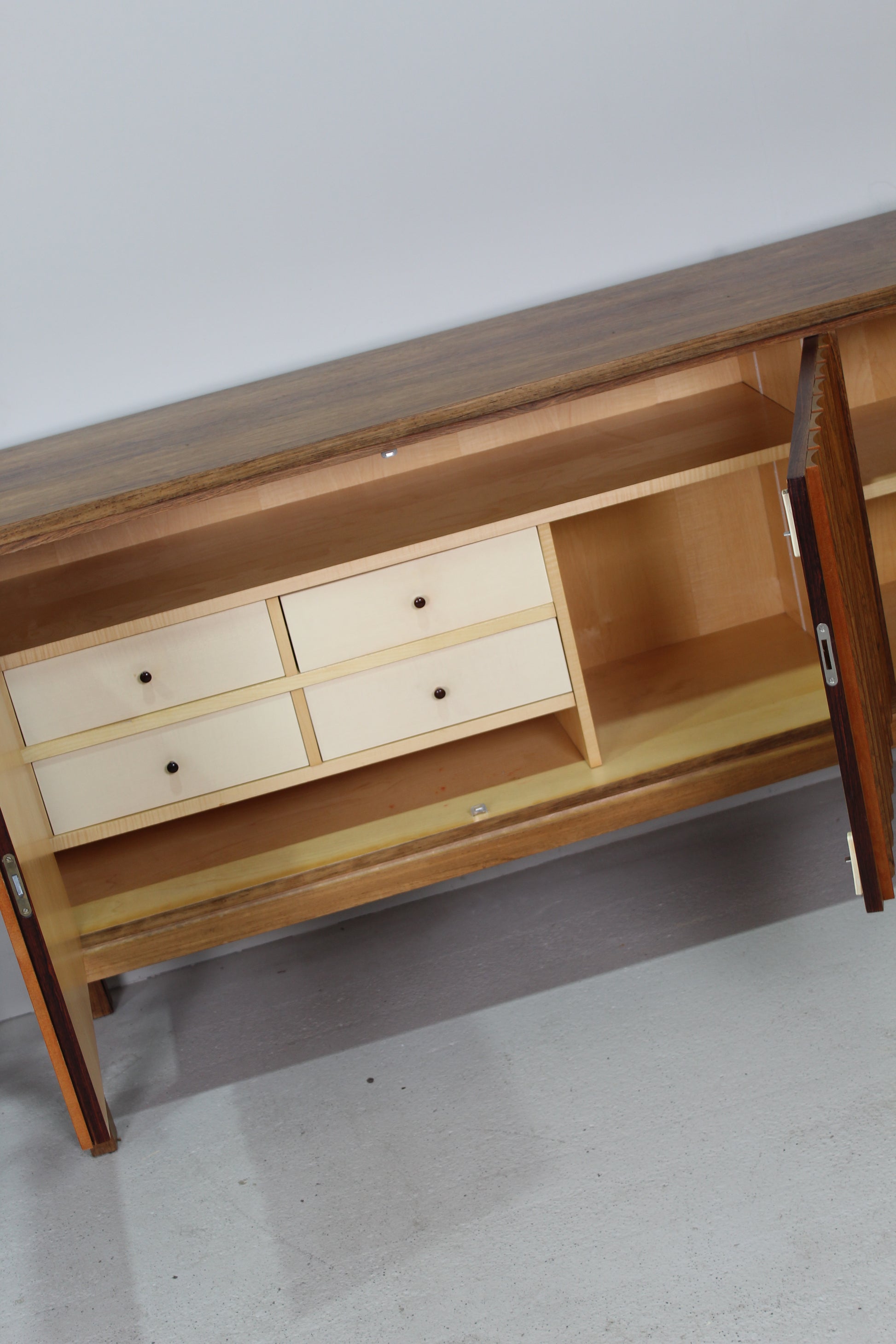 Mid century design sideboard of dressoir ontworpen door Leo Bub in de jaren '60. Dit geweldige dressoir is van hoogwaardige, zware kwaliteit. De design kast is gemaakt van palissanderhout en verkeert in top staat. De deurtjes hebben verticale latjes, wat helemaal past in een modern interieur.