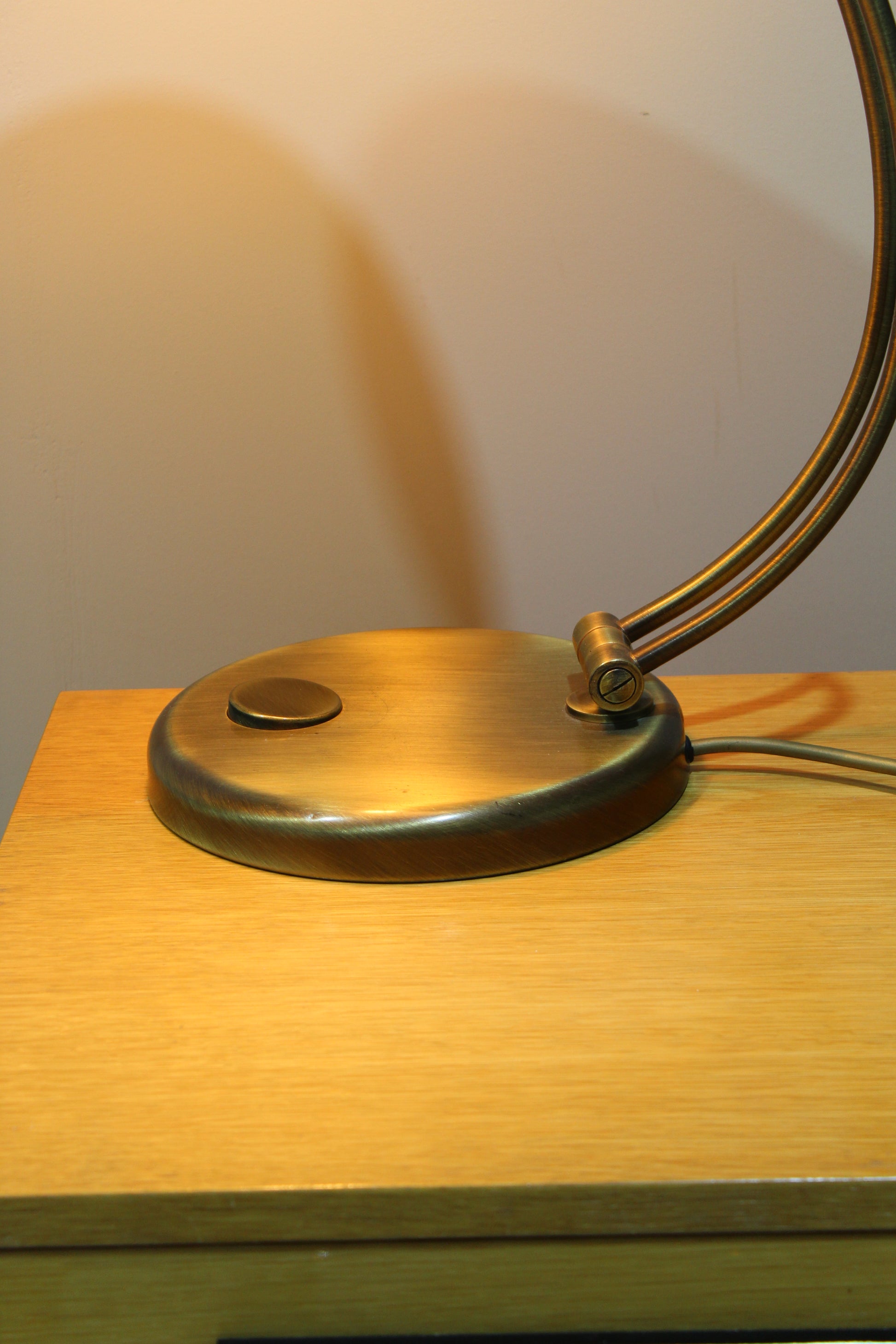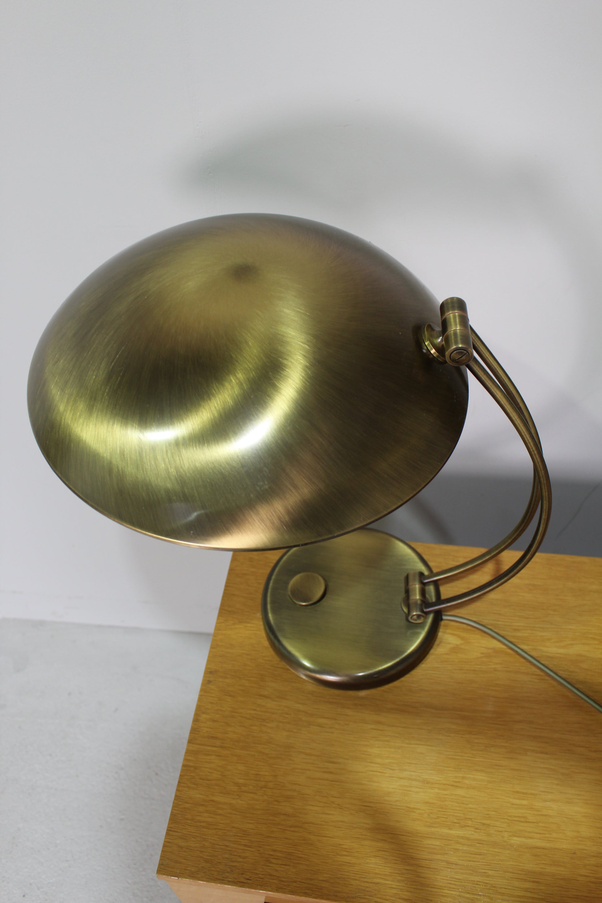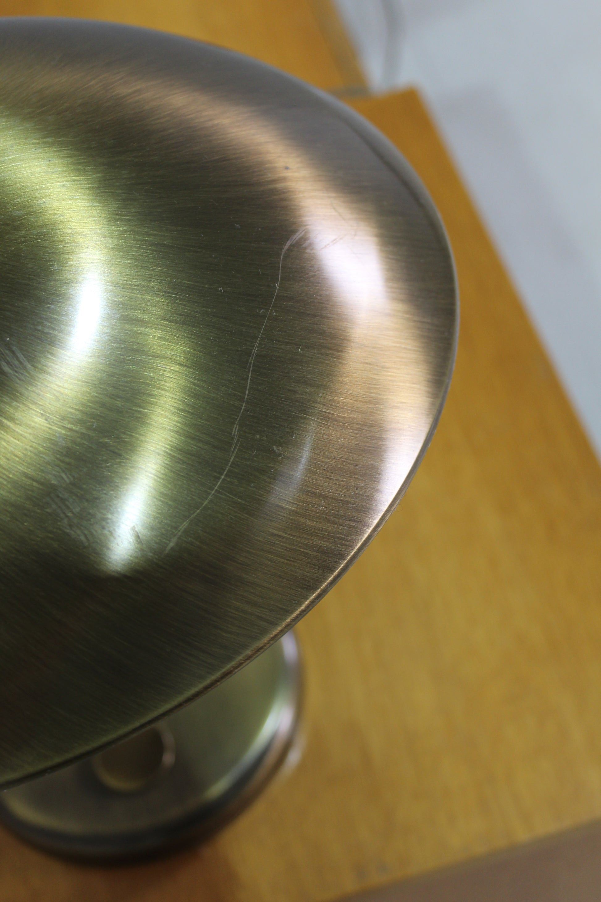 Deze geweldig vormgegeven tafellamp van zware kwaliteit komt vermoedelijk uit de jaren '70 en is gemaakt van geborsteld messing. Deze bureaulamp is ontworpen door Egon Hillebrand.