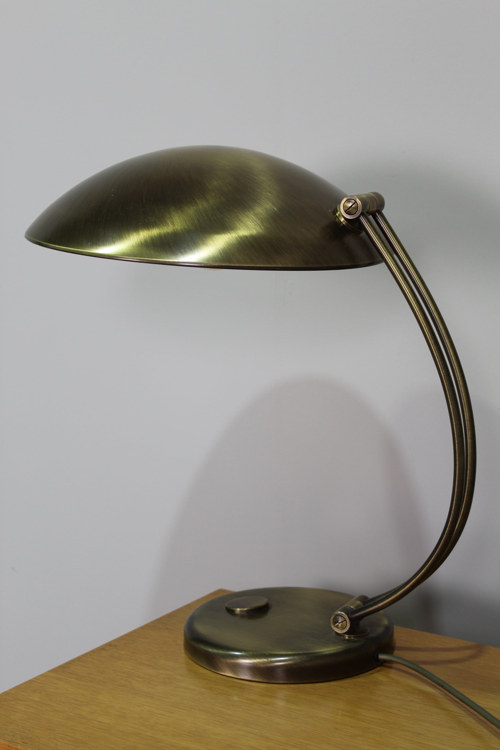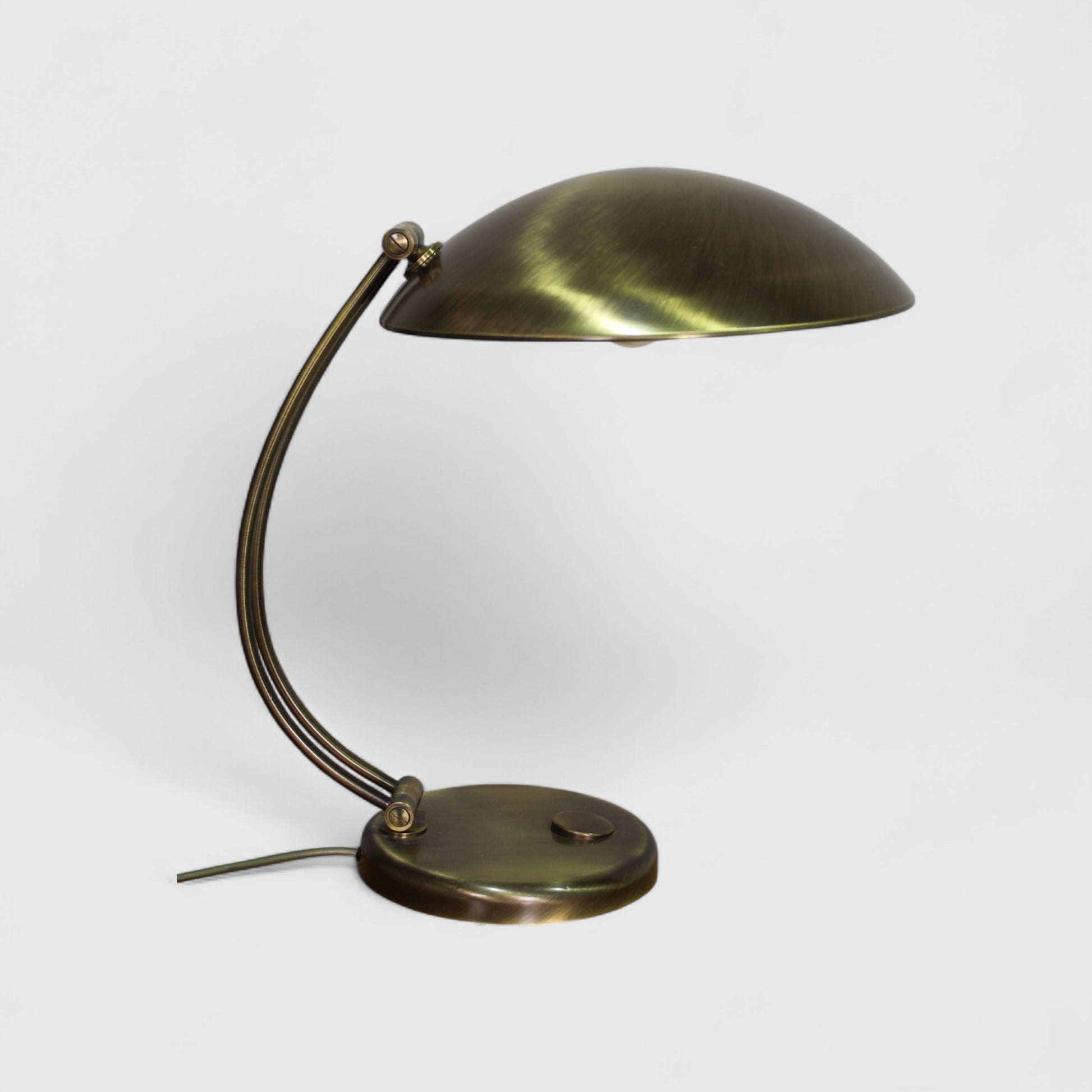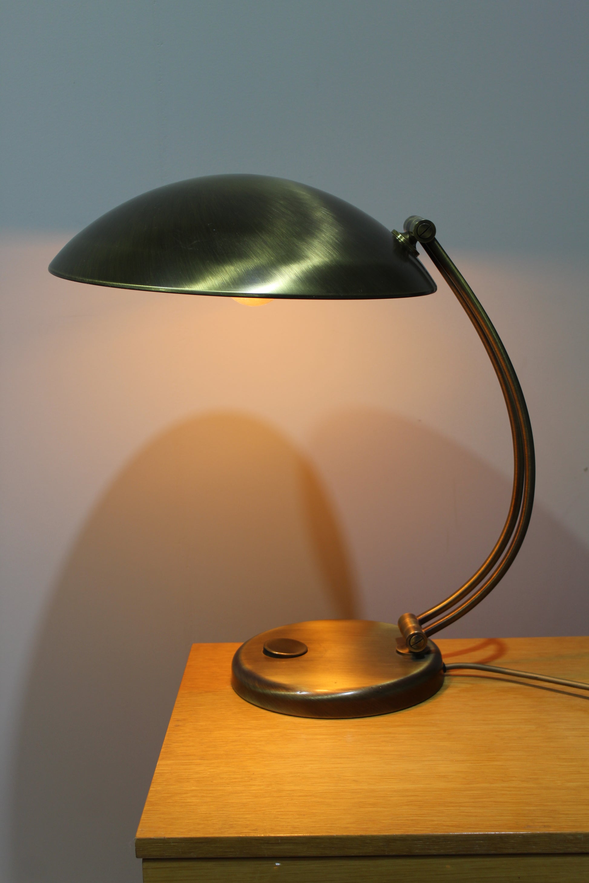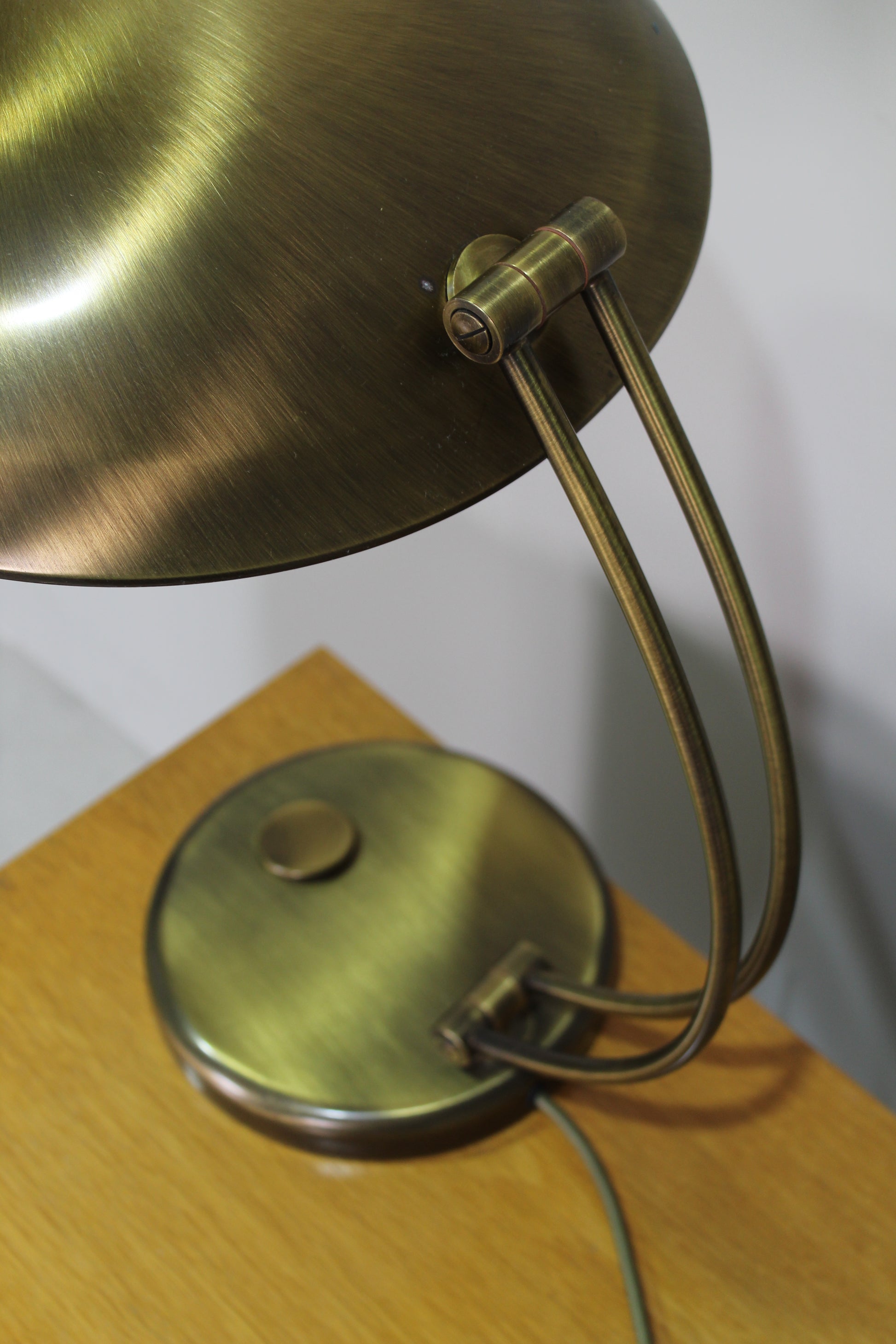Deze geweldig vormgegeven tafellamp van zware kwaliteit komt vermoedelijk uit de jaren '70 en is gemaakt van geborsteld messing. Deze bureaulamp is ontworpen door Egon Hillebrand.