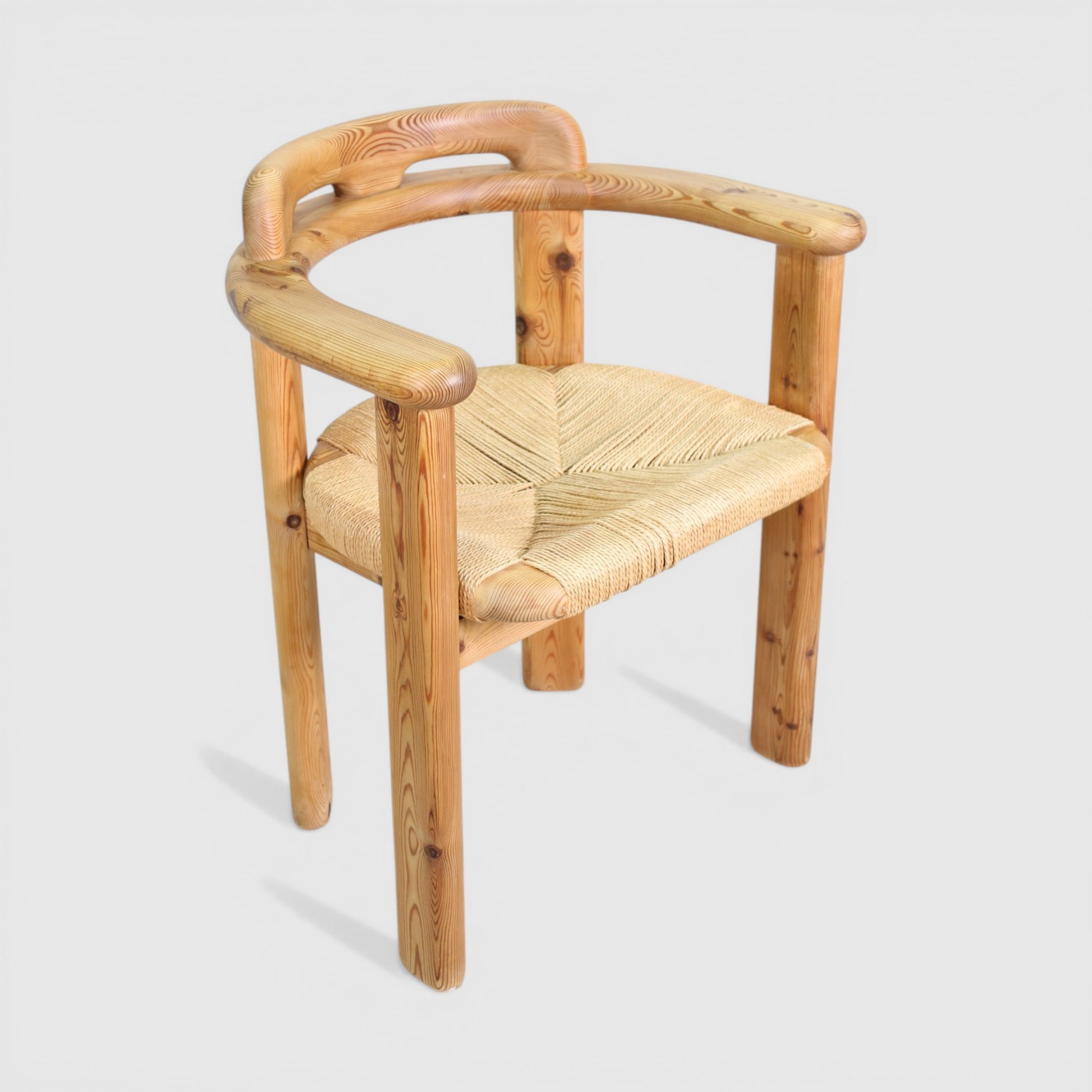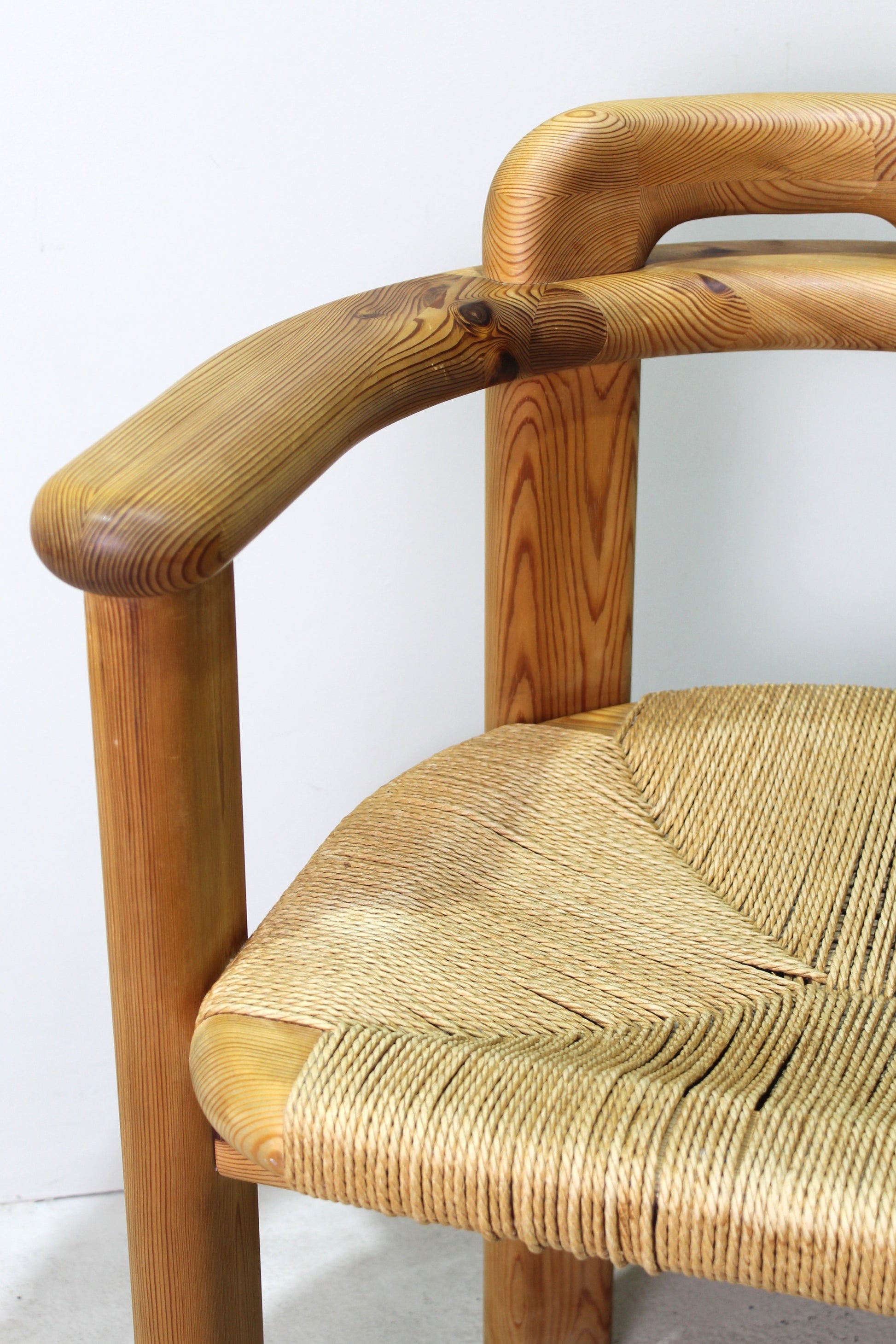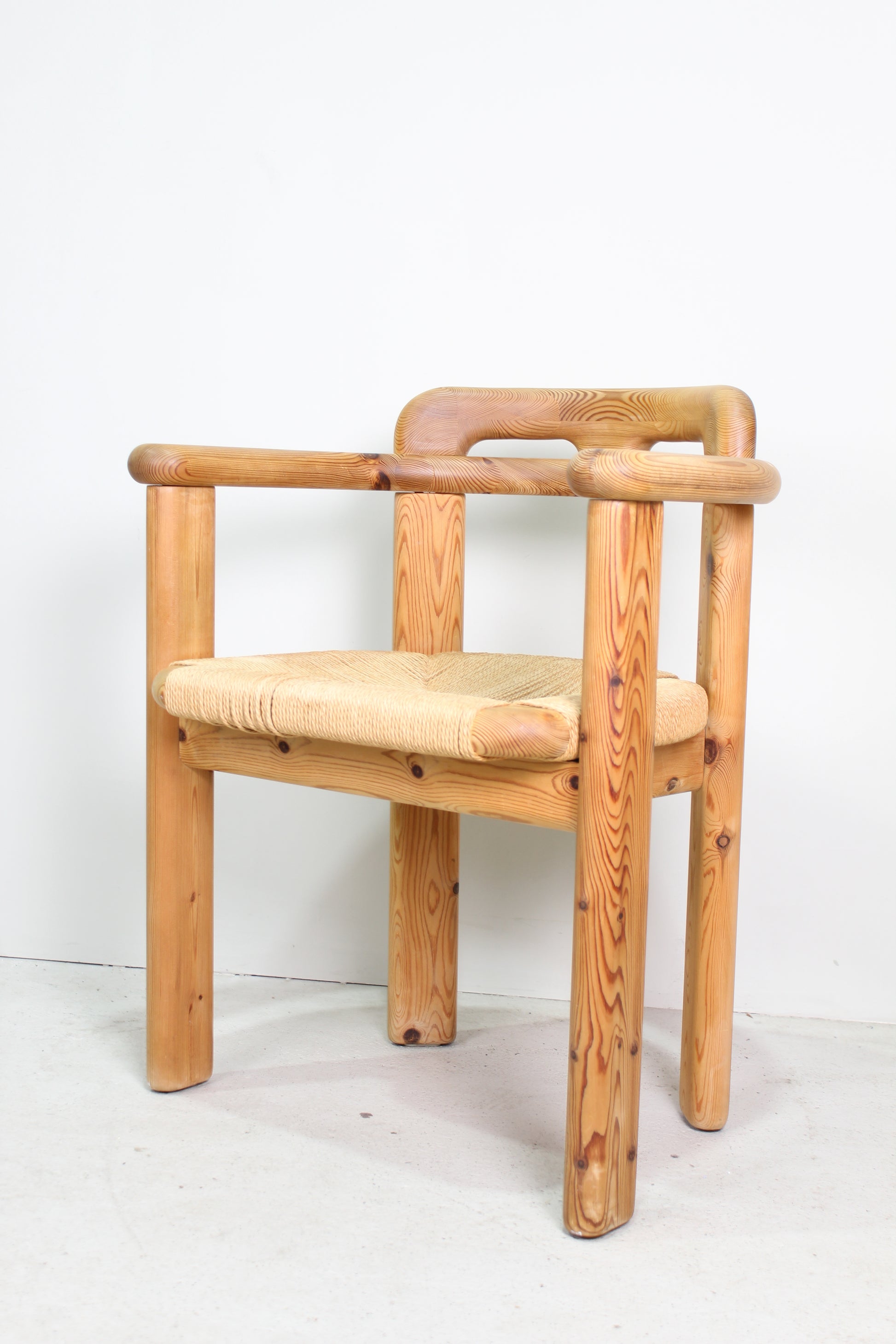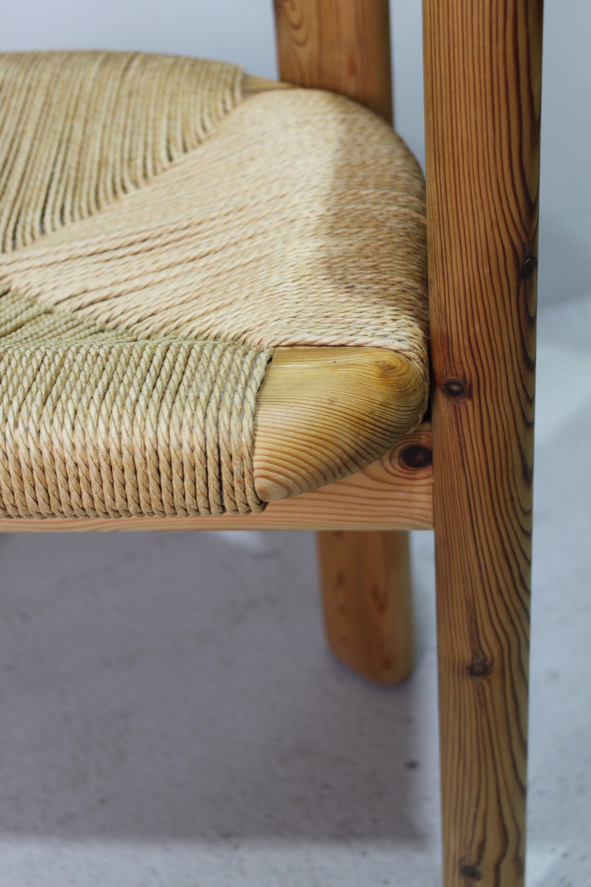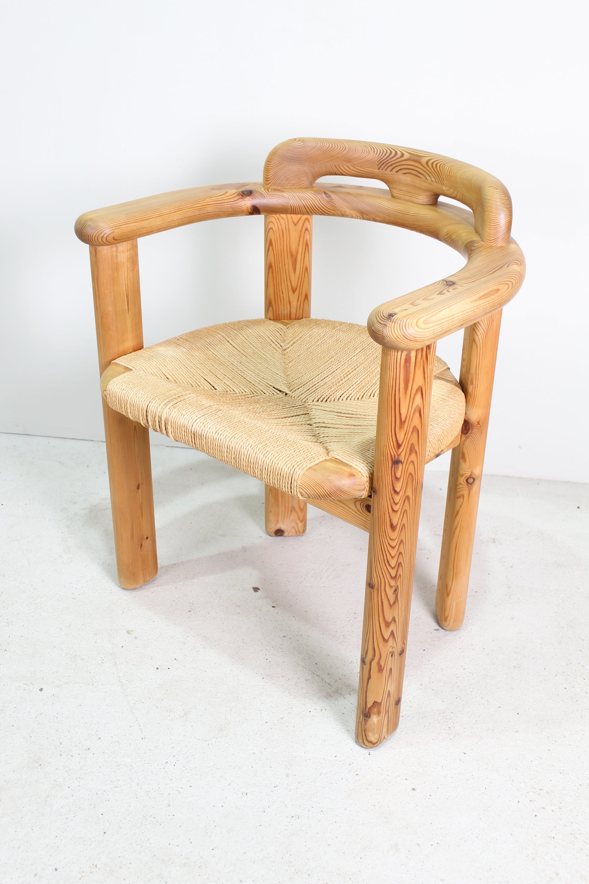 Deze massief grenen eetkamerstoel komt uit de jaren '70. Deze Scandinavische stoel is gemaakt in Rainer Daumiller stijl, en heeft een papercord zitting. Deze bijzondere houten stoel is heeft geweldige ronde afwerkingen.