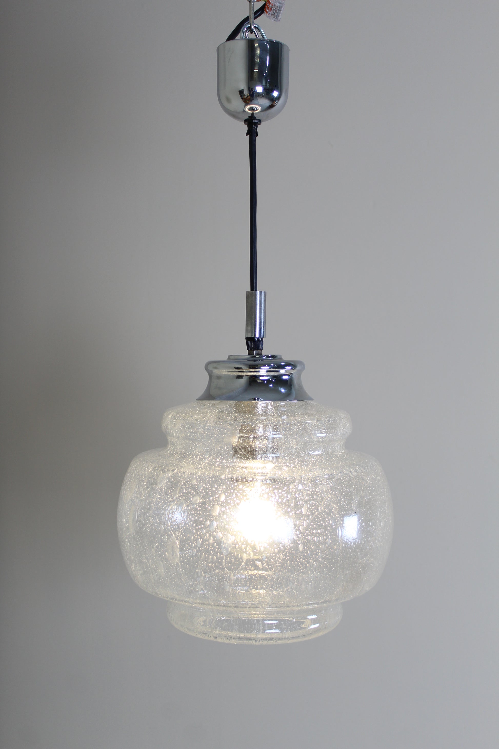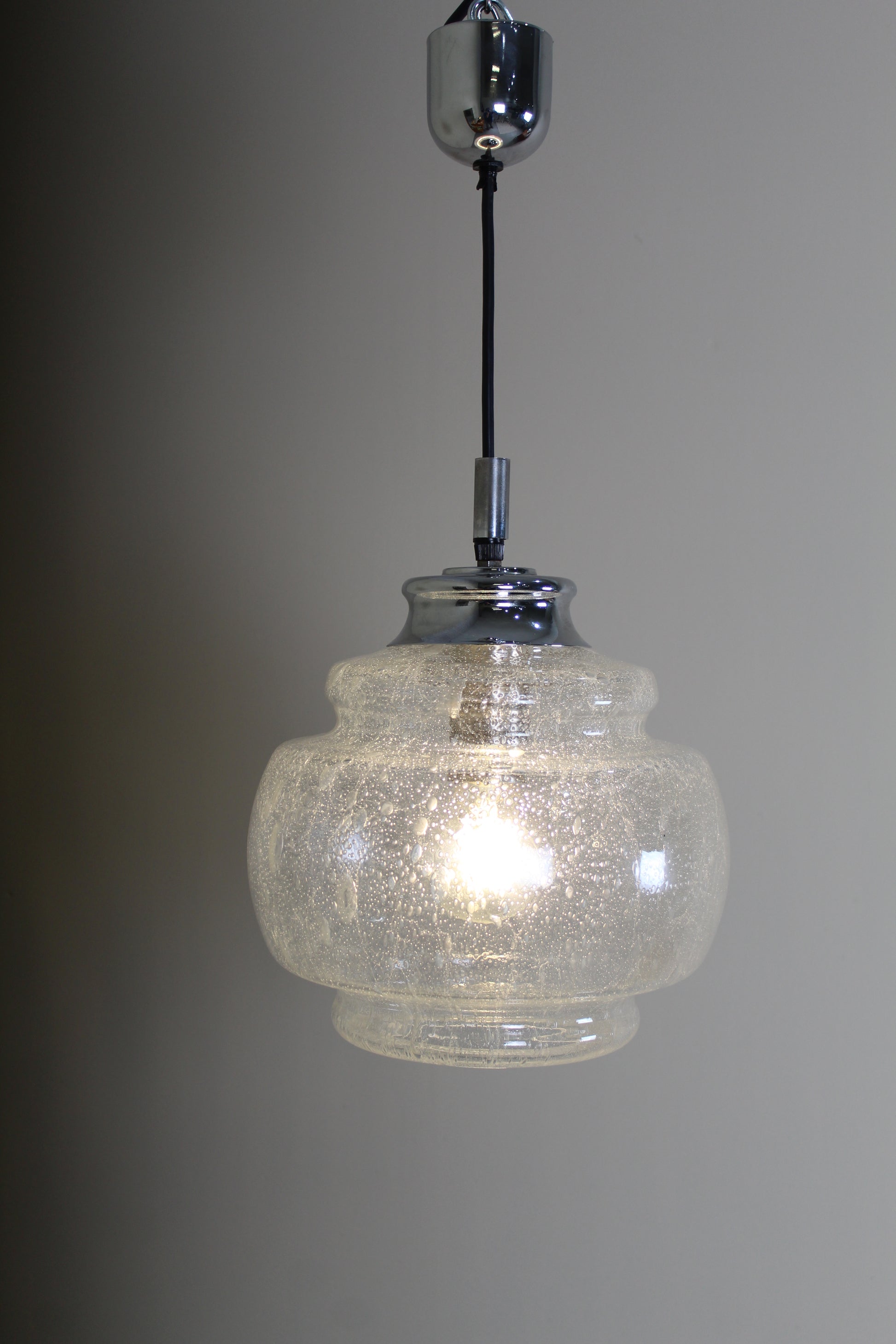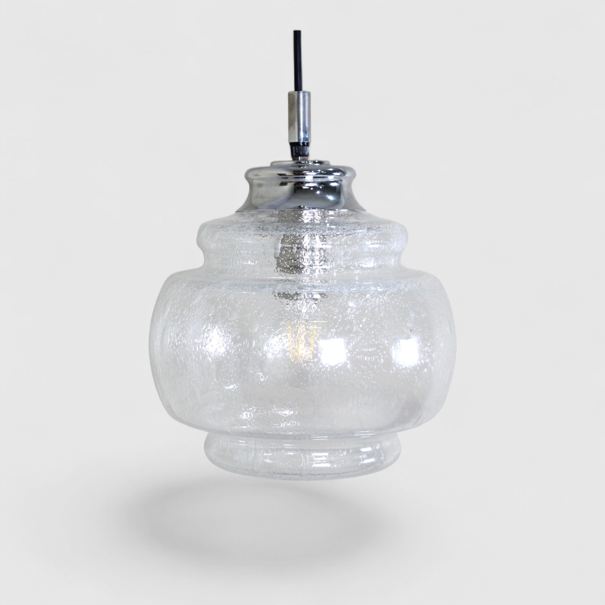 Mid century hanglamp uit de jaren '60 gemaakt van glas en chroom. Het glas is mondgeblazen en heeft geweldige bubbels die zorgen voor een magisch licht. De maker is helaas onbekend.