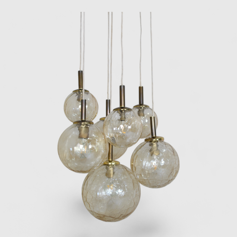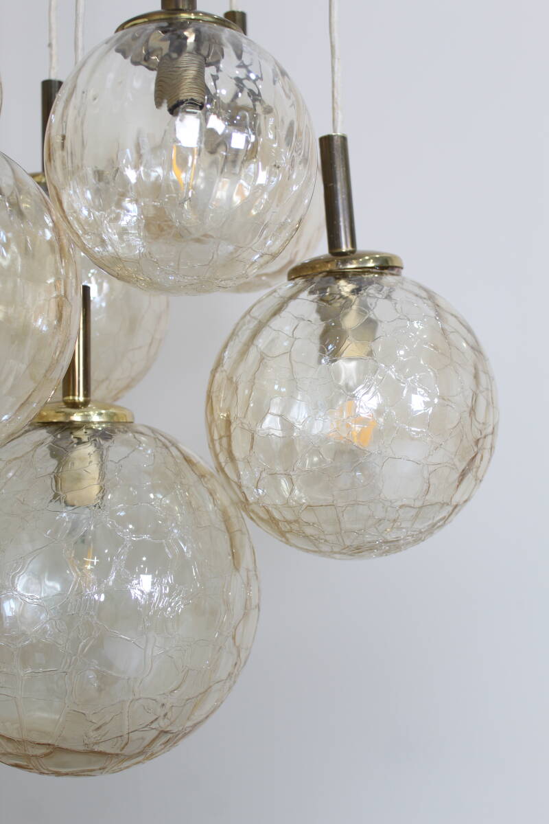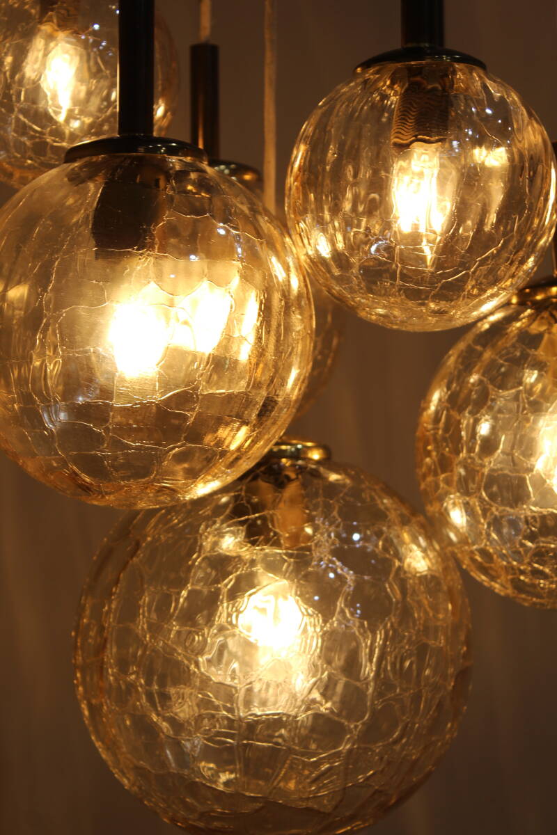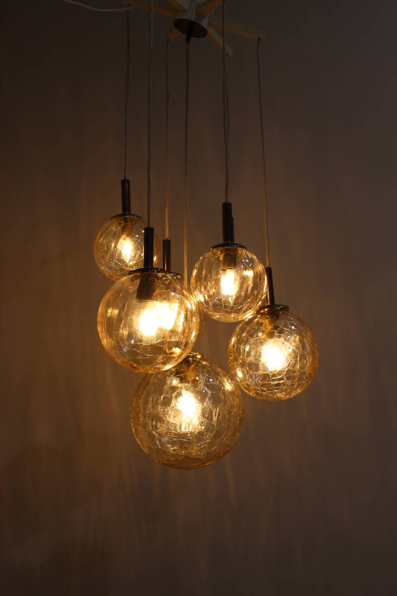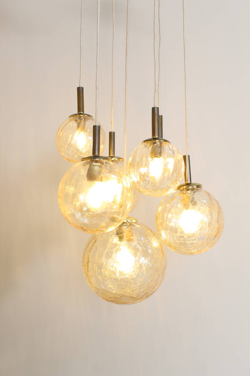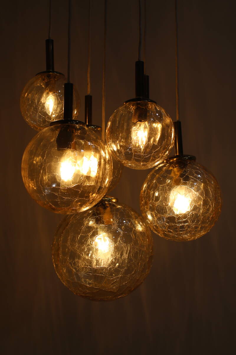01367 Deze originele hanglamp uit de jaren '70 is een prachtige eyecatcher met een unieke retro uitstraling. De lamp bestaat uit verschillende glazen bollen in uiteenlopende groottes, die amberkleurig getint zijn met een craquelé-patroon. De bollen hangen op verschillende hoogtes, wat zorgt voor een speels en dynamisch effect in de ruimte. Wordt geleverd excl. lichtbronnen. Er passen standaard LED-lampen in.