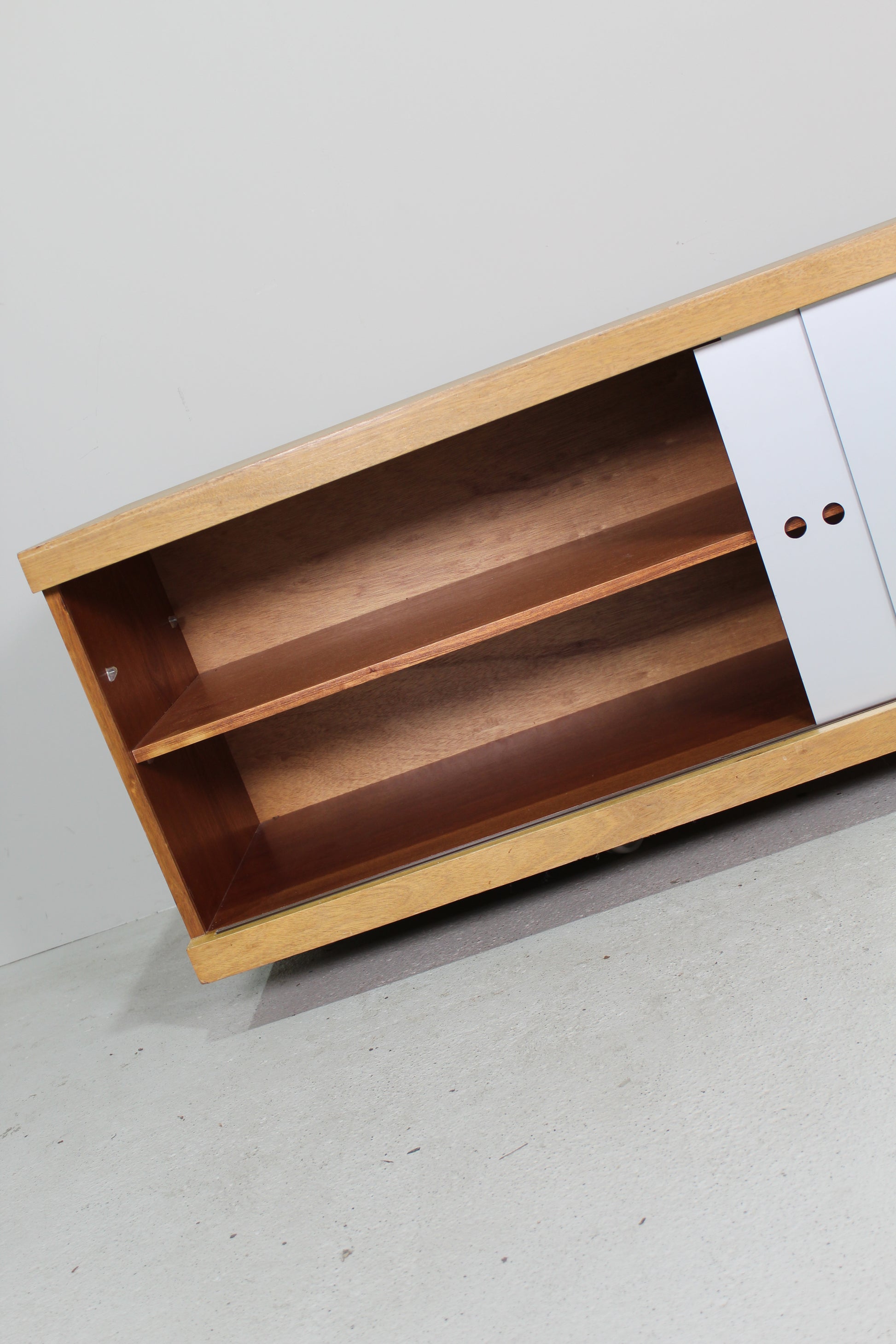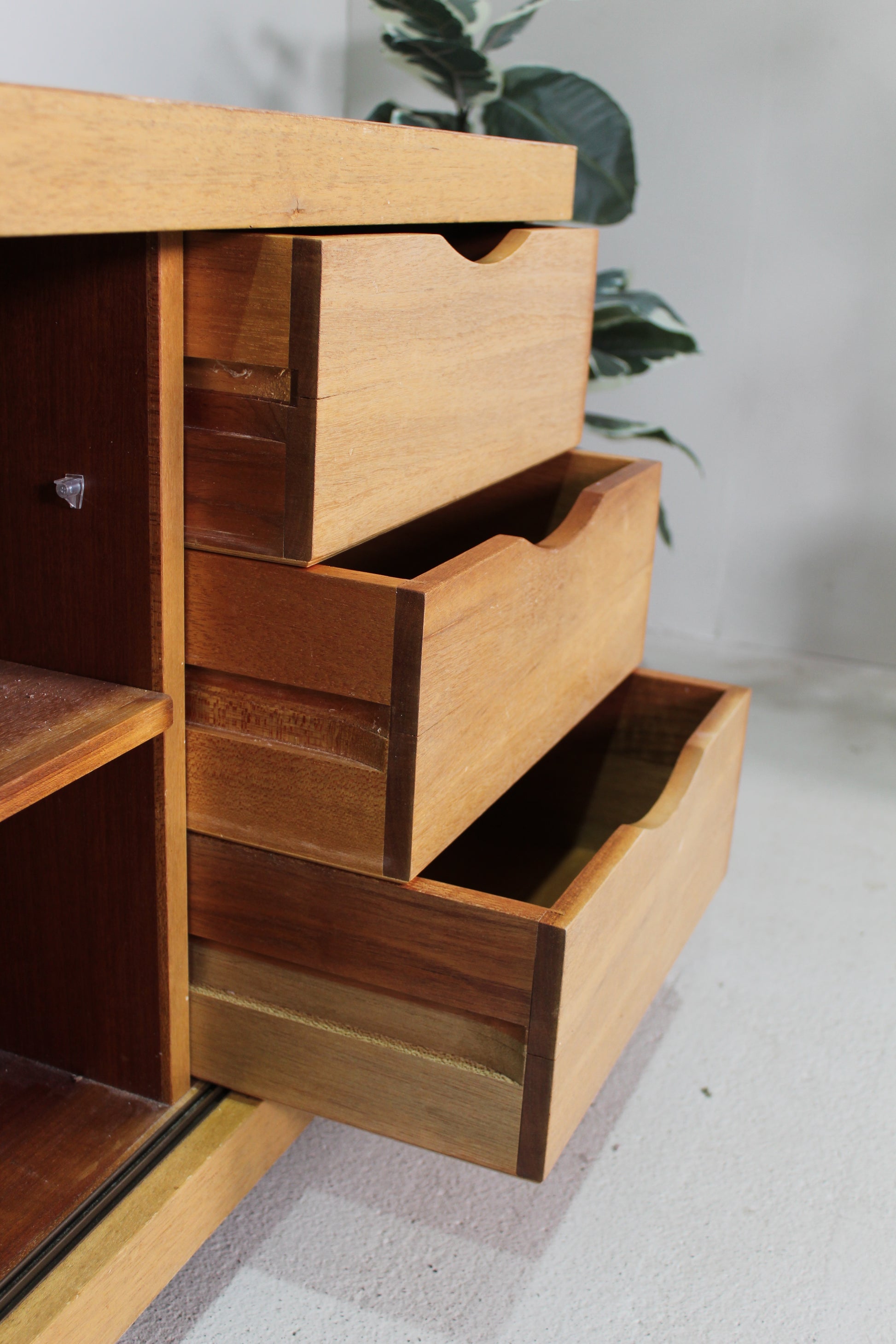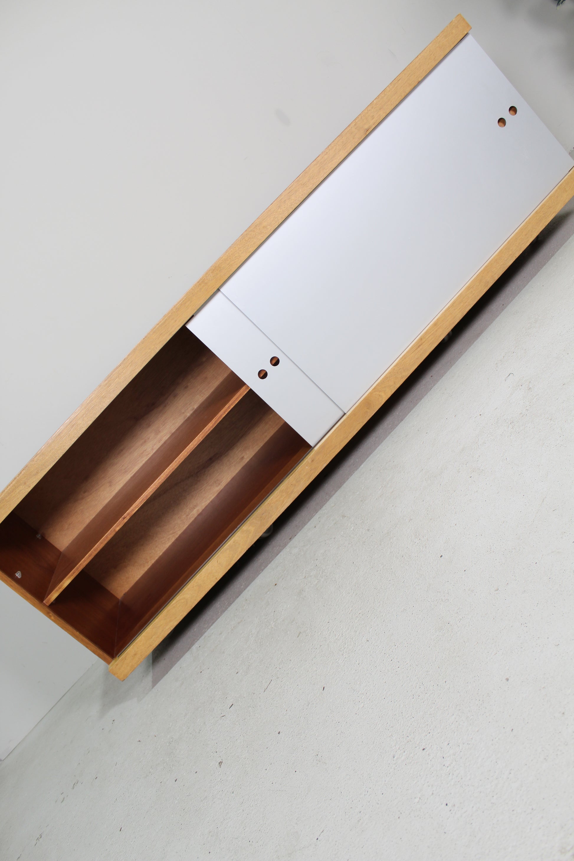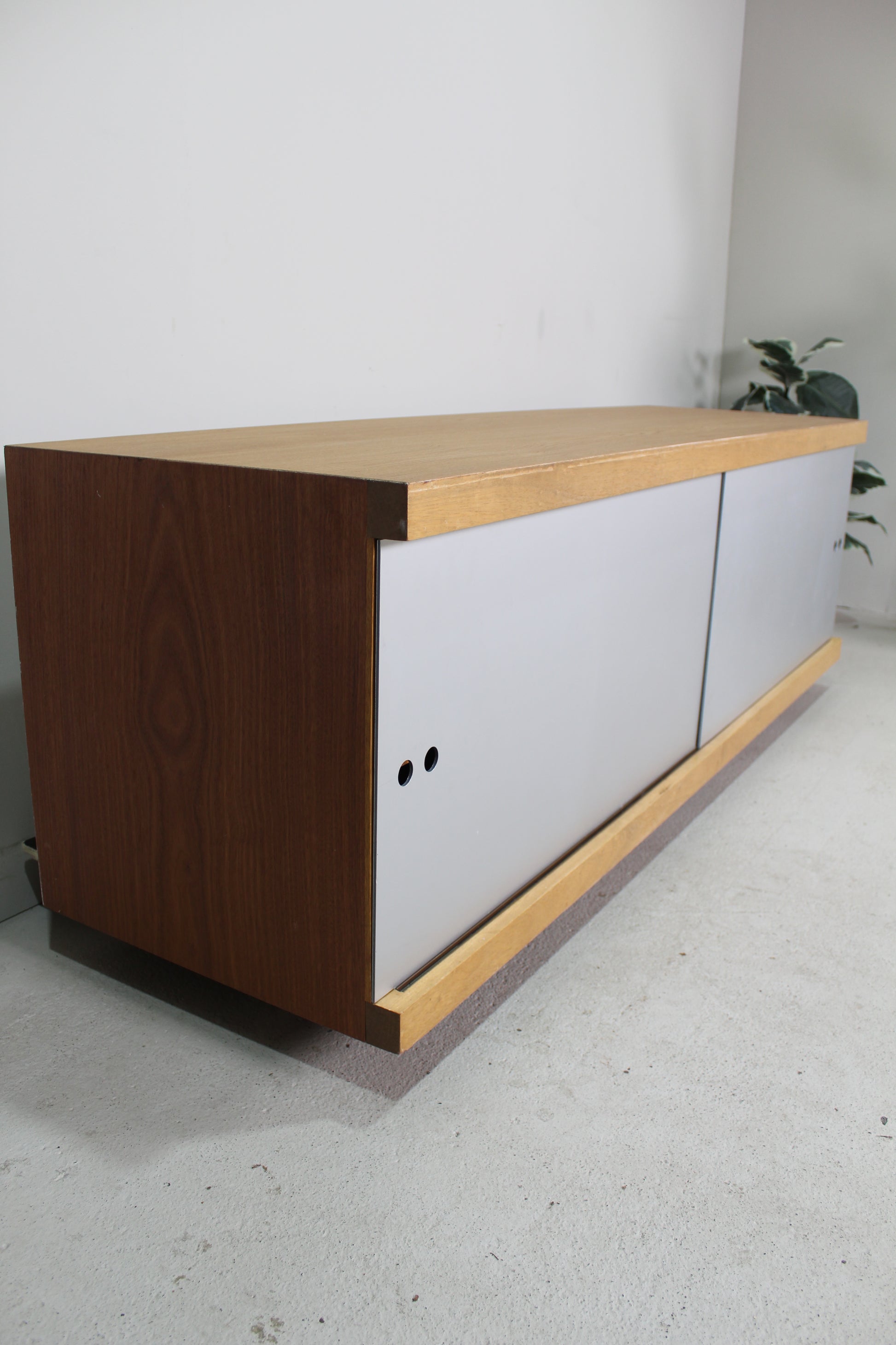 Dit zwevende mid century meubel komt uit de woning van een voormalig architect. Hij heeft het meubel op maat laten maken in de jaren '60 - dus er is er echt maar ééntje van. Over de maker zelf is verder niets bekend. De kast is van zware kwaliteit en het blad is opnieuw gefineerd. Achter de schuifdeuren bevinden zich 3 lades en een (uitneembare) legplank.
