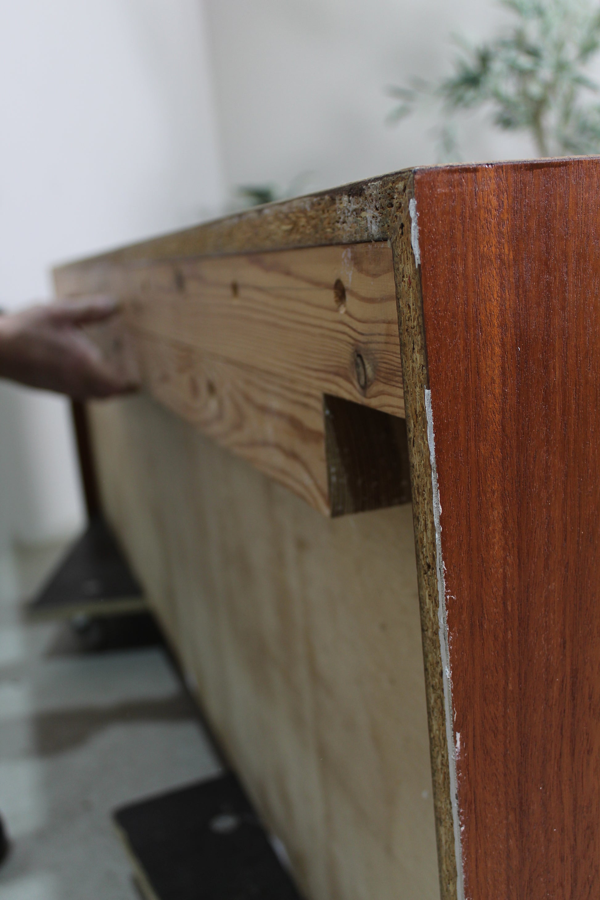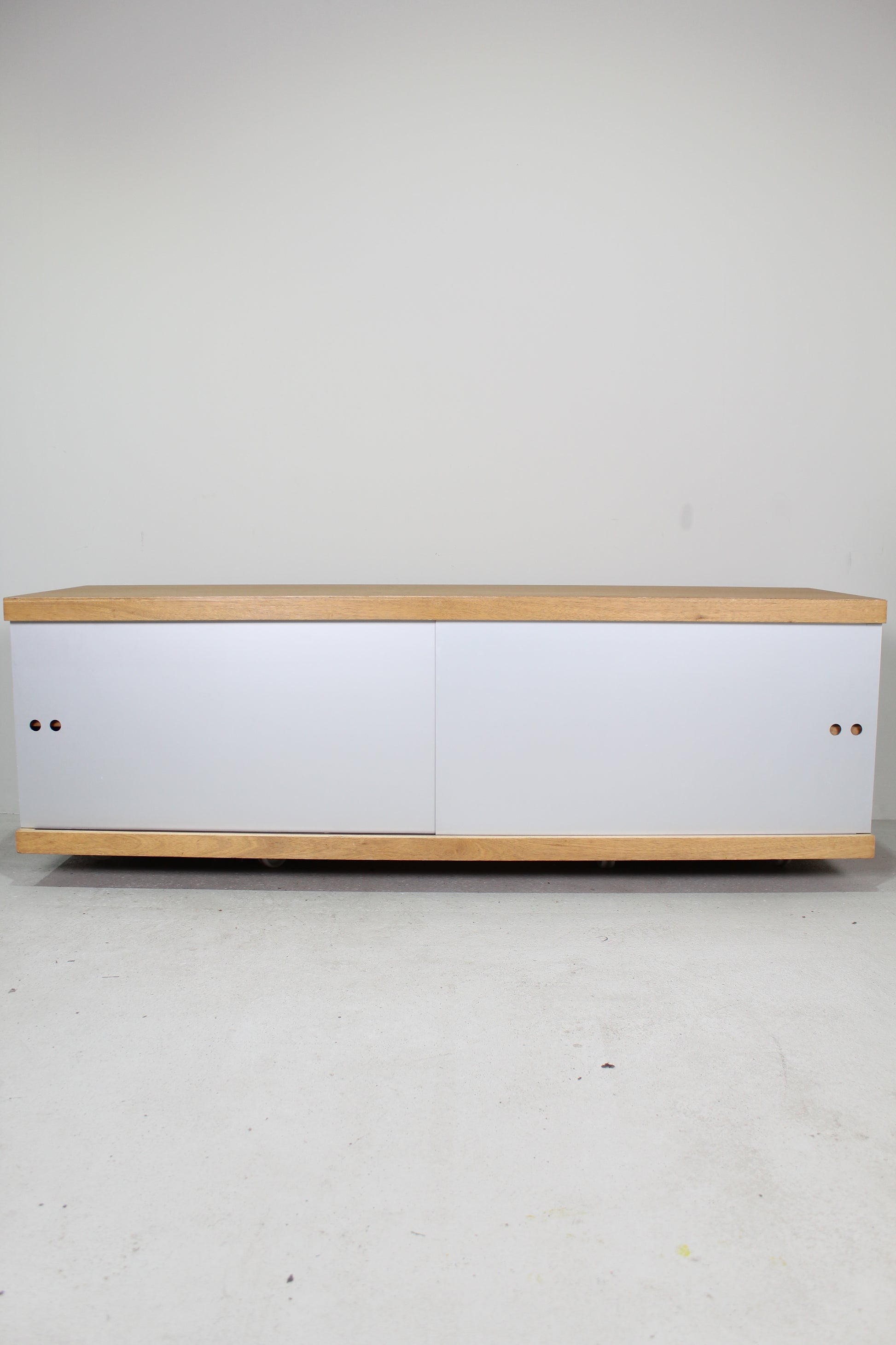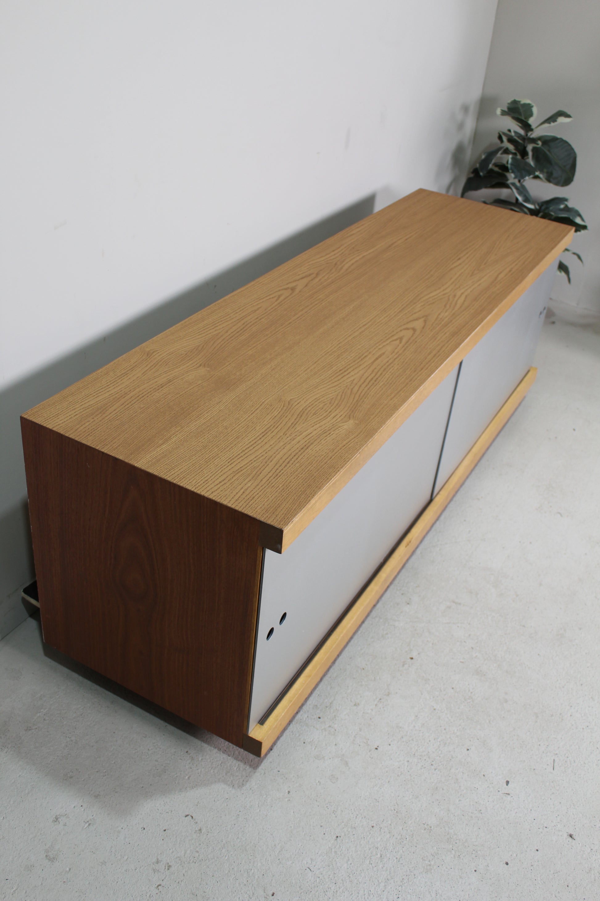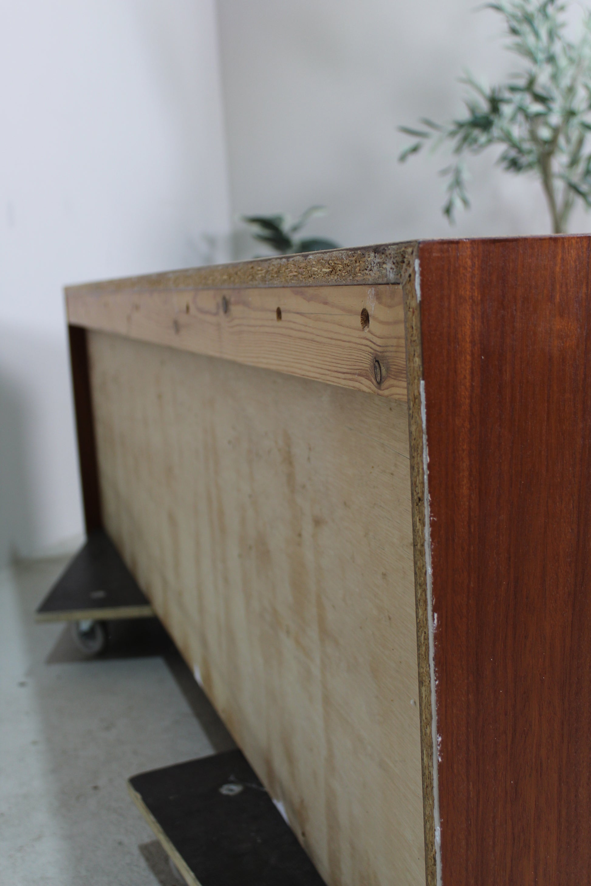 Dit zwevende mid century meubel komt uit de woning van een voormalig architect. Hij heeft het meubel op maat laten maken in de jaren '60 - dus er is er echt maar ééntje van. Over de maker zelf is verder niets bekend. De kast is van zware kwaliteit en het blad is opnieuw gefineerd. Achter de schuifdeuren bevinden zich 3 lades en een (uitneembare) legplank.