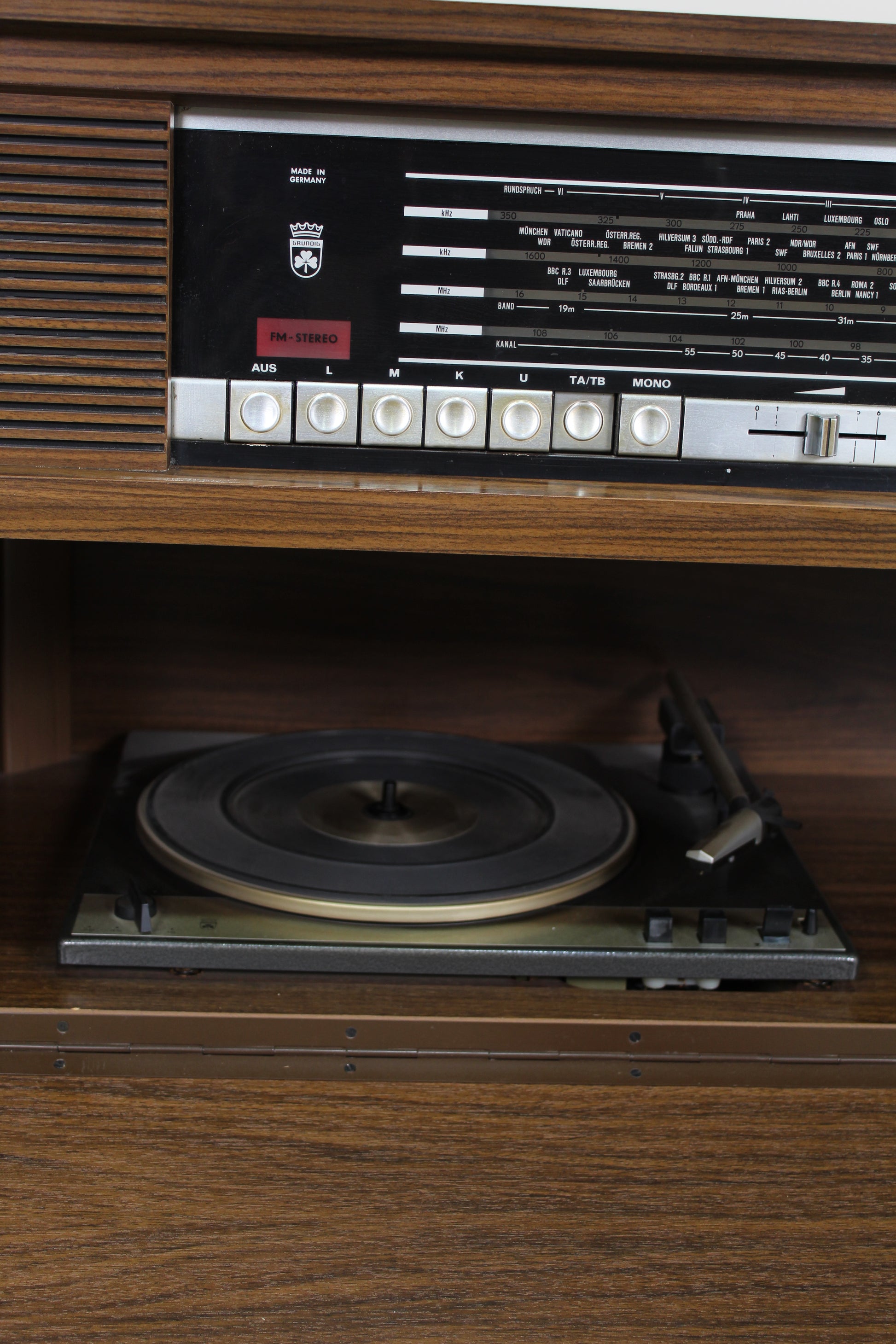 Conditie: Wat krassen op het blad. Radio werkt naar behoren, platenspeler niet.