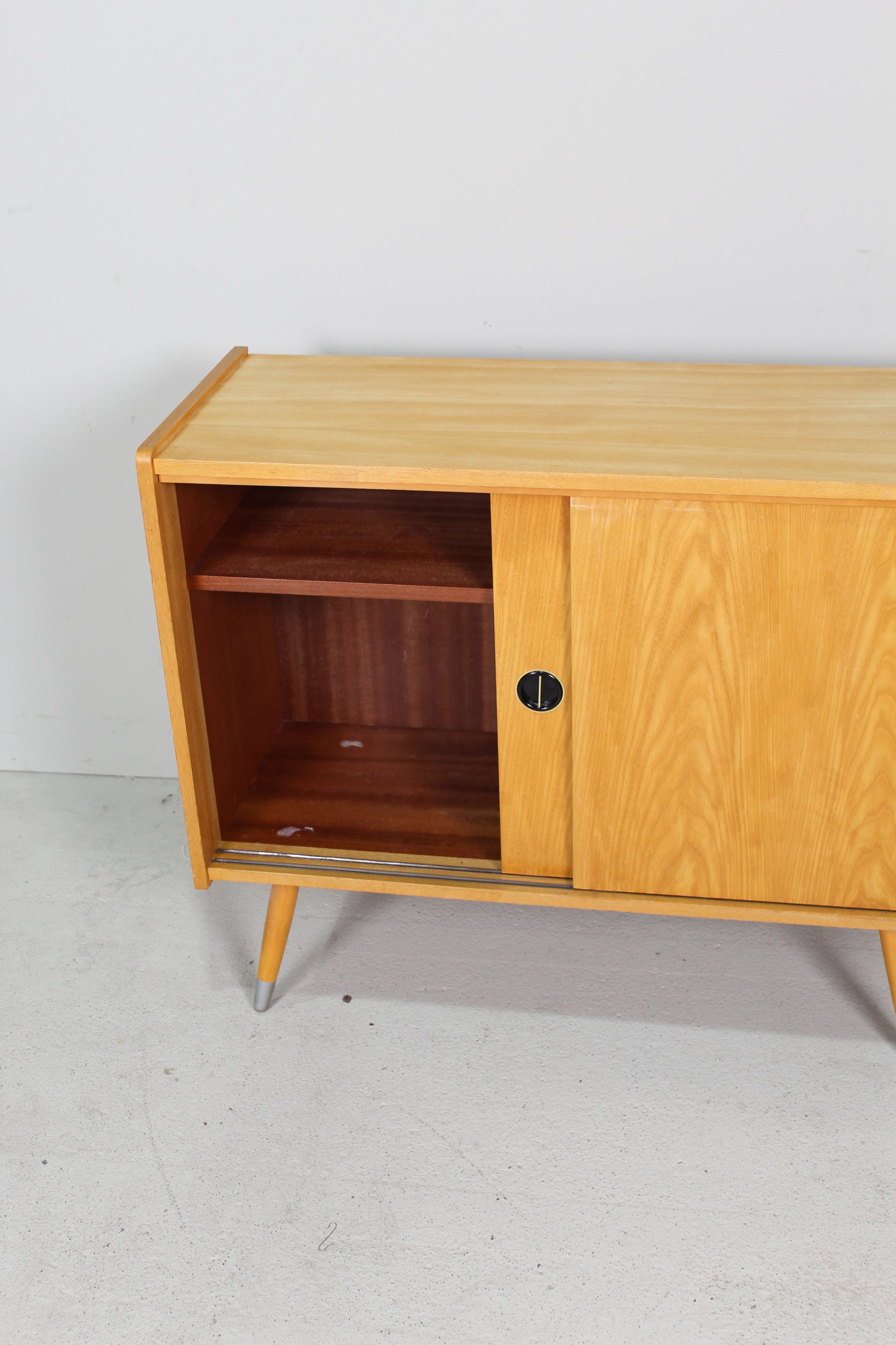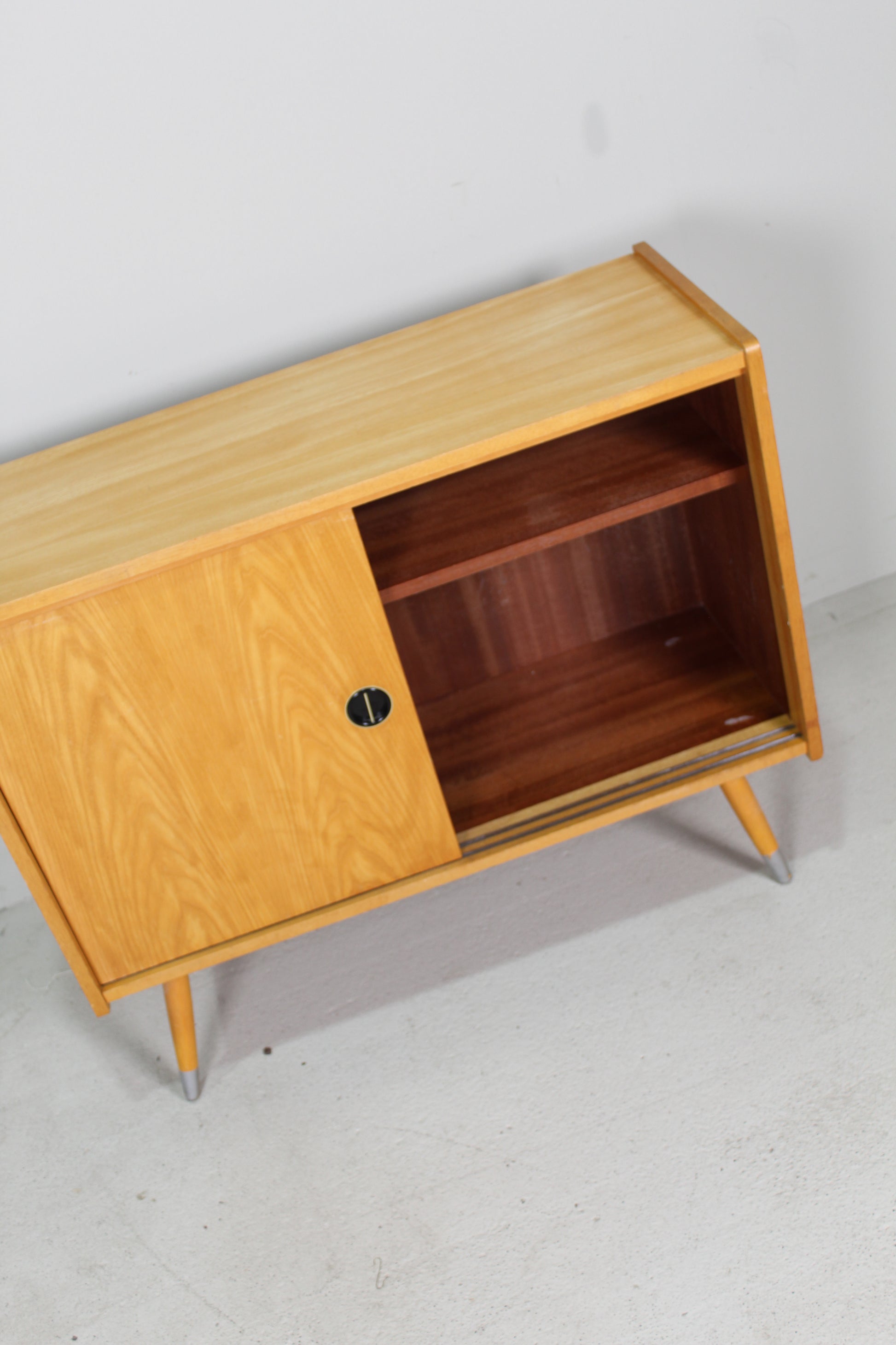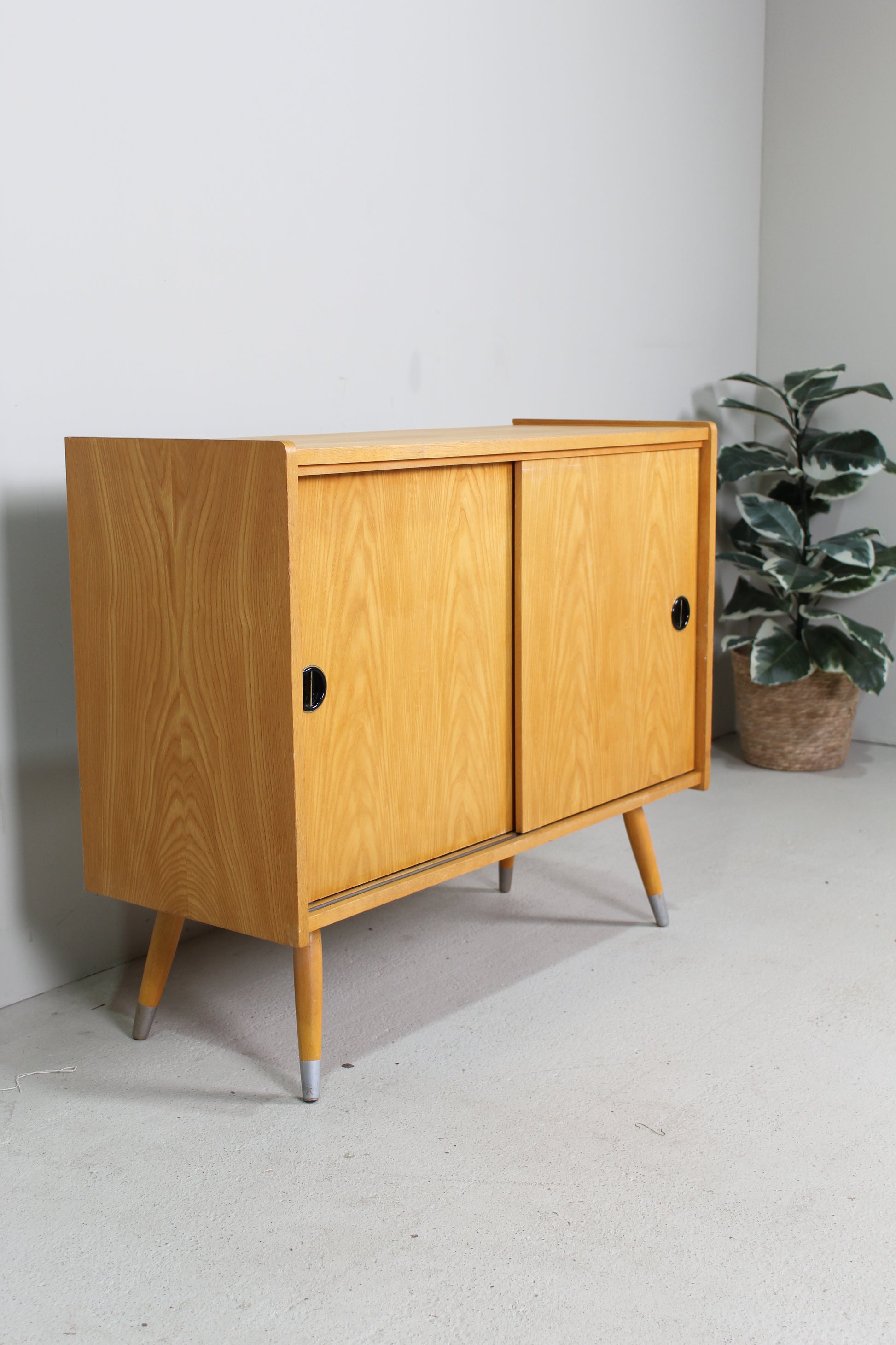 Dit houten jaren '60 kastje is in zeer goede staat en ideaal voor in de gang, woonkamer of slaapkamer. Hij heeft twee schuifdeuren met een zwartgoude kunststof greep. De poten kun je demonteren.