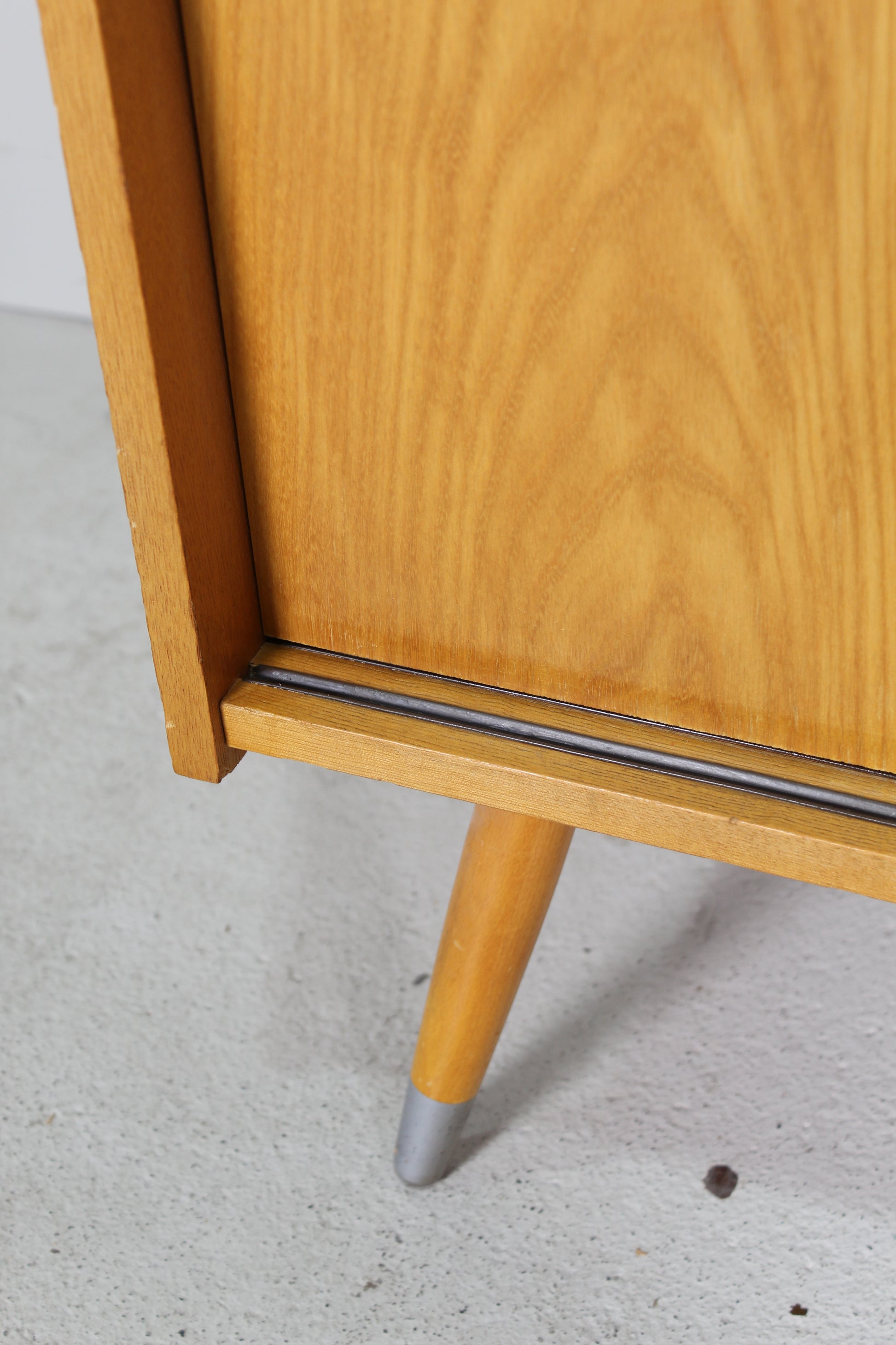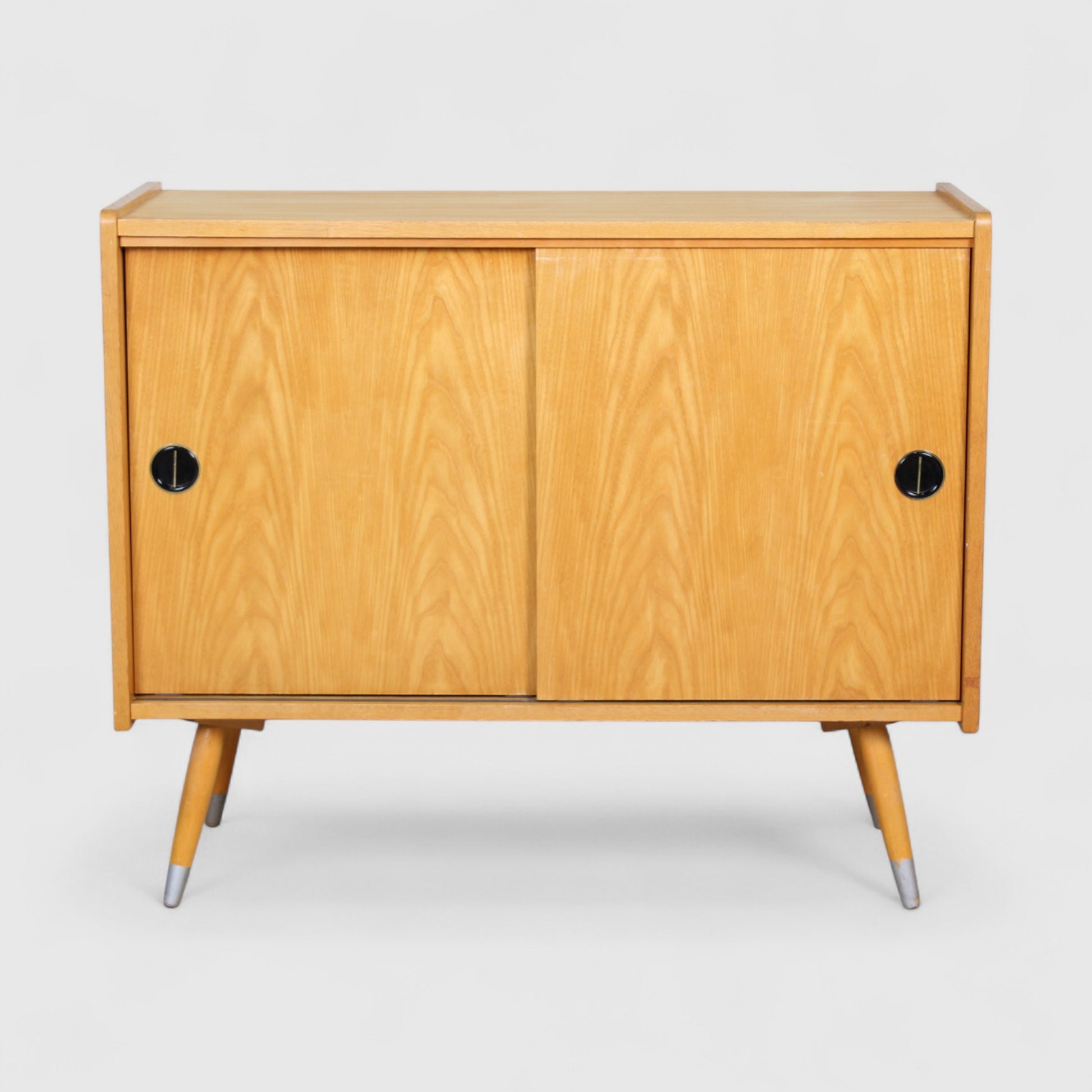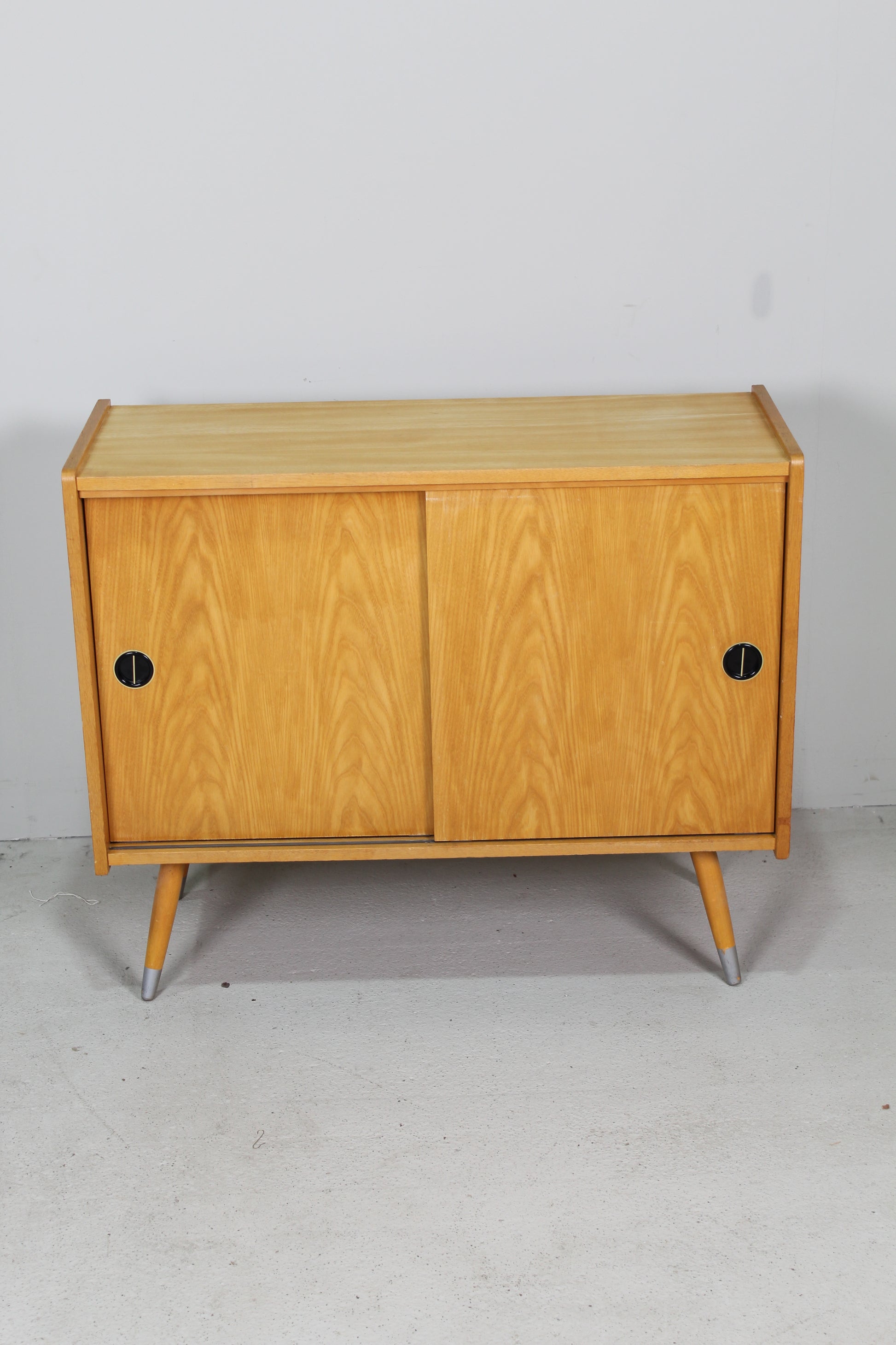Dit houten jaren '60 kastje is in zeer goede staat en ideaal voor in de gang, woonkamer of slaapkamer. Hij heeft twee schuifdeuren met een zwartgoude kunststof greep. De poten kun je demonteren.