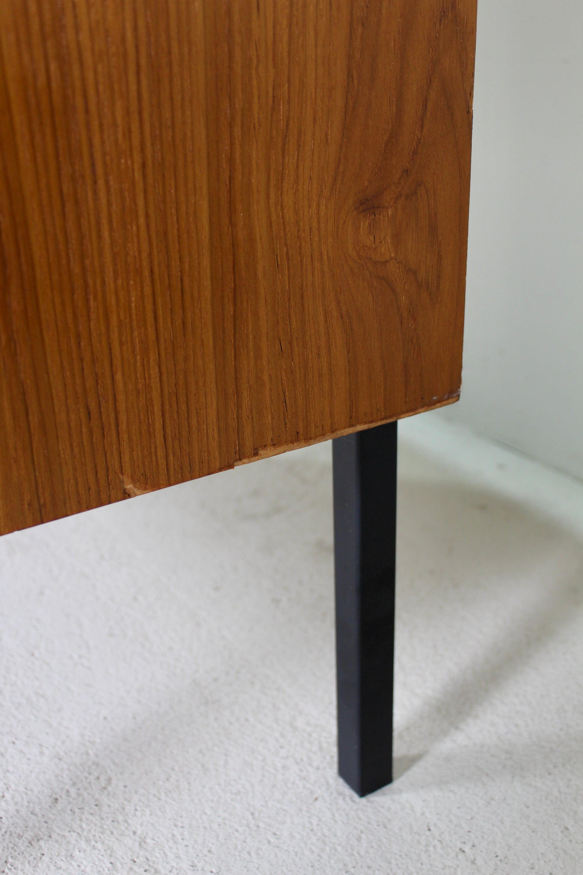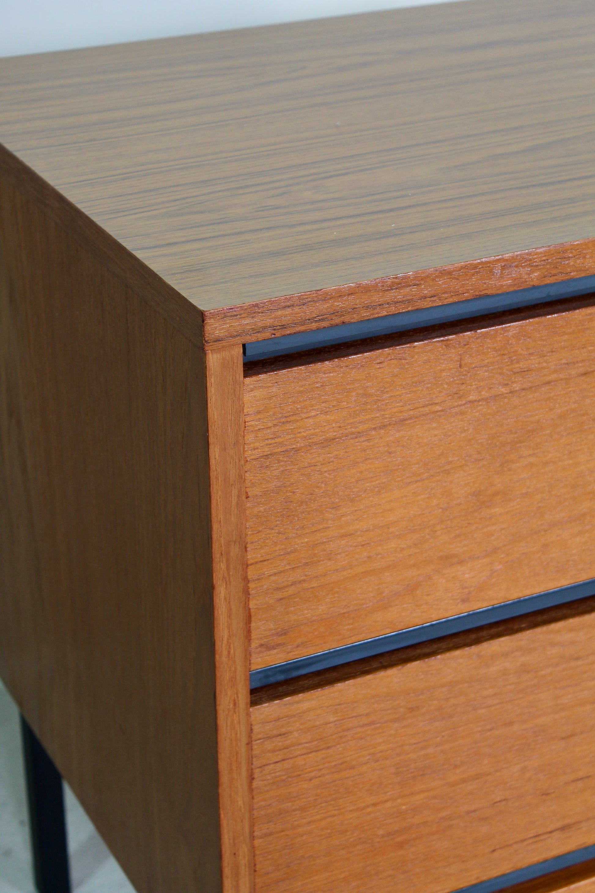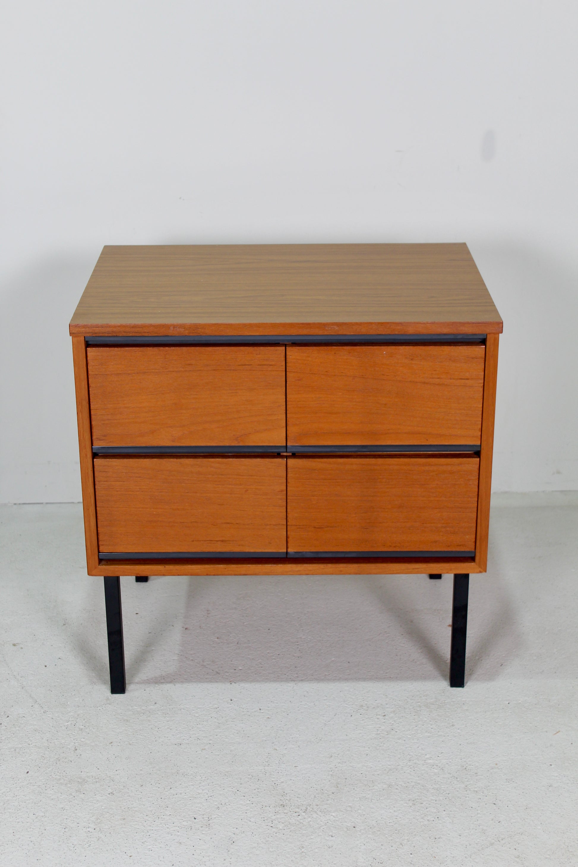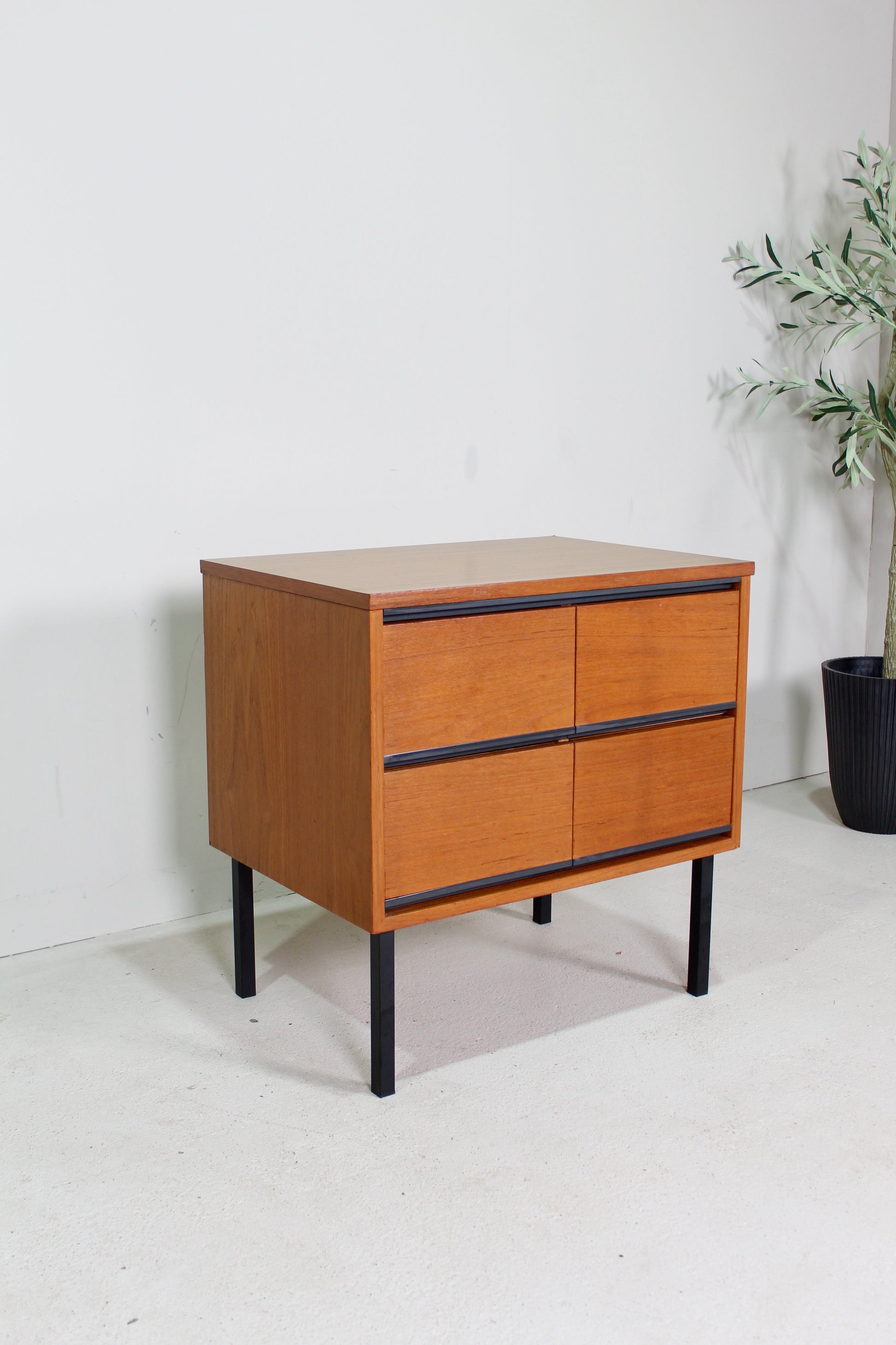 Dit mid century kastje komt uit een oude beddenwinkel uit Winterswijk, waar ze jarenlang zijn gebruikt. Deze ladekast is van origine een onderdeel geweest van een wandsysteem, maar met poten eronder heb je een handige, diepe ladekast waarin je veel kwijt kunt. De kast heeft vier lades, die met zwaluwstaart verbindingen zijn afgewerkt. De kast is gemaakt met teak houtfineer, behalve het blad. Die is van kunststoffineer, waardoor je geen vlekken maakt.