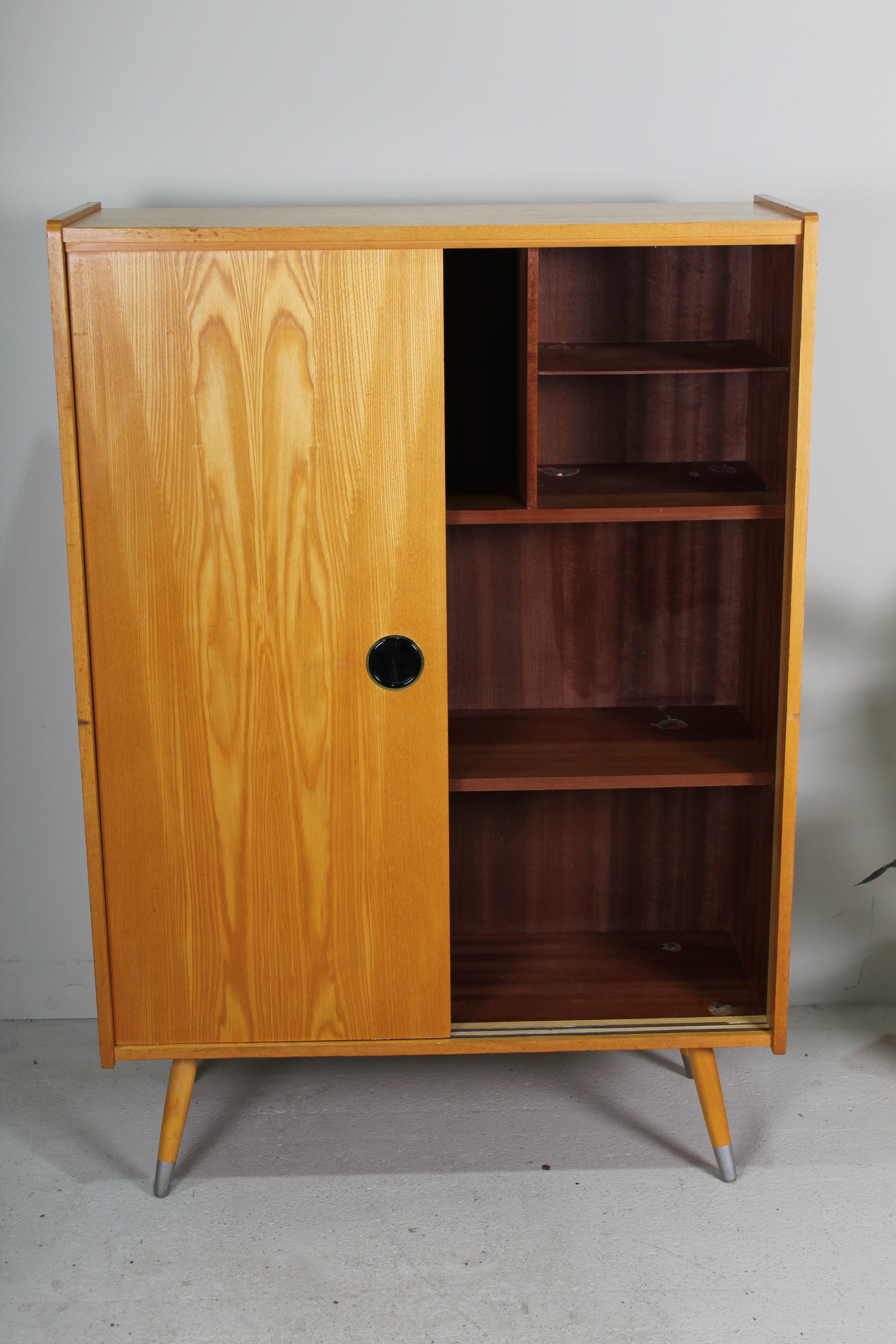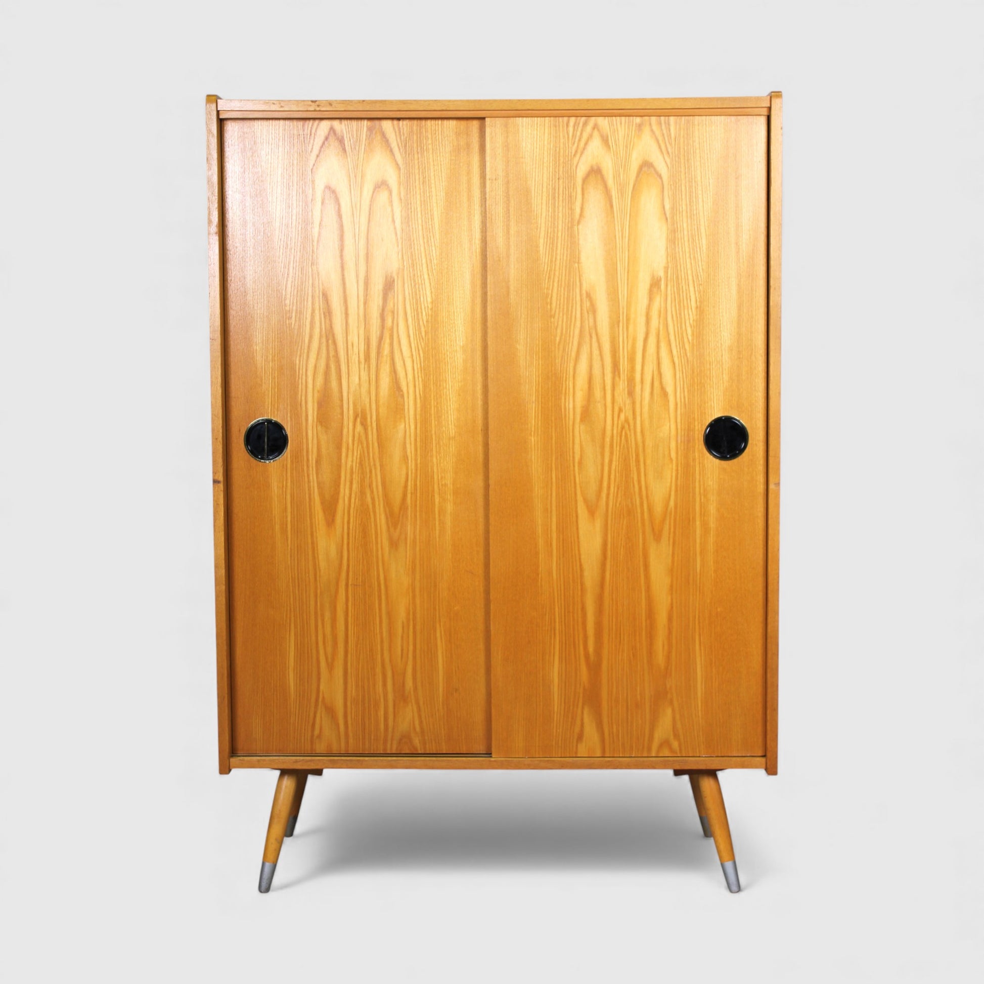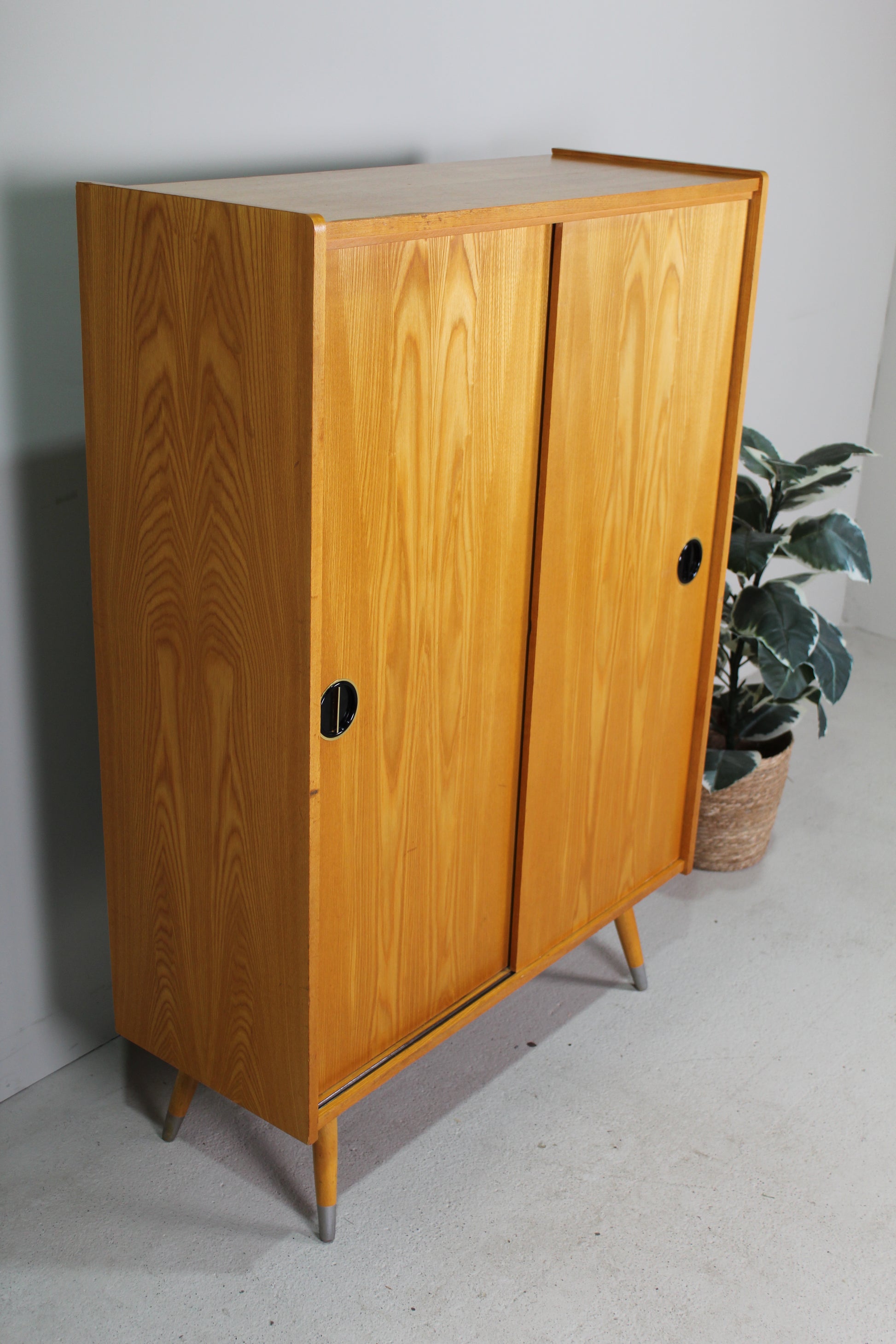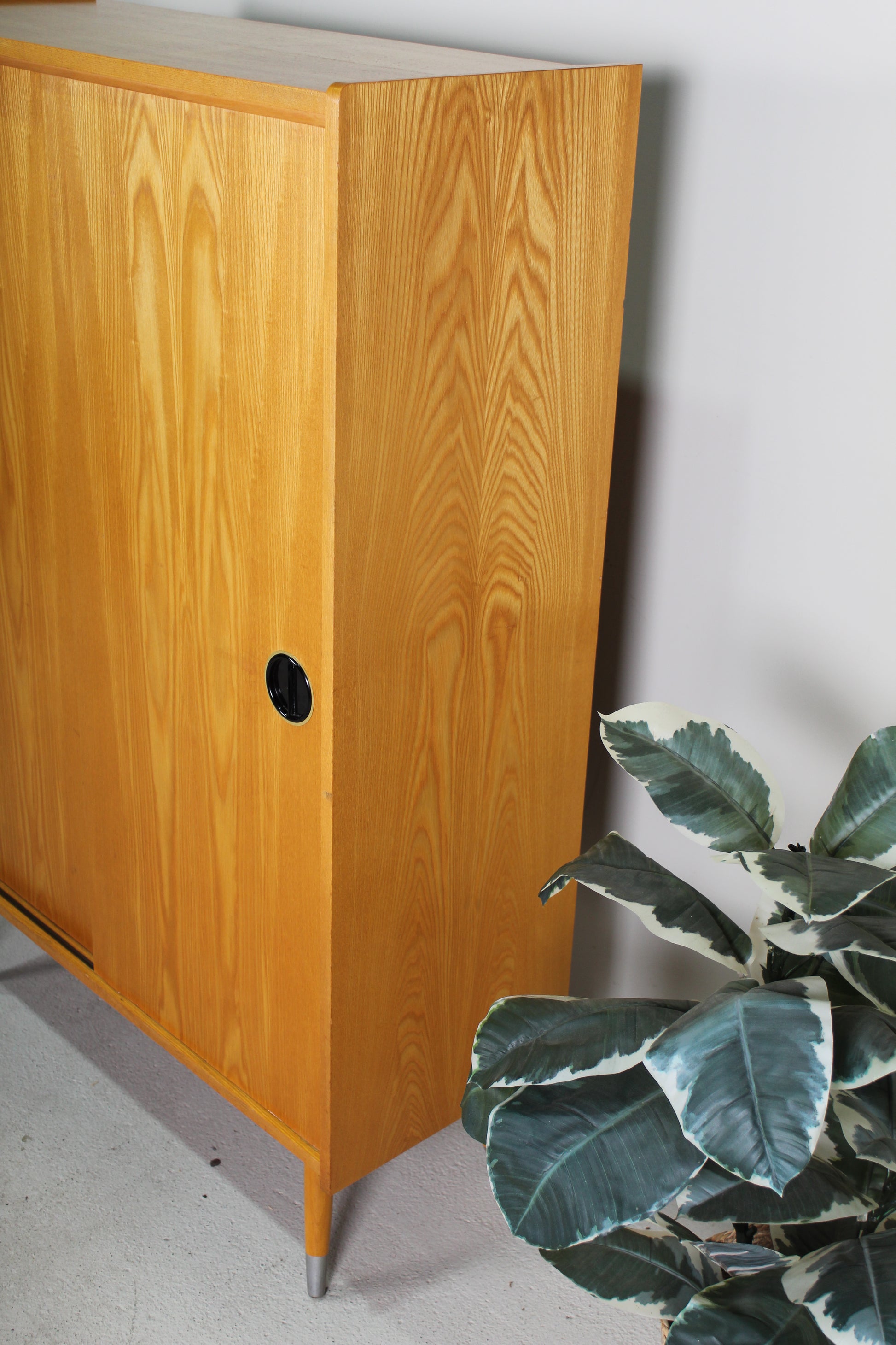 Deze mid century kast heeft twee schuifdeuren en komt uit de jaren '60. Hij is gemaakt met licht, warm hout: eiken met een prachtige vlam. Hij heeft zwarte kunststof grepen met gouden details. Hij heeft taps toelopende poten.
