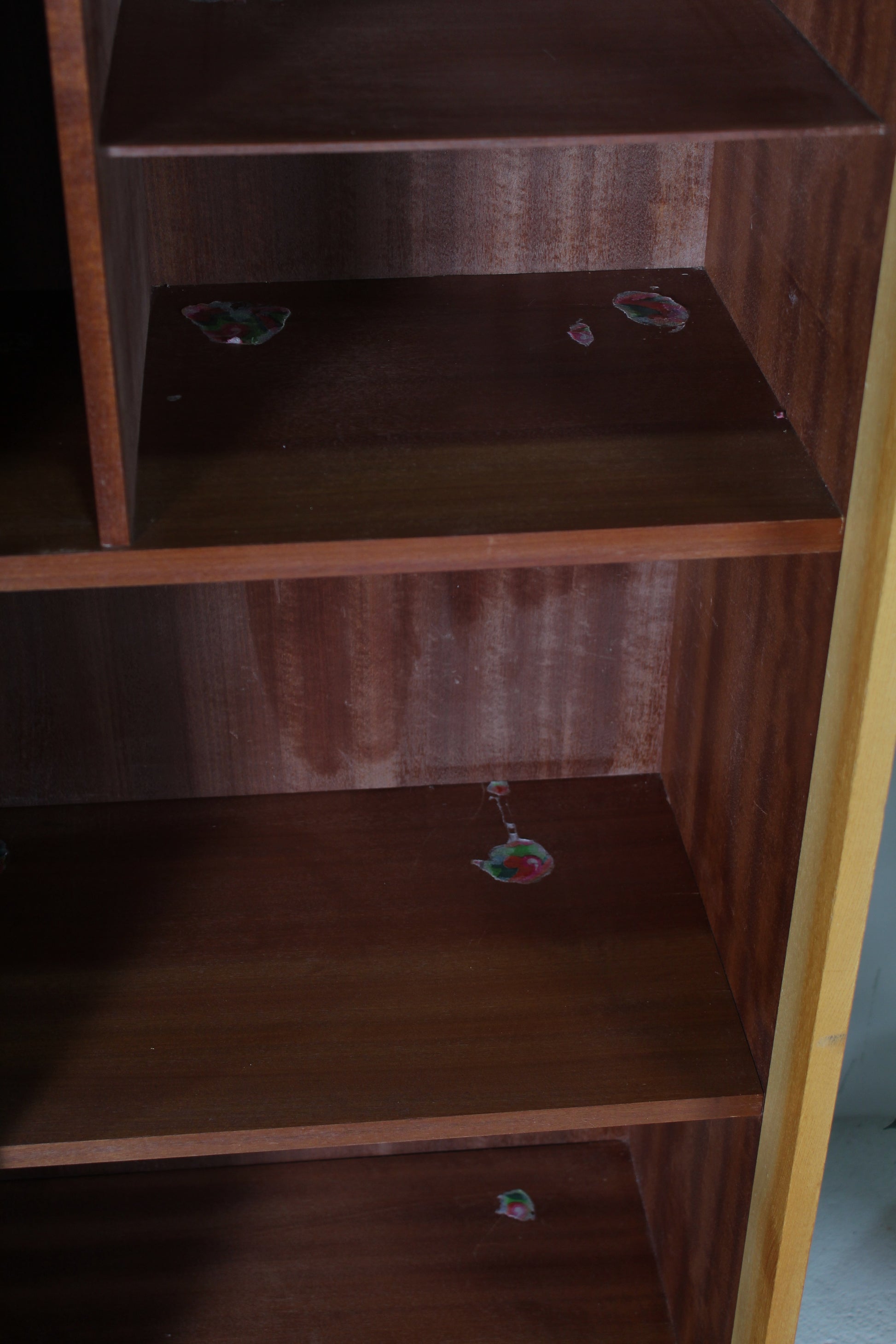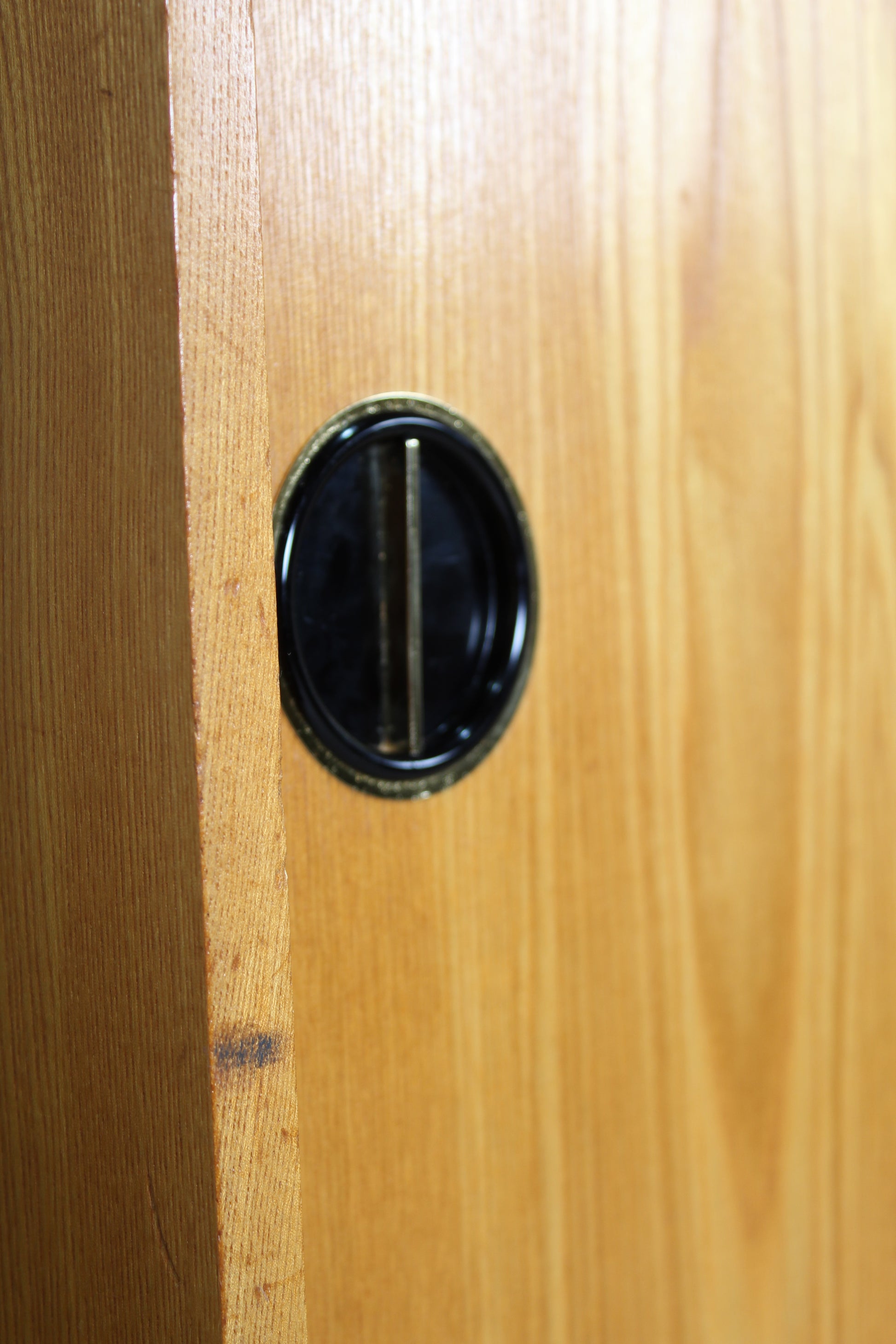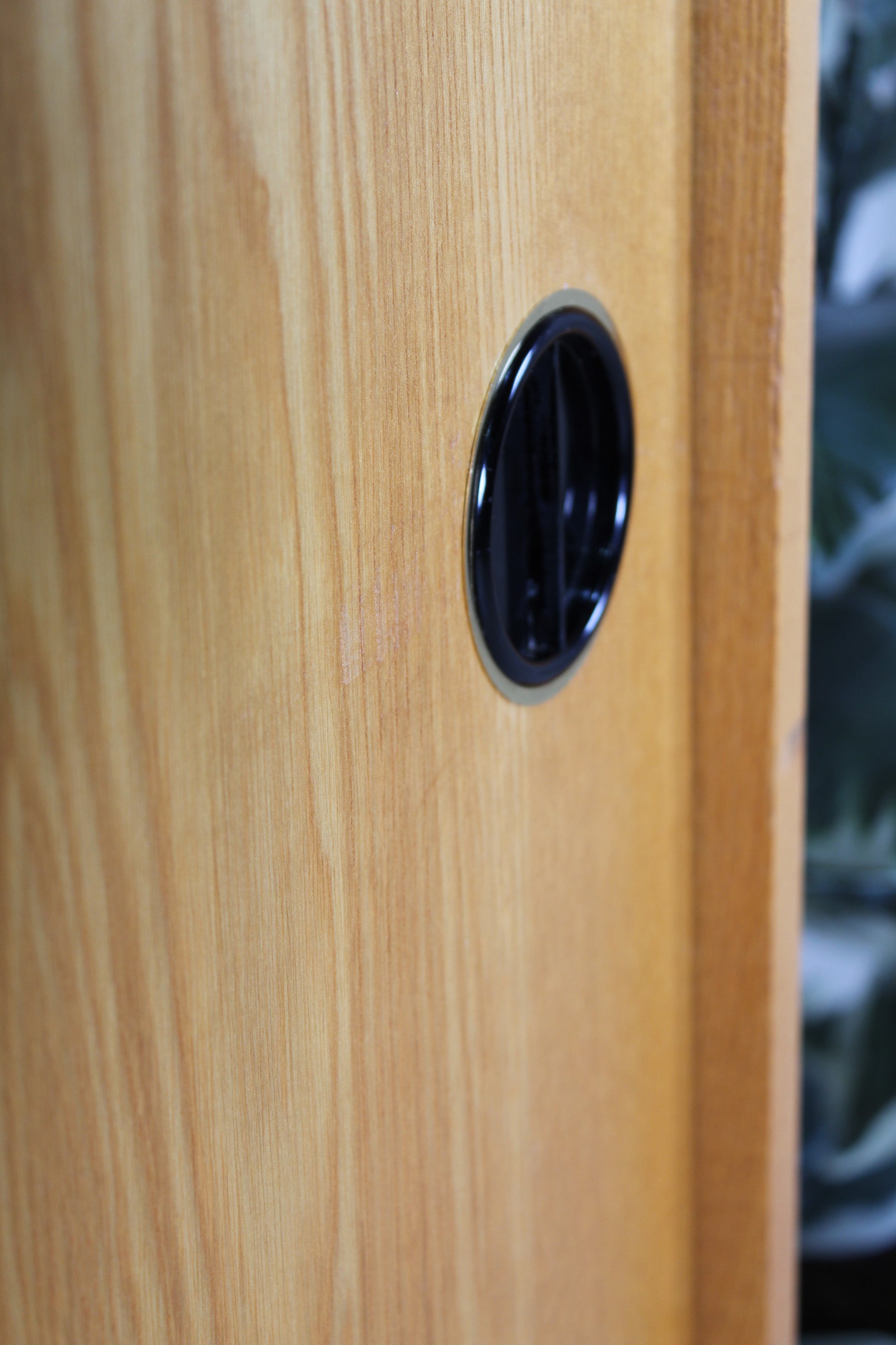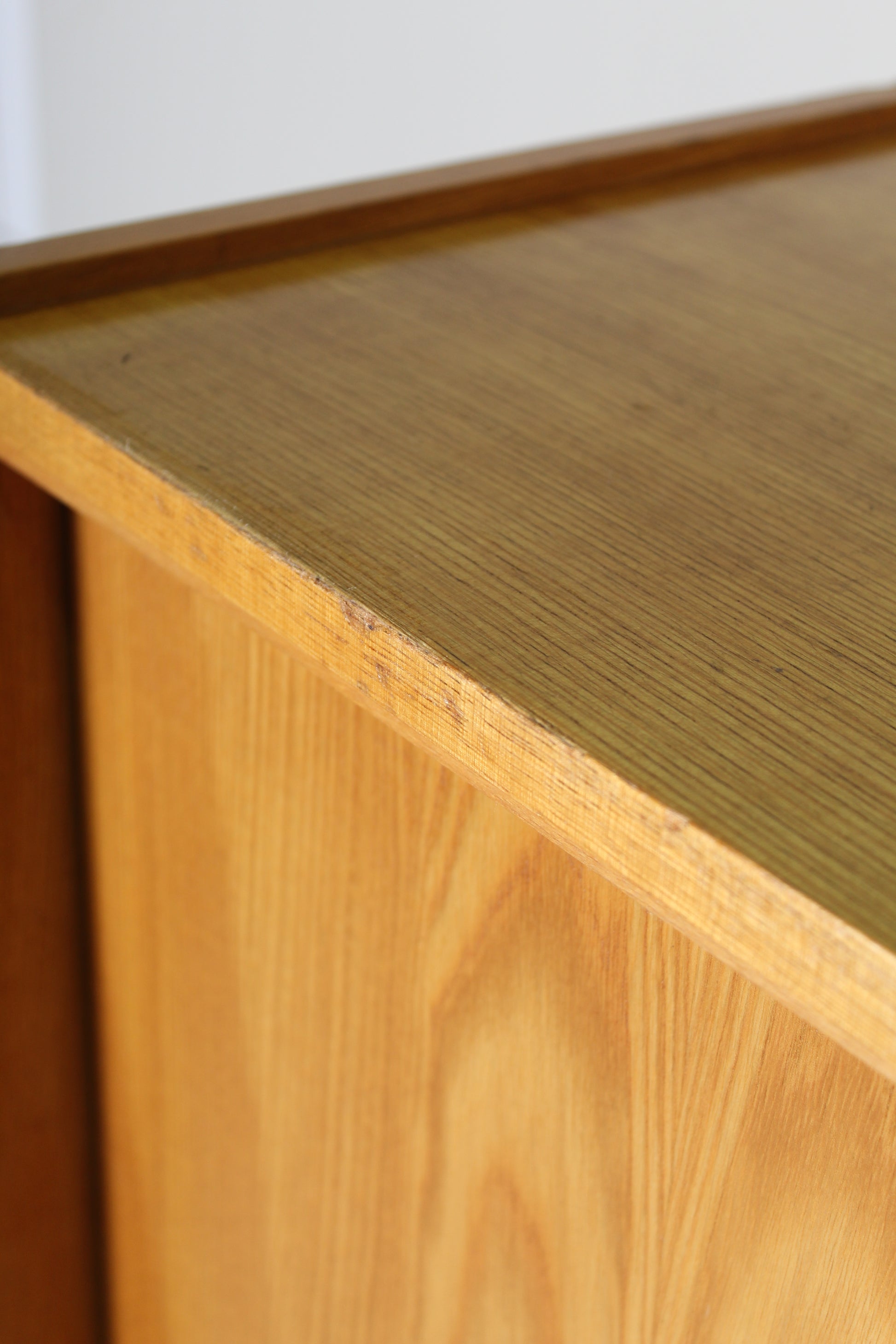 Deze mid century kast heeft twee schuifdeuren en komt uit de jaren '60. Hij is gemaakt met licht, warm hout: eiken met een prachtige vlam. Hij heeft zwarte kunststof grepen met gouden details. Hij heeft taps toelopende poten.