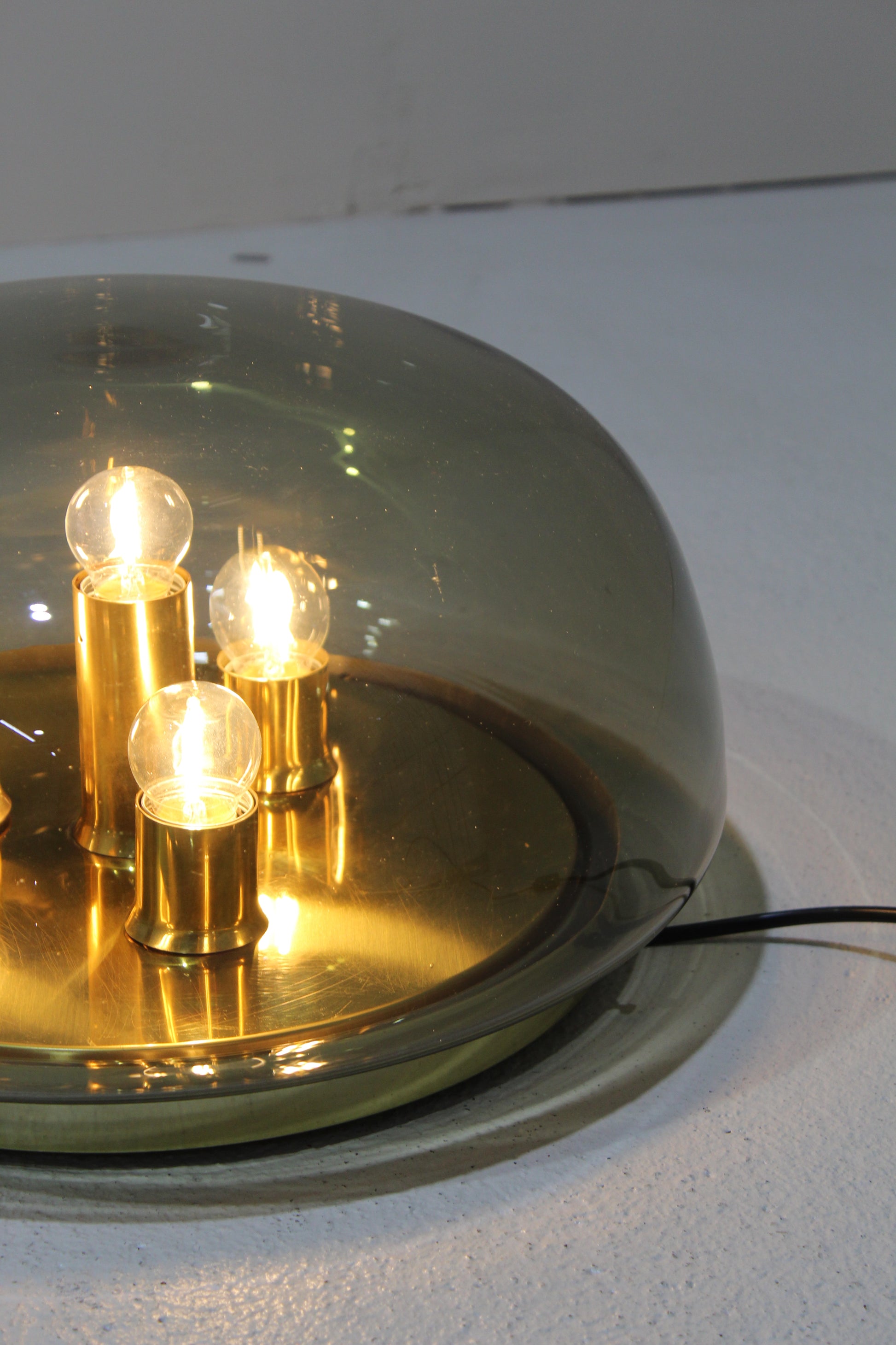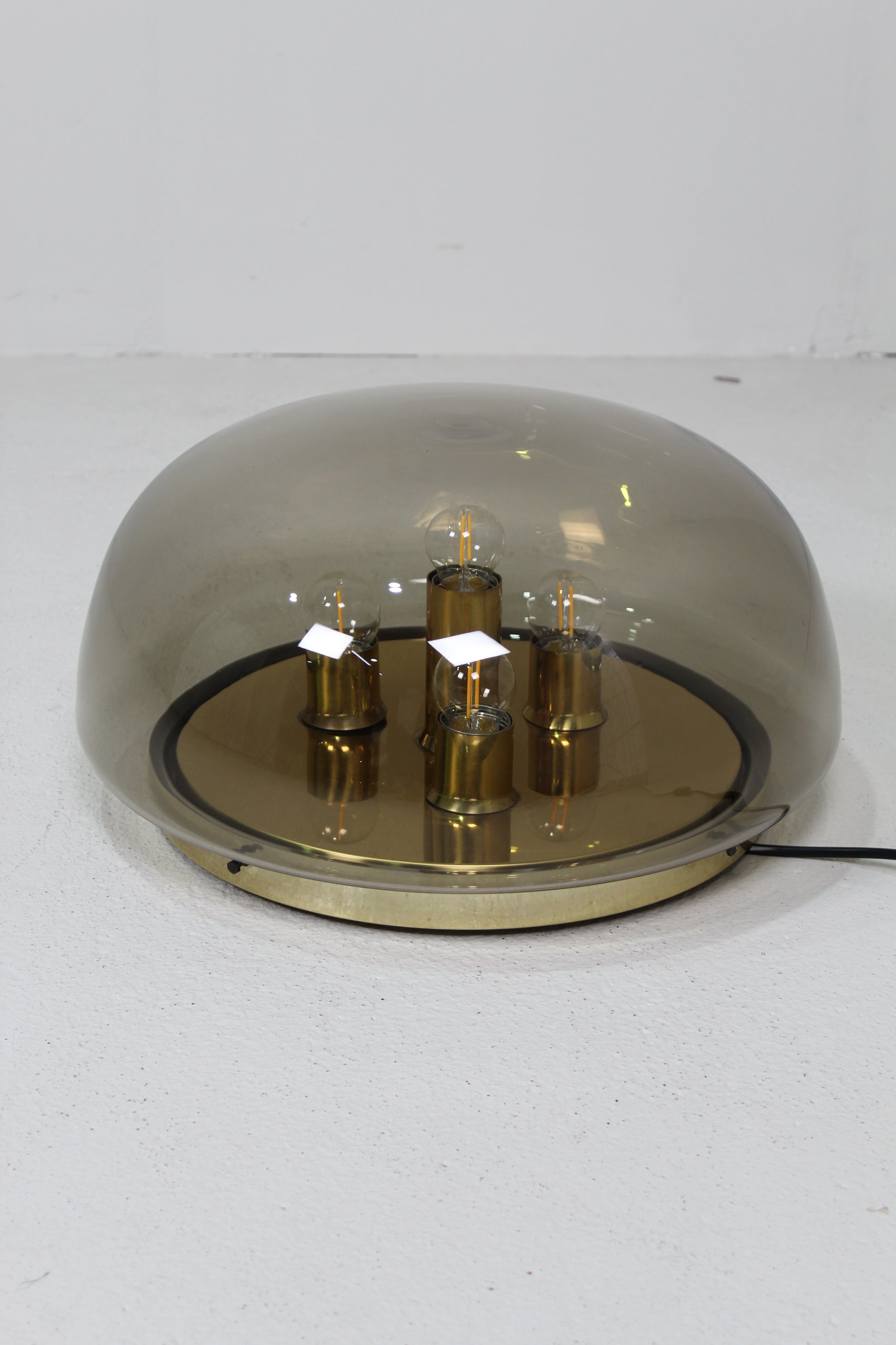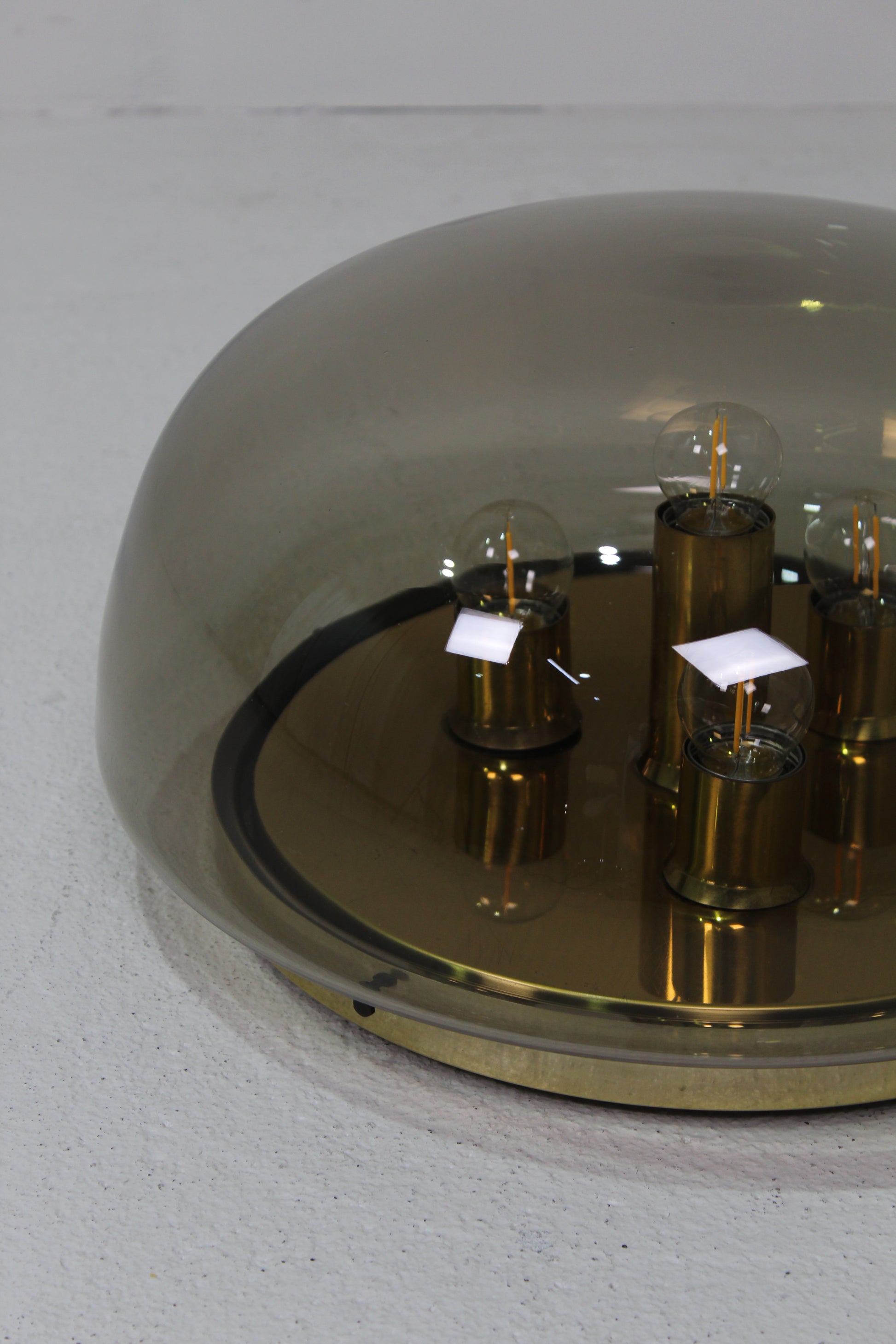 Plafondlamp of wandlamp mondgeblazen in de jaren '70. Hij is gemaakt van gerookt glas en en messing. Hij heeft plek voor vier LED-lampen (niet inbegrepen), en zorgt voor zeer sfeervol licht. Hij is gemaakt door de Duitse firma Kaiser Leuchte die veel design lampen heeft geproduceerd.