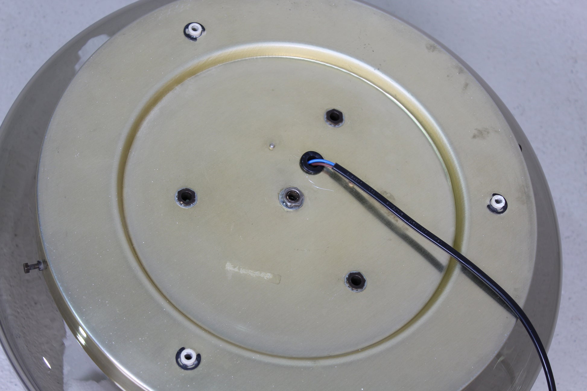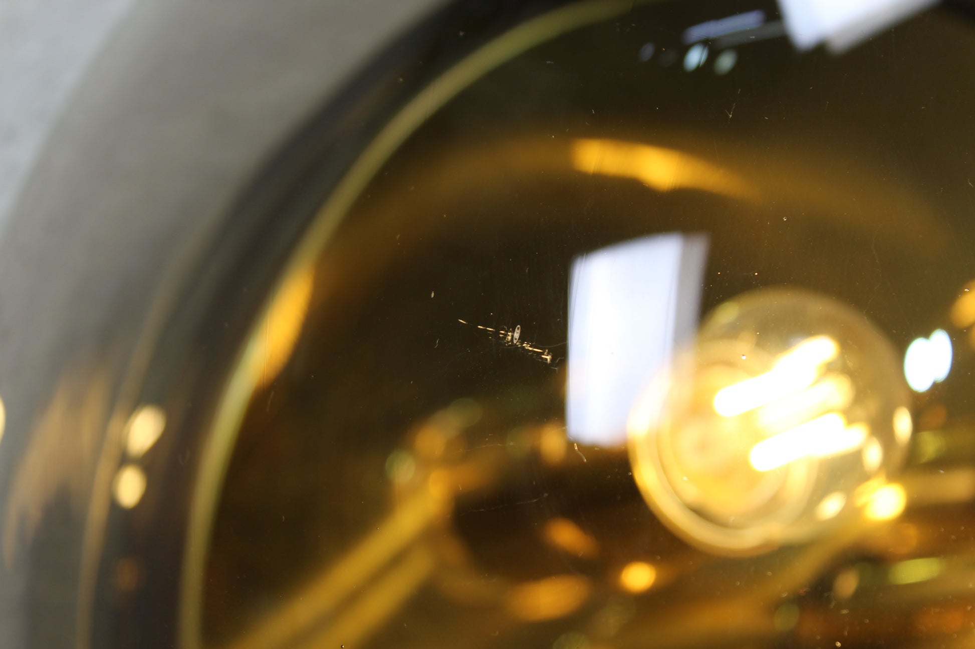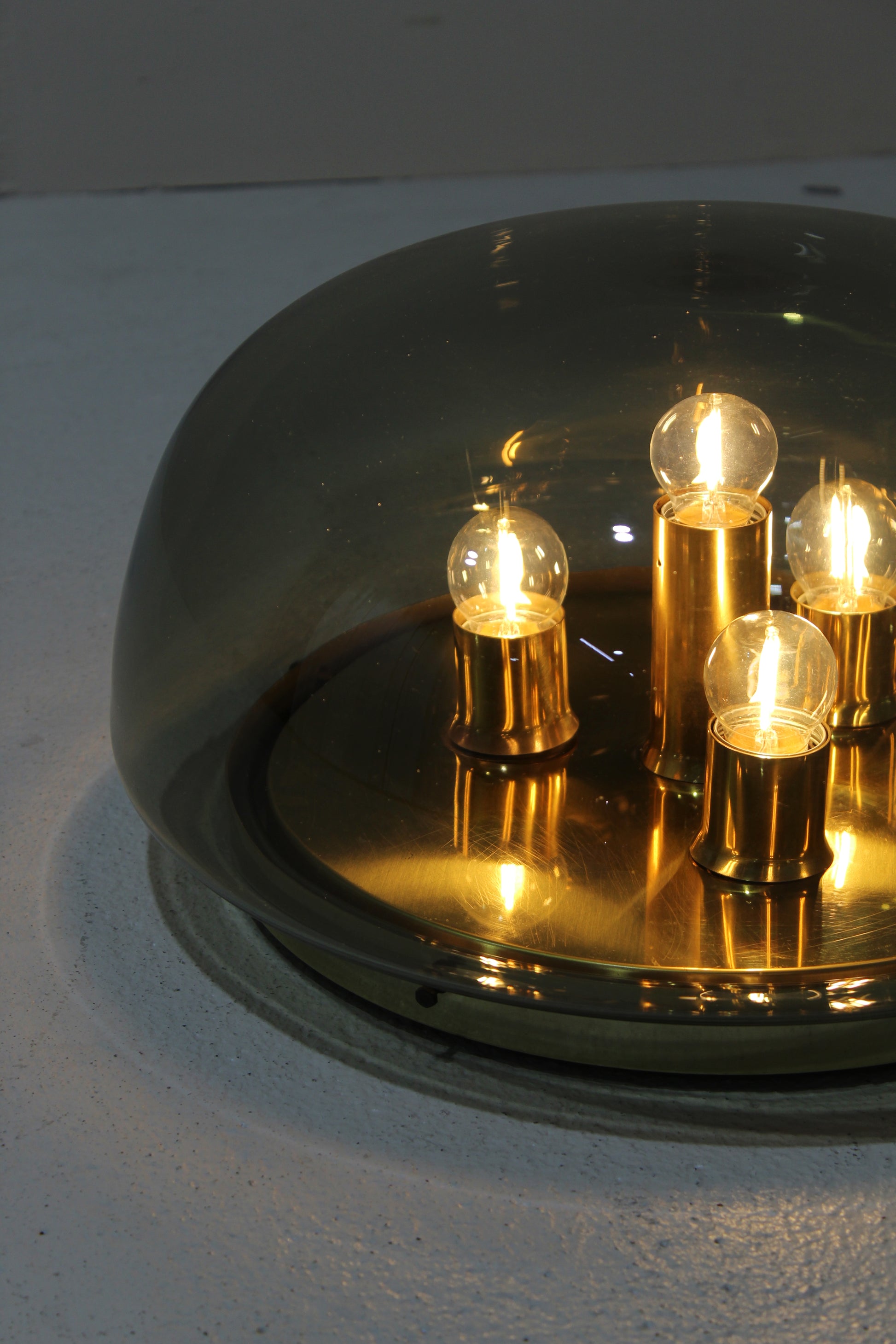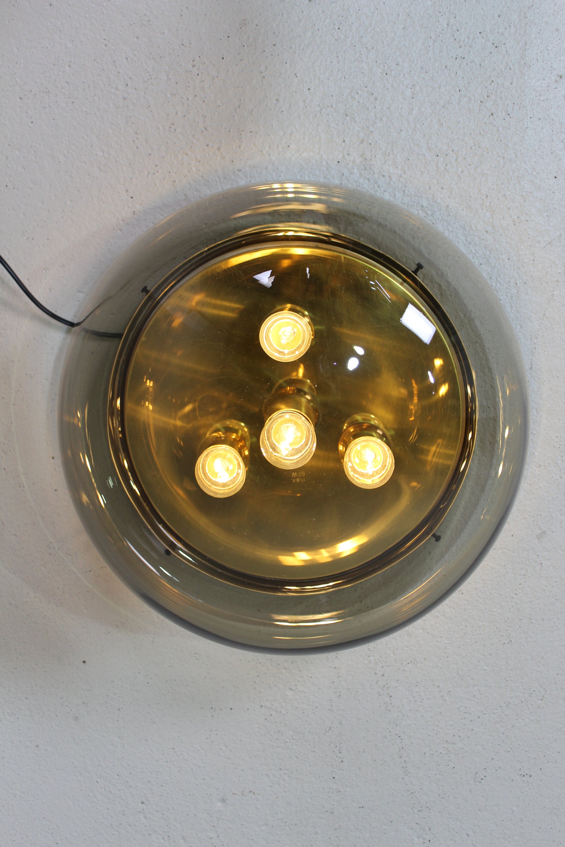 Plafondlamp of wandlamp mondgeblazen in de jaren '70. Hij is gemaakt van gerookt glas en en messing. Hij heeft plek voor vier LED-lampen (niet inbegrepen), en zorgt voor zeer sfeervol licht. Hij is gemaakt door de Duitse firma Kaiser Leuchte die veel design lampen heeft geproduceerd.