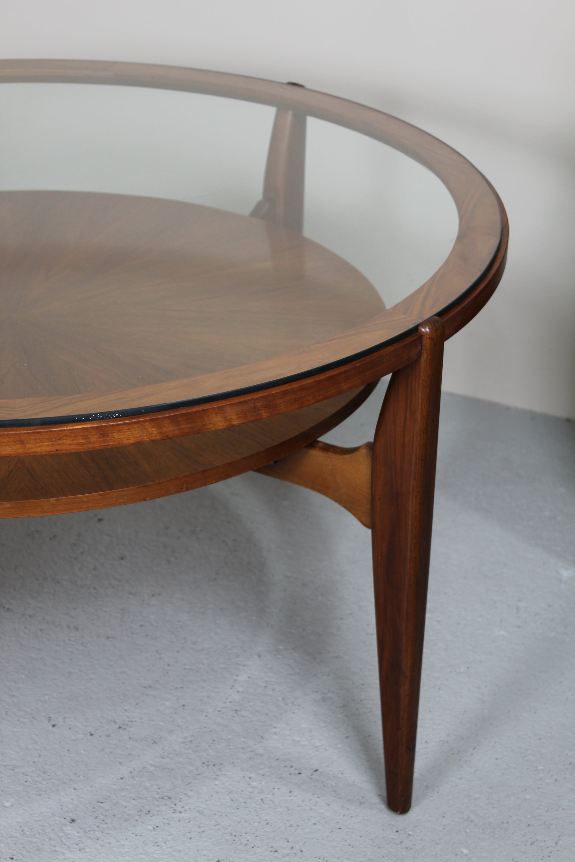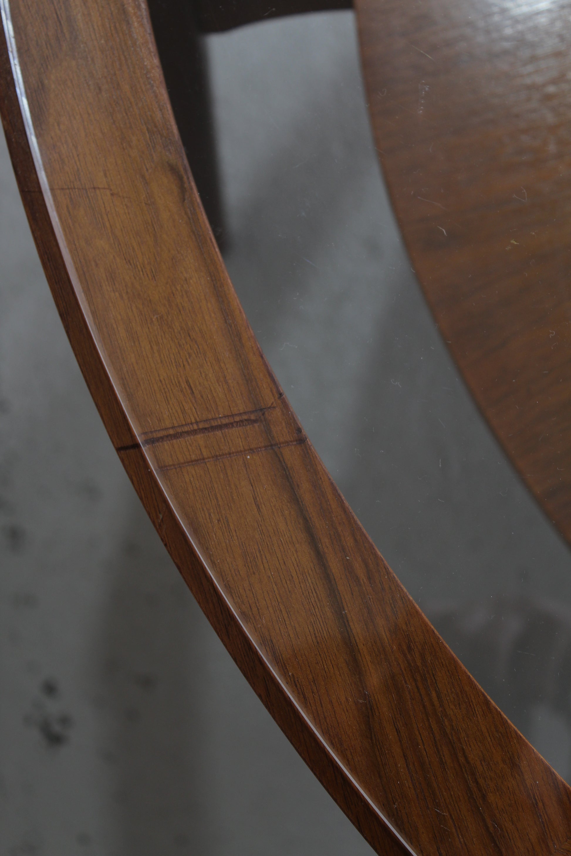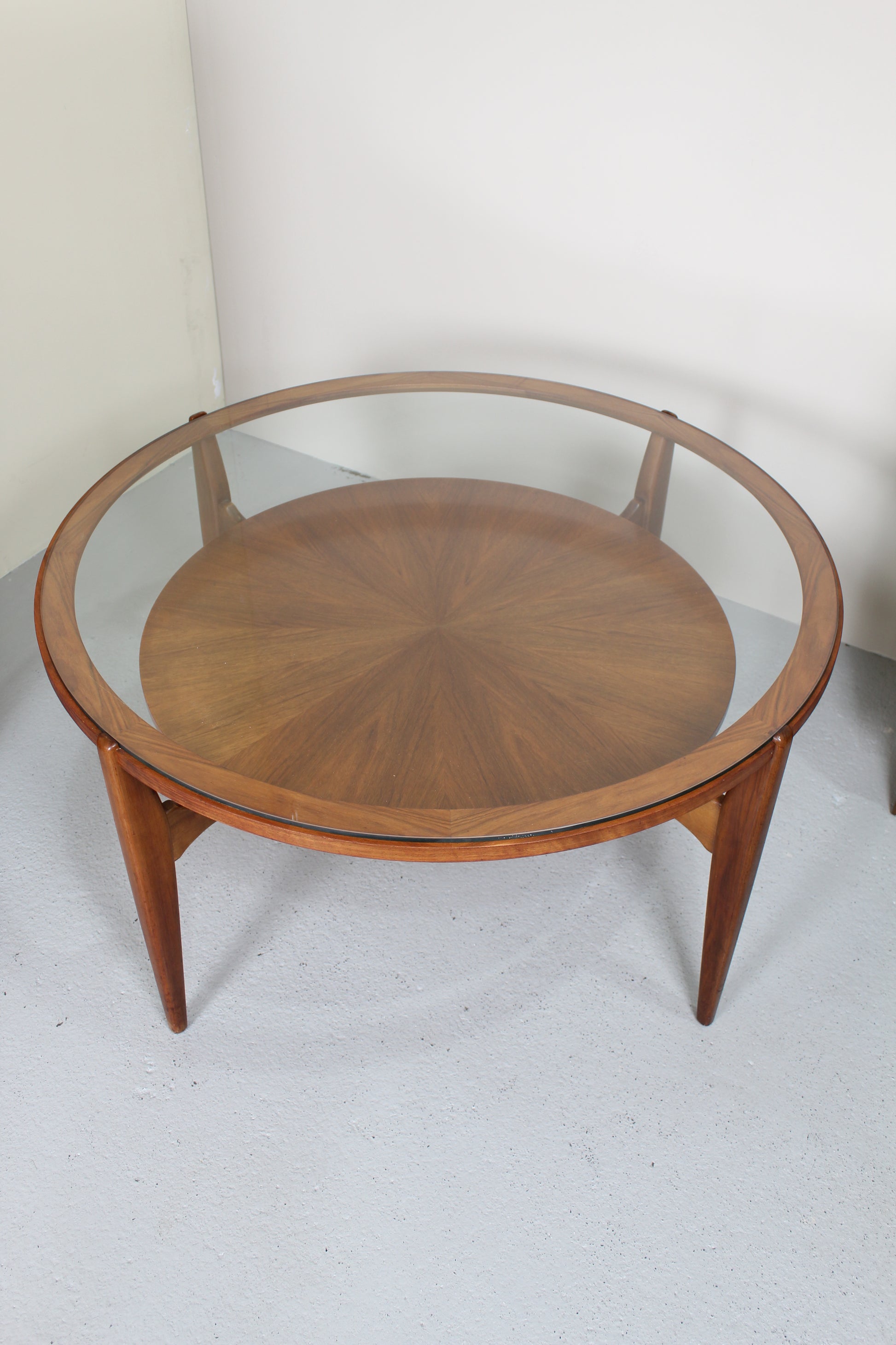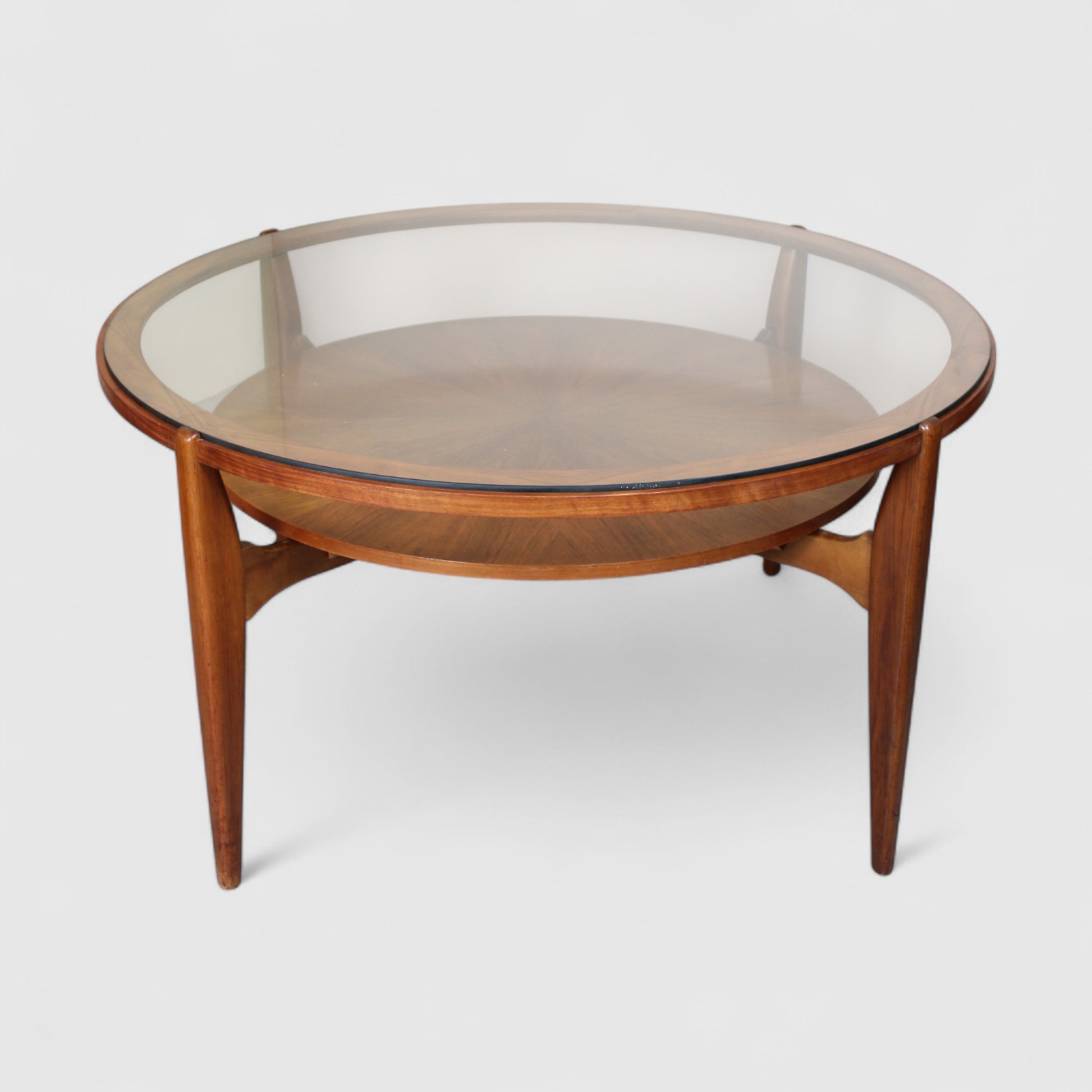 Ronde salontafel met glazen blad uit de jaren '60. Deze vintage salontafel is gemaakt van hout en een echte eyecatcher voor je interieur. Hij is tijdloos vormgegeven en in goede vintage staat.