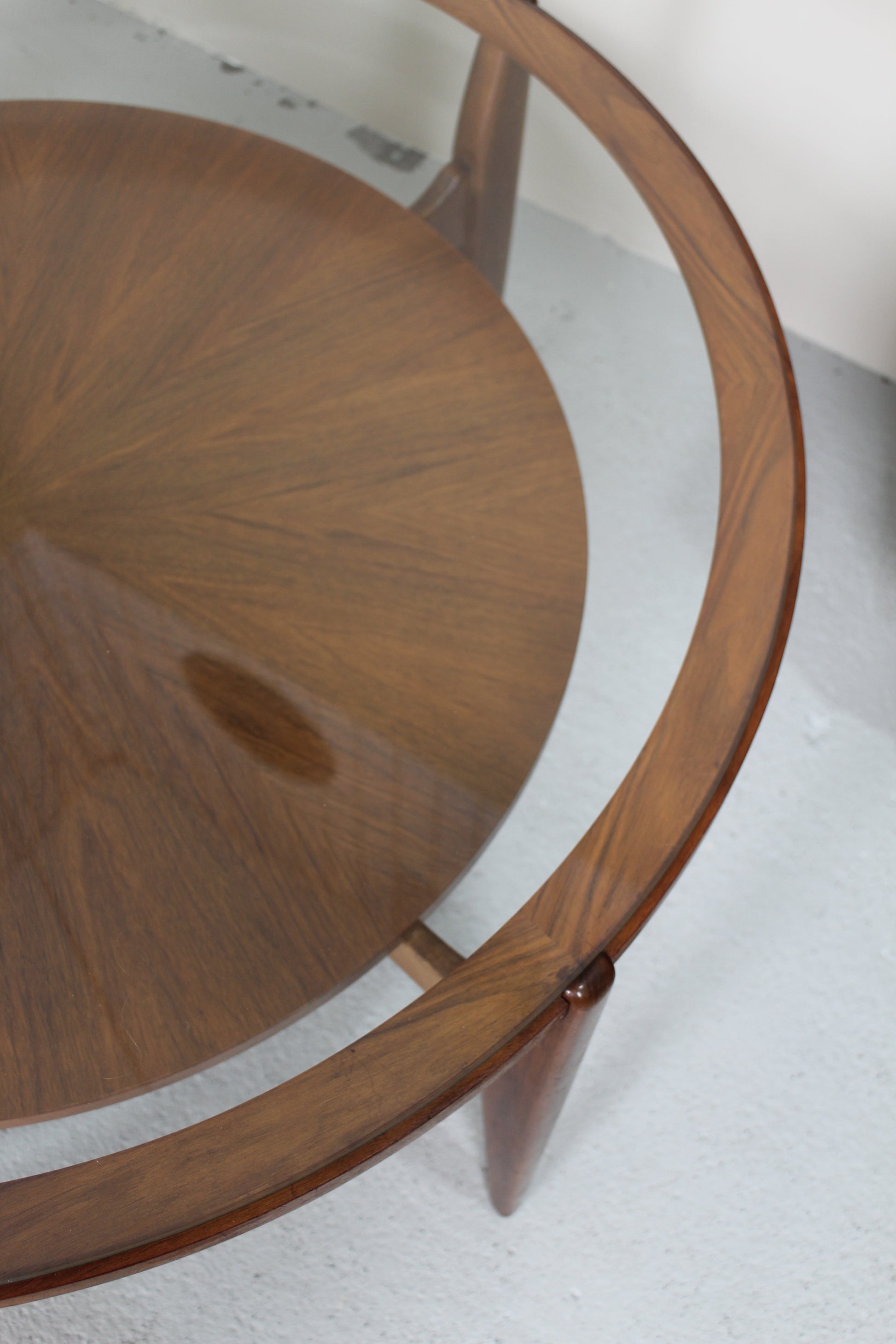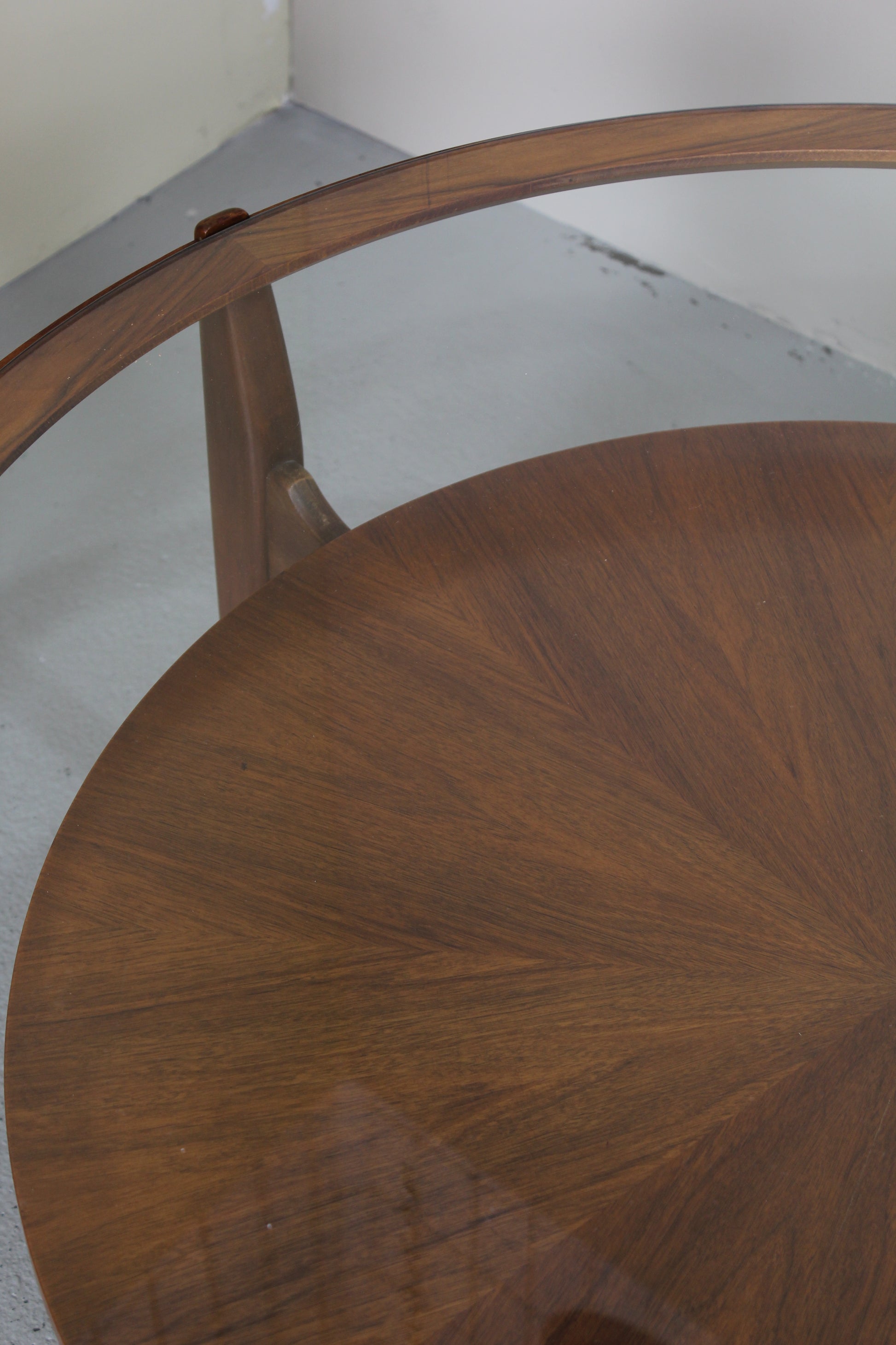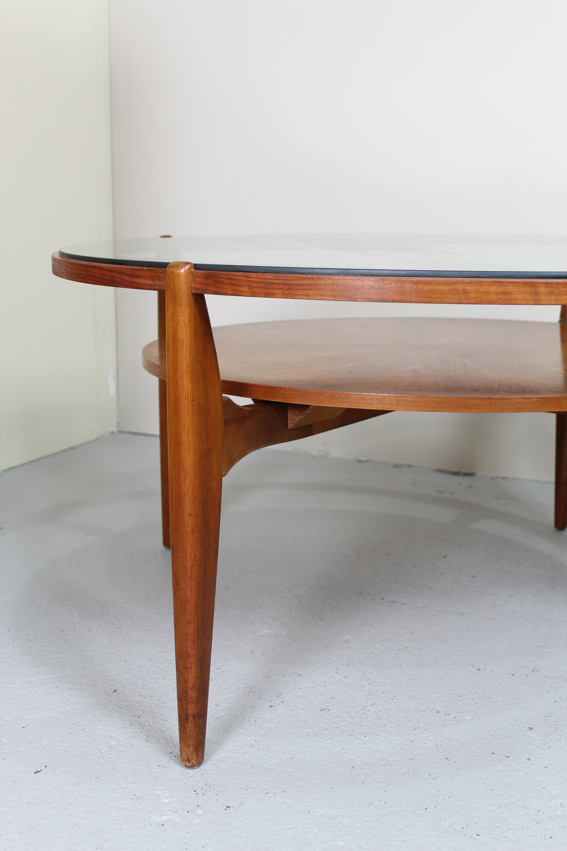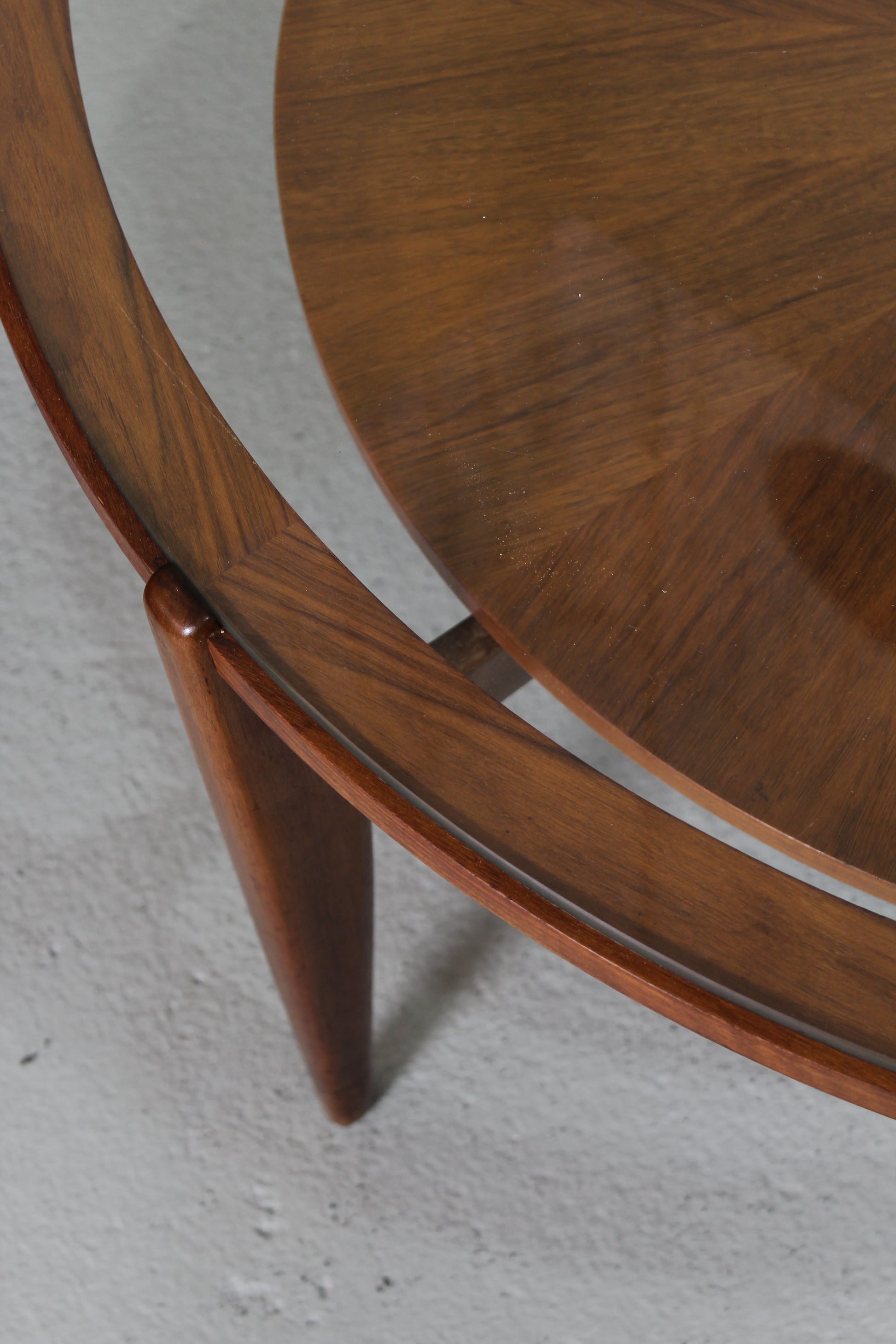 Ronde salontafel met glazen blad uit de jaren '60. Deze vintage salontafel is gemaakt van hout en een echte eyecatcher voor je interieur. Hij is tijdloos vormgegeven en in goede vintage staat.