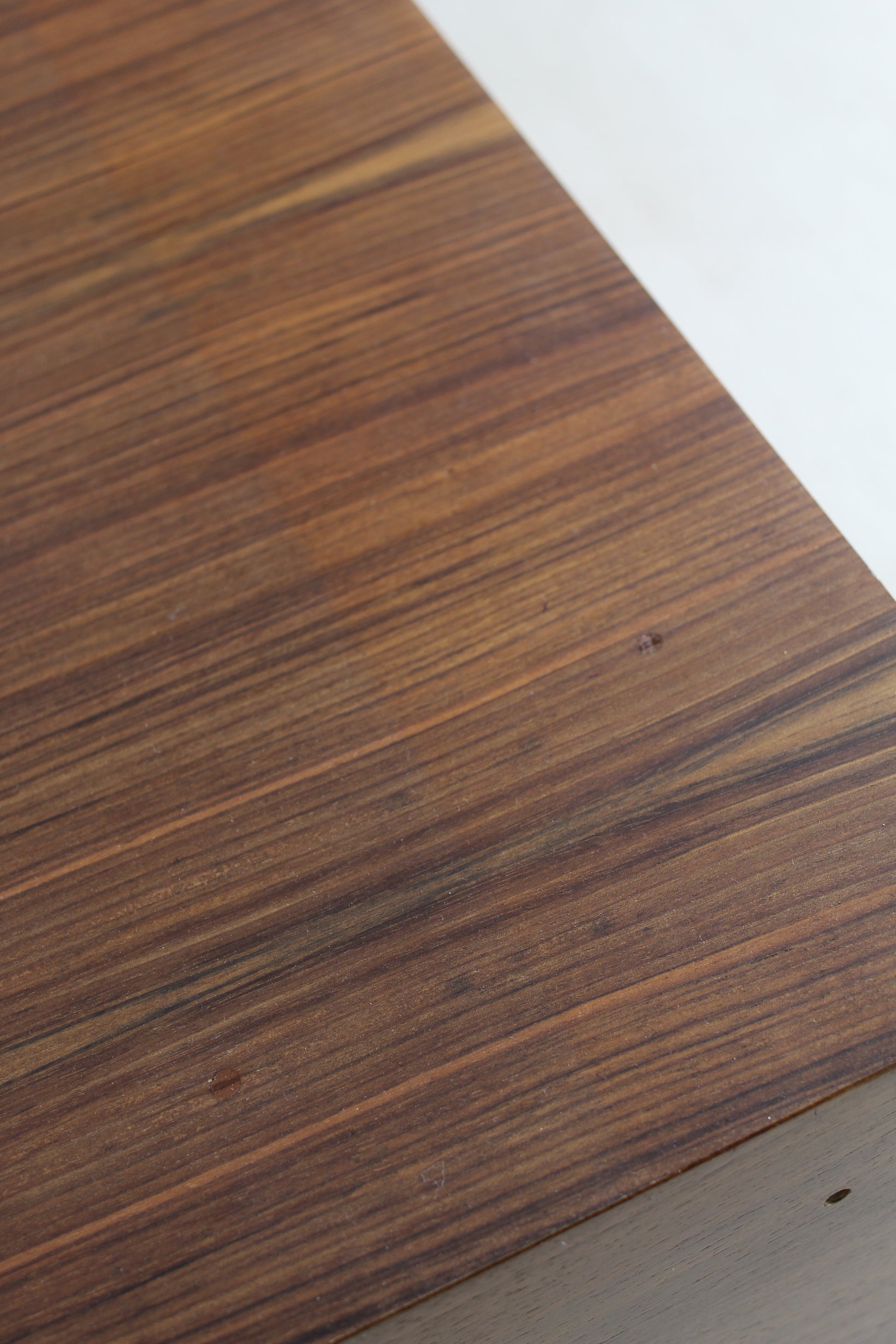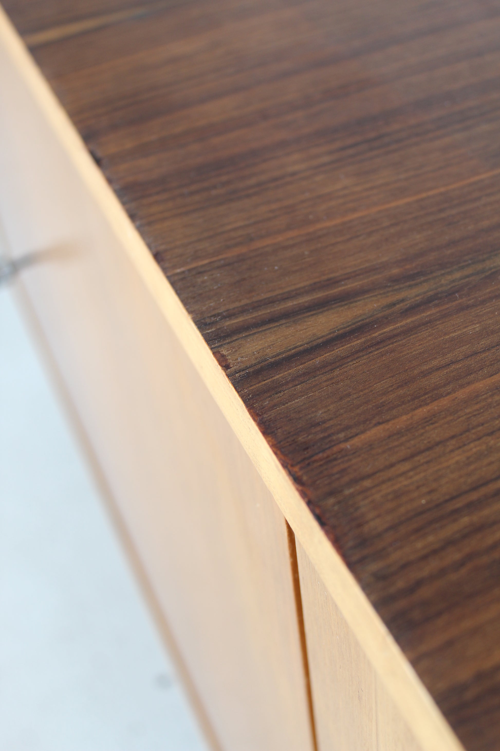 Mid century sideboard of dressoir van het bekende Duitse merk Musterring. Gemaakt in de jaren ‘60 en voorzien van zwarte metalen poten en teakfineer. De drie deuren kun je afsluiten met een sleutel. De legplank is uitneembaar.
