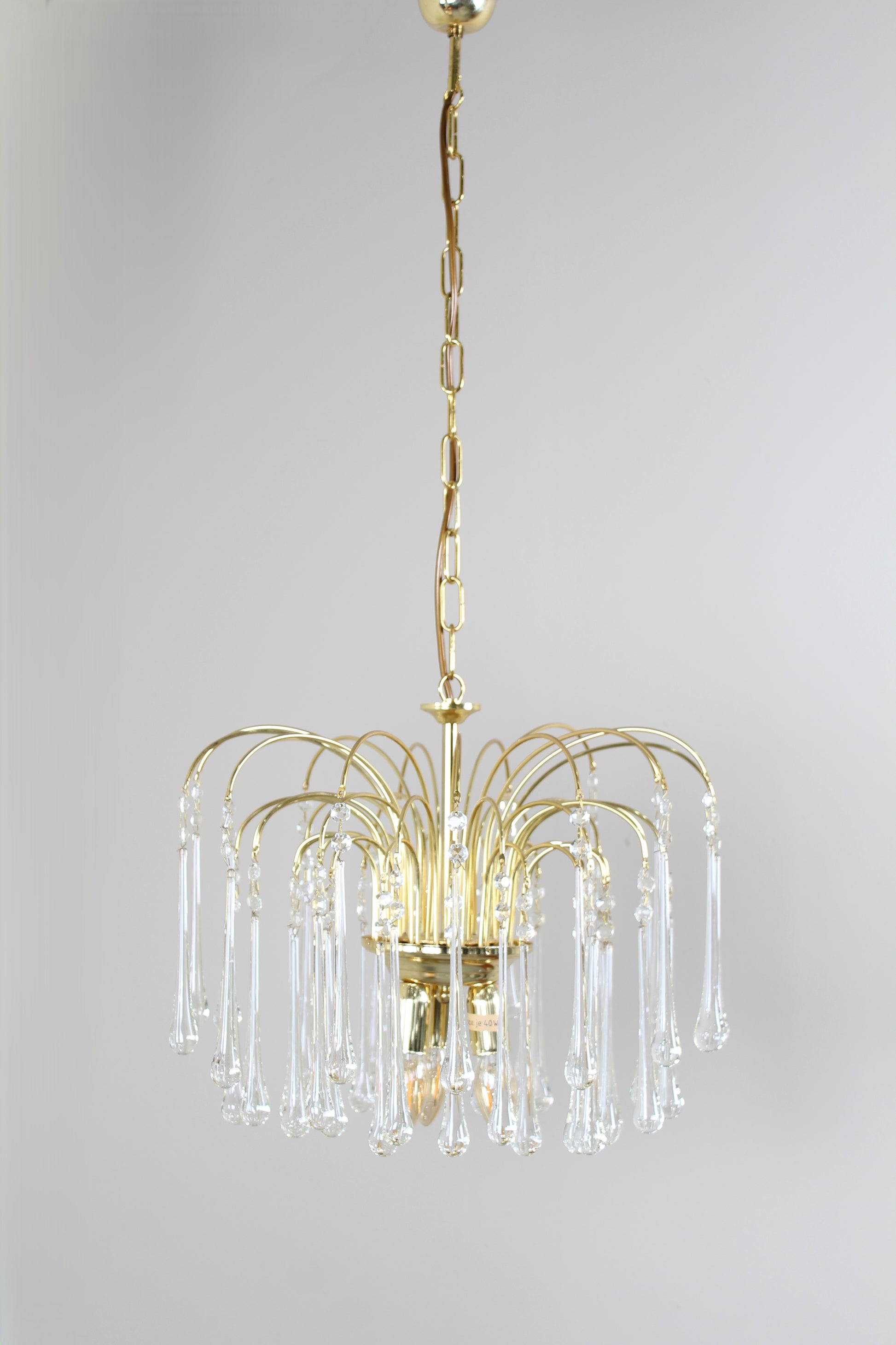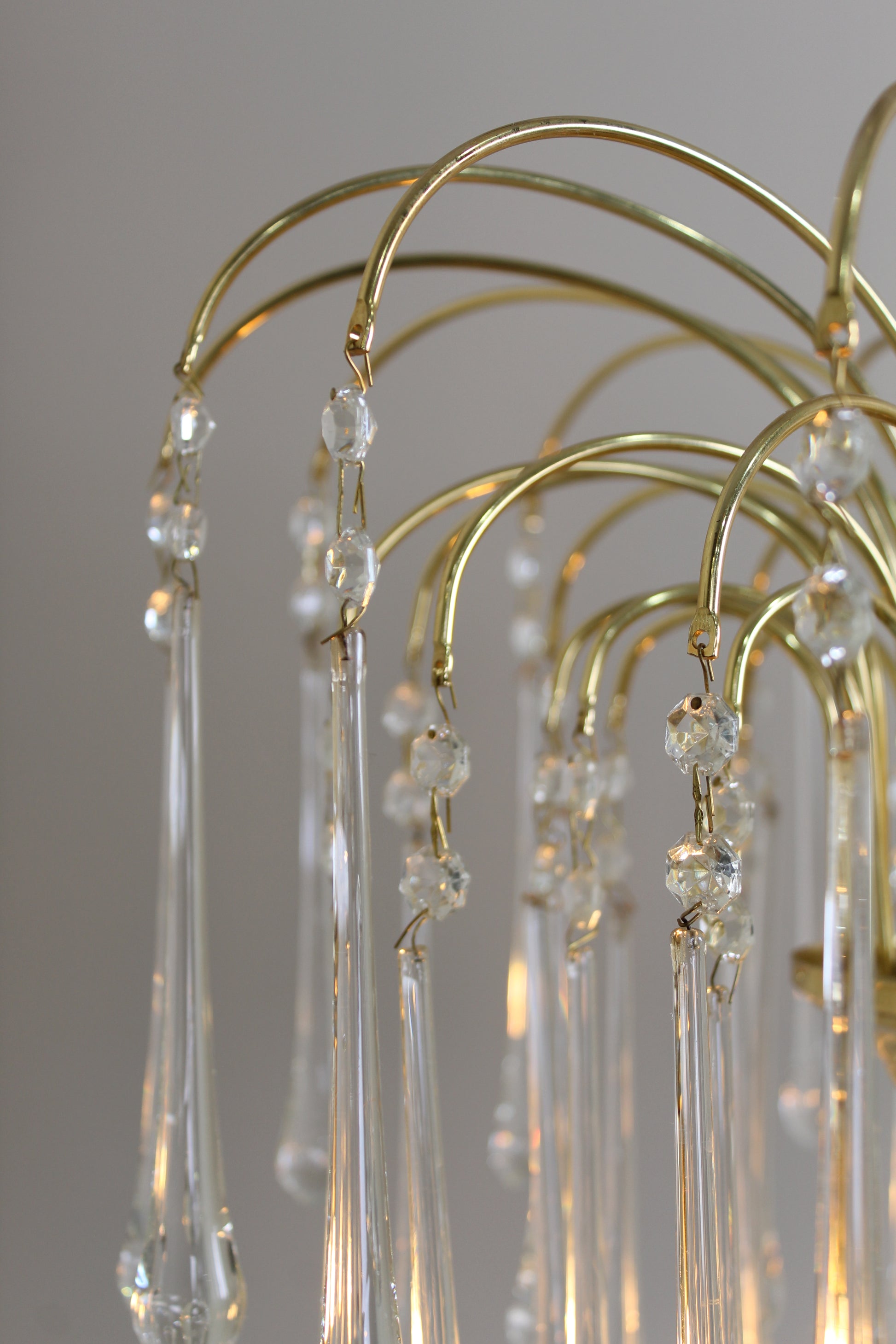 Teardroplamp of kroonluchter uit de jaren '70. Hij is gemaakt van messing met transparante Muranoglas (Italië) druppels.
