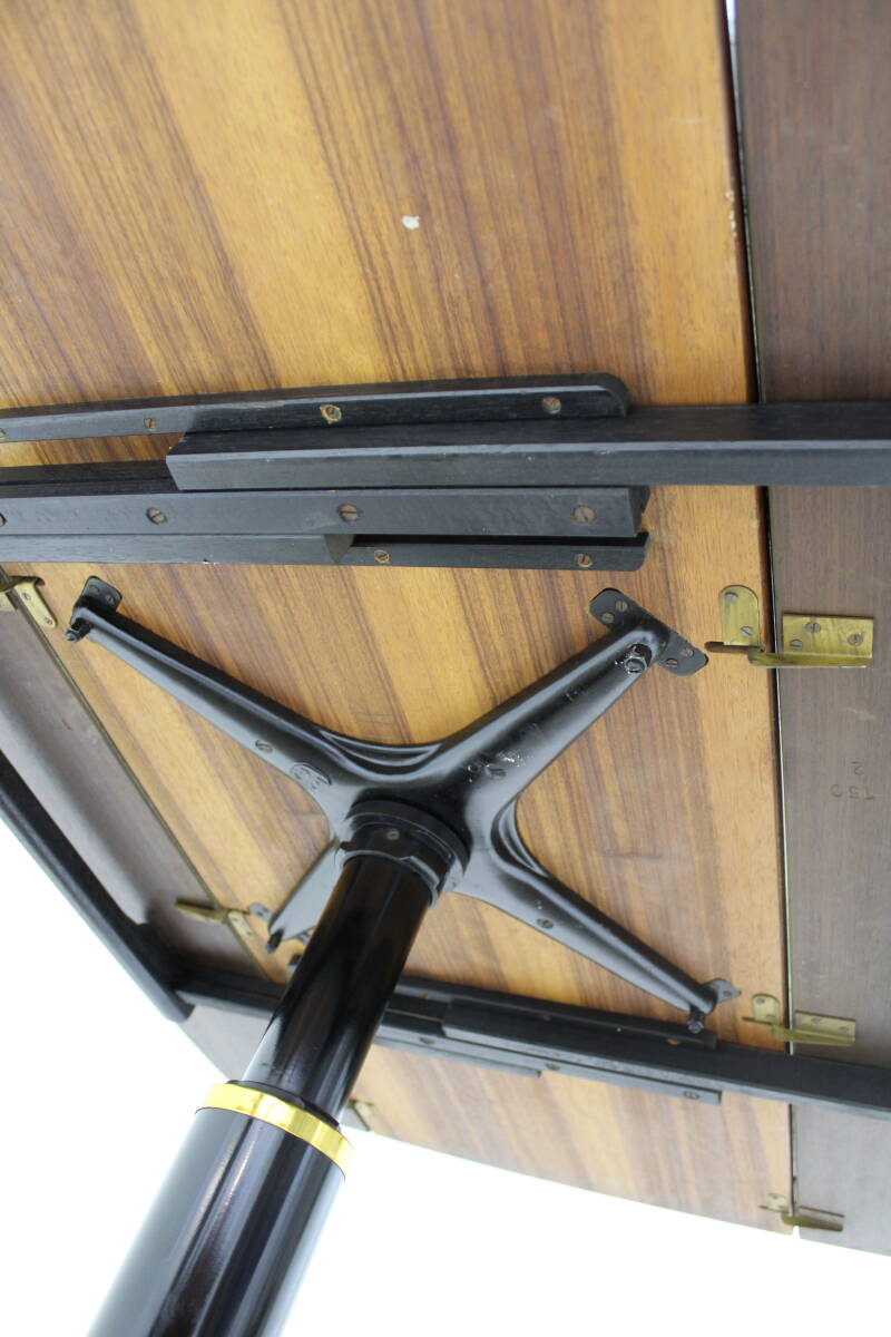 Brits design uitklapbare ovale of tonvormige eettafel uit de jaren '50. Te gebruiken in drie formaten. Hij past hierdoor ook goed tegen een muur. Deze G-plan tafel is van de serie Librenza en is afgewerkt met en fantastische voet met messing afwerking en verkeert in top staat. Aan de onderkant van het blad zit een frame die je kunt uitschuiven waarom het blad rust. We hebben 6 bijpassende G-plan eetkamerstoelen op voorraad.