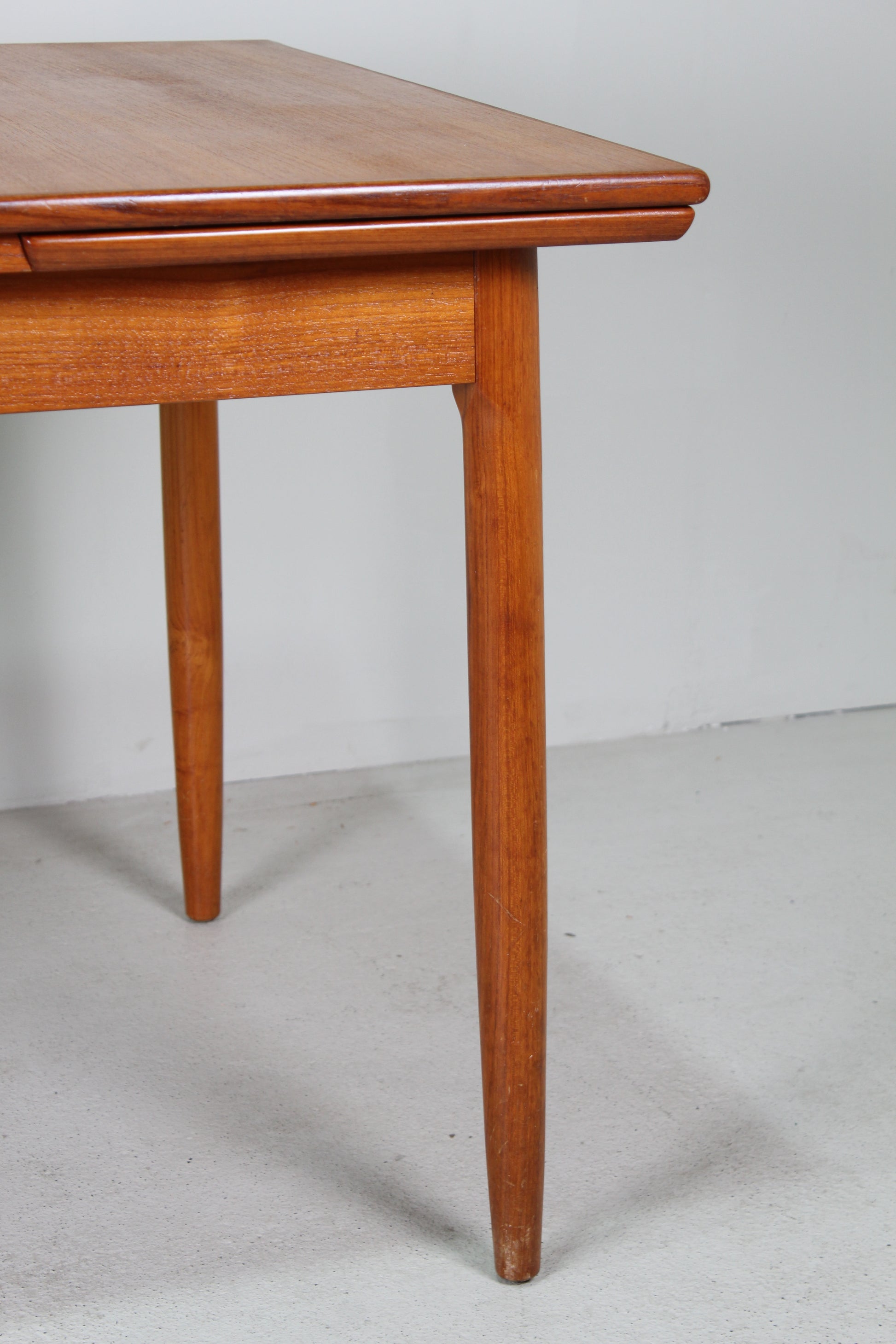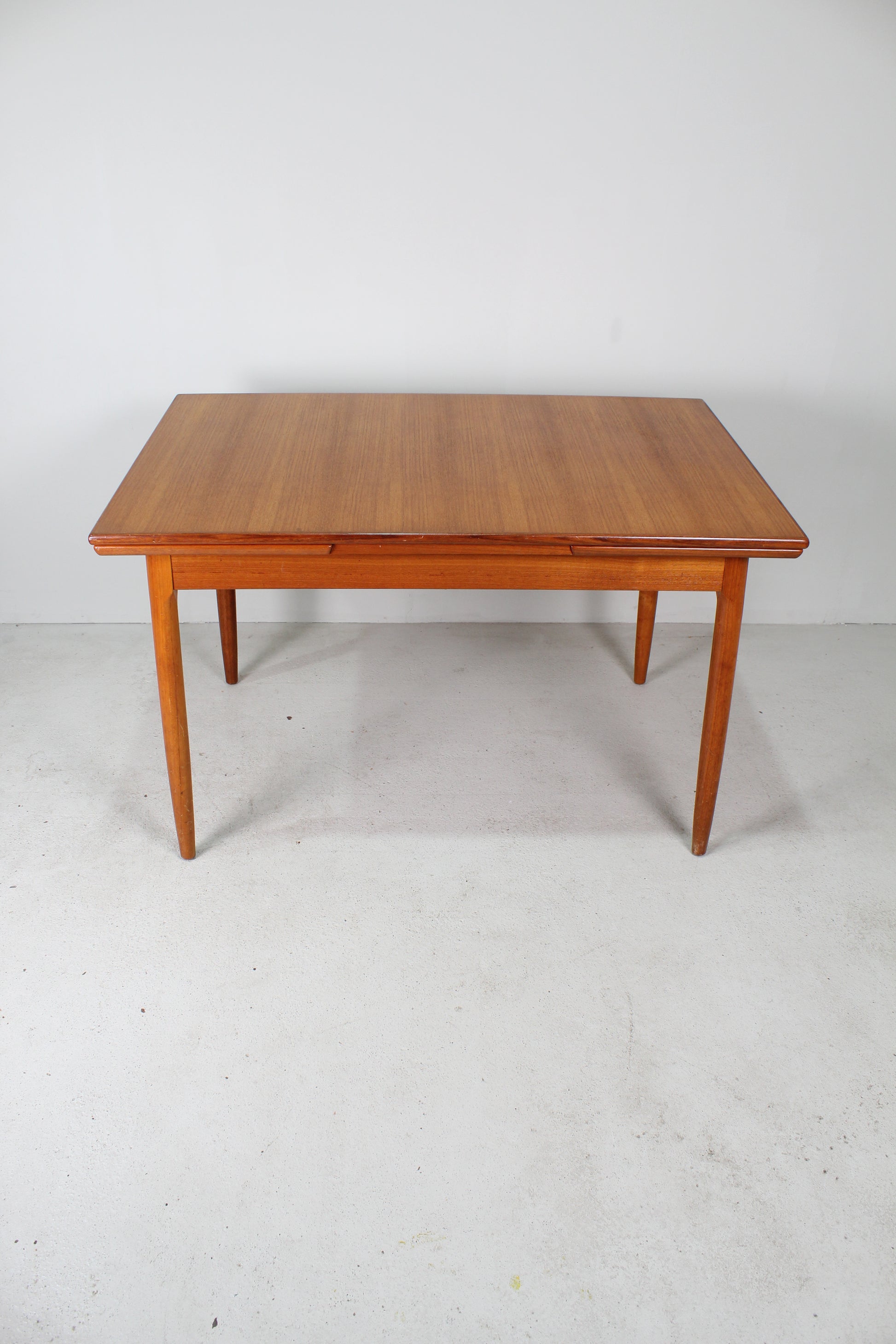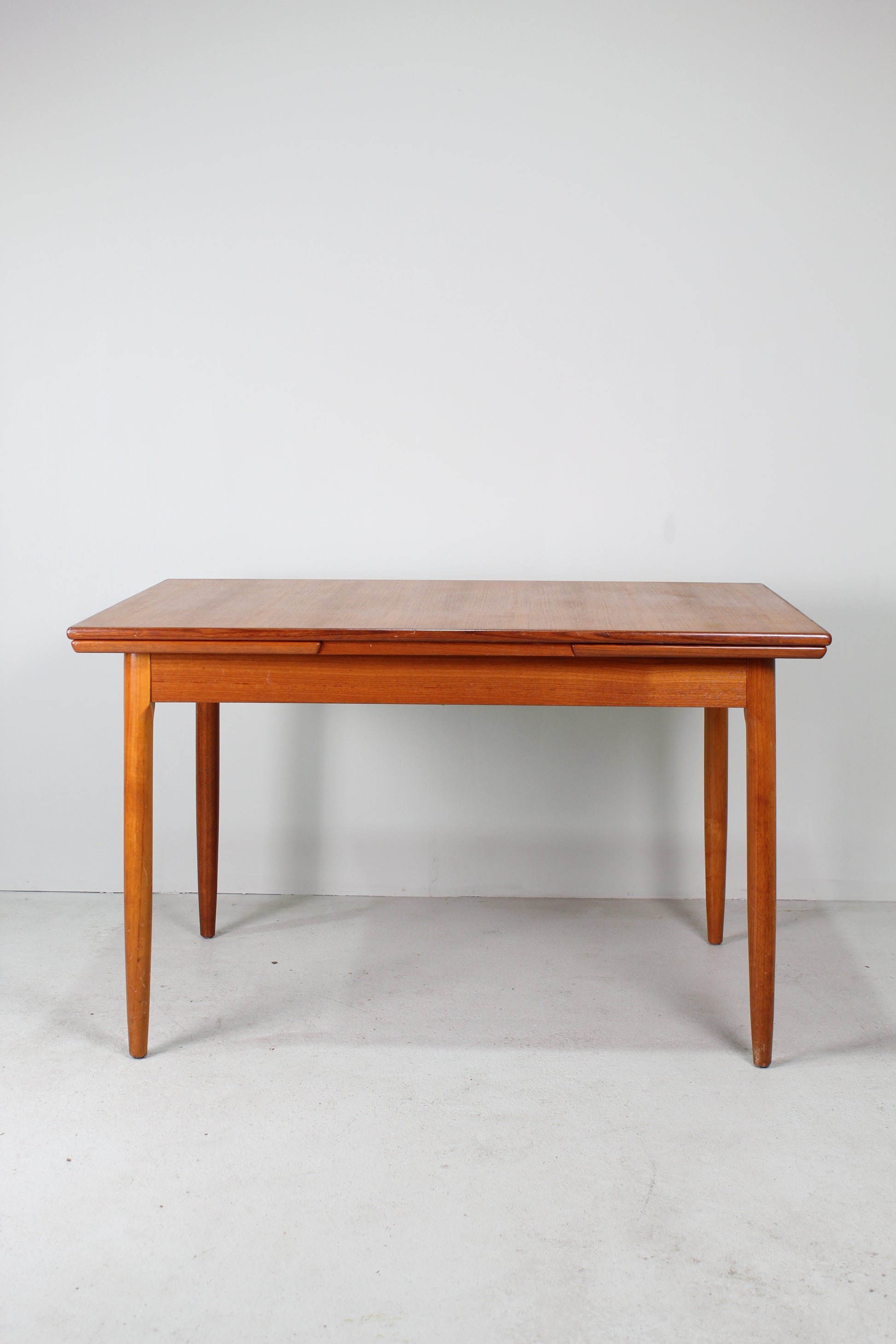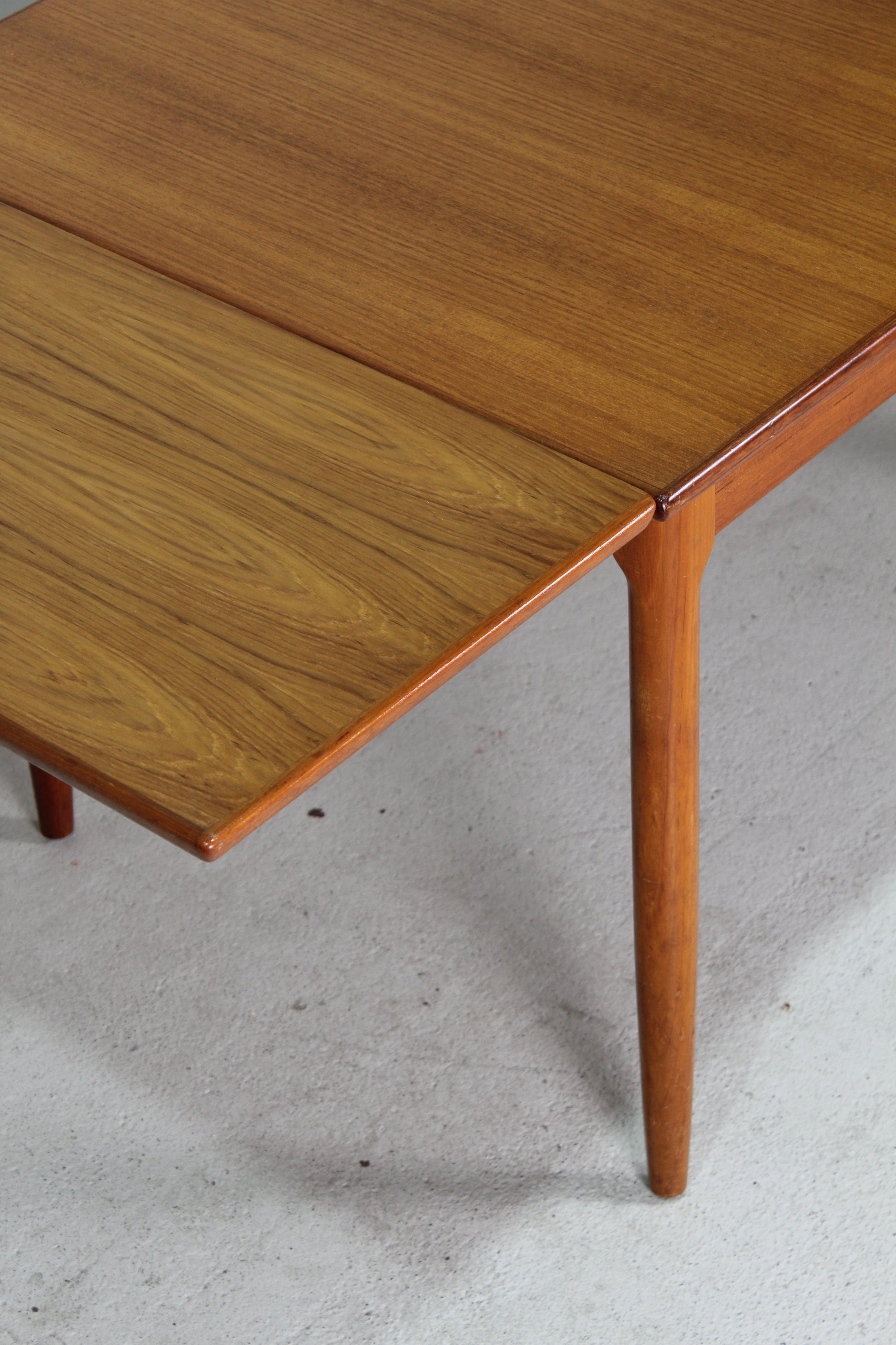 Deze teakhouten uitschuifbare eettafel komt uit de jaren '60 en is van zeer mooie kwaliteit. Hij is zeer waarschijnlijk in Nederland gemaakt. Ingeschoven is het een rechthoekige vintage tafel, geschikt voor zo'n vier personen. De uitschuifbare bladen kun je eenvoudig uitschuiven en zorgt voor heel wat extra ruimte. Ideaal als je visite over de vloer krijgt. Op deze manier kunnen er minimaal zes personen aan tafel.
